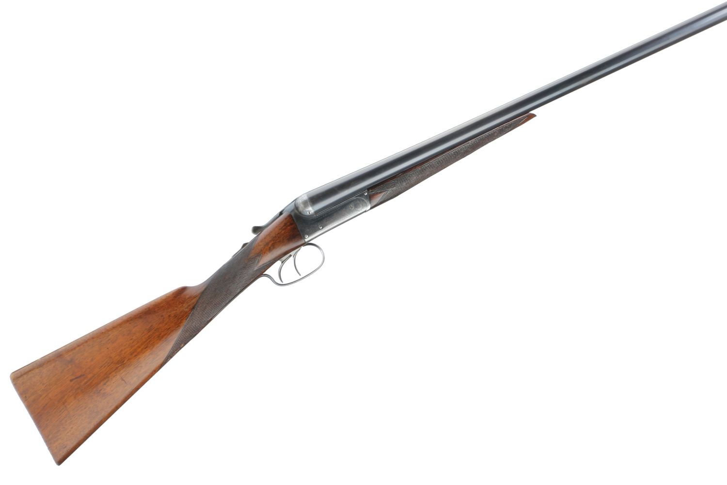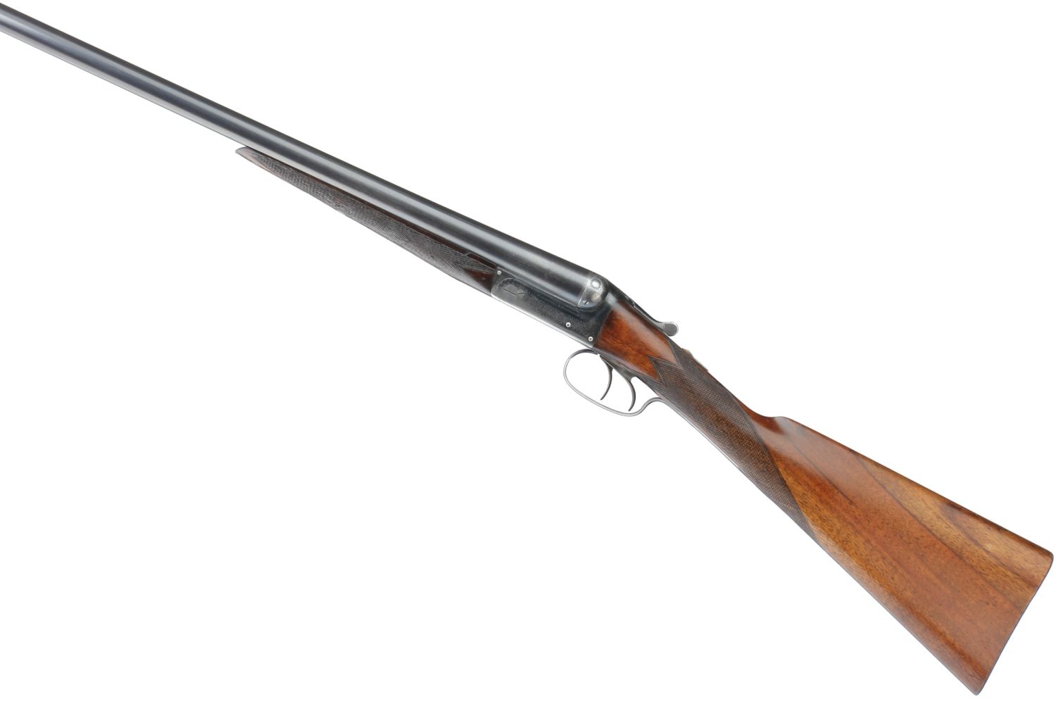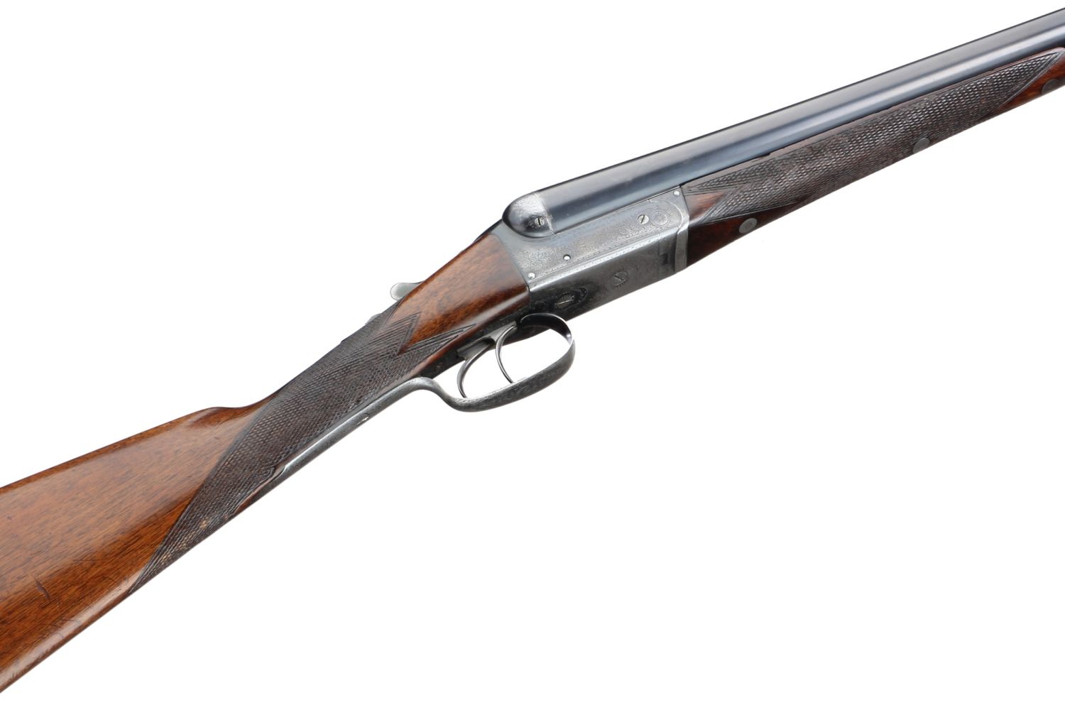 A side-by-side, break-action double-barrel shotgun. The barrels are constructed of blued steel, and the receiver and trigger guard are of a brighter, likely case-hardened steel. The dark wood furniture, possibly walnut, features checkered panels on the stock and forend for grip. The receiver and side plates are adorned with intricate scroll engraving. No manufacturer’s markings, model names, or serial numbers are discernible.