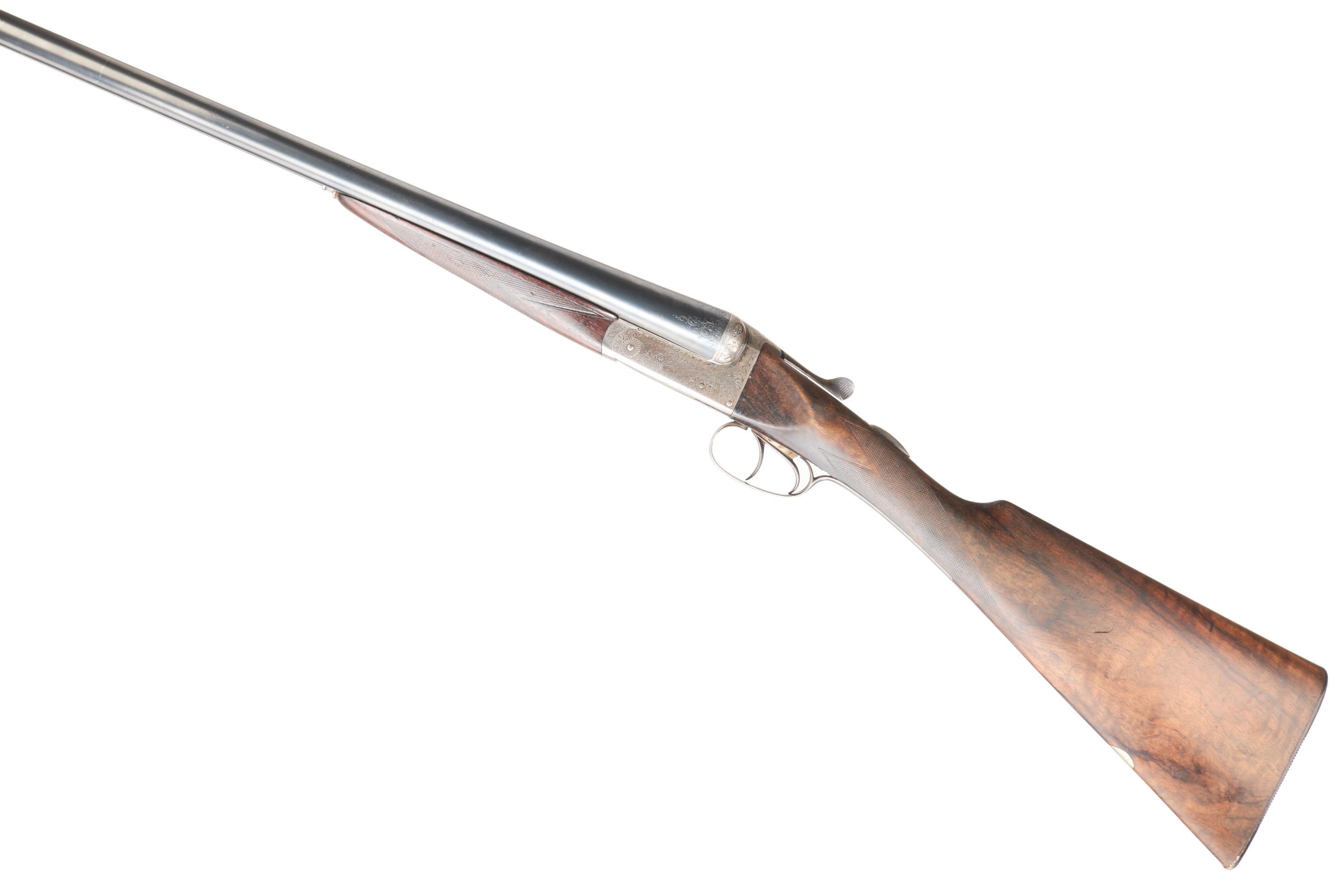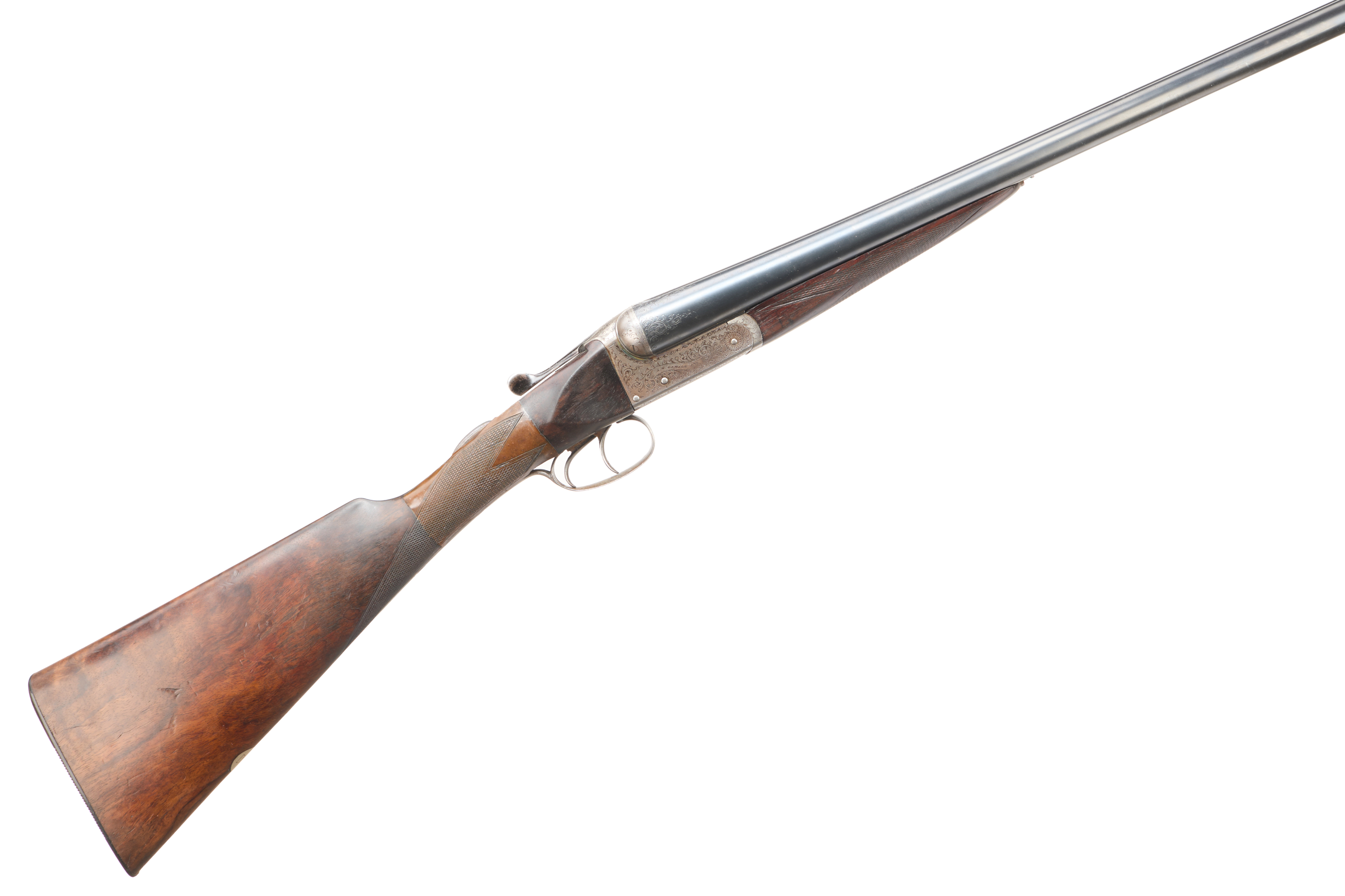 A traditional side-by-side double-barreled shotgun, likely dating from the late 19th or early 20th century. It features blued steel barrels, an engraved steel action with scrollwork decoration, and a checkered wooden stock and fore-end. Faint, illegible markings are visible on the barrel rib.
