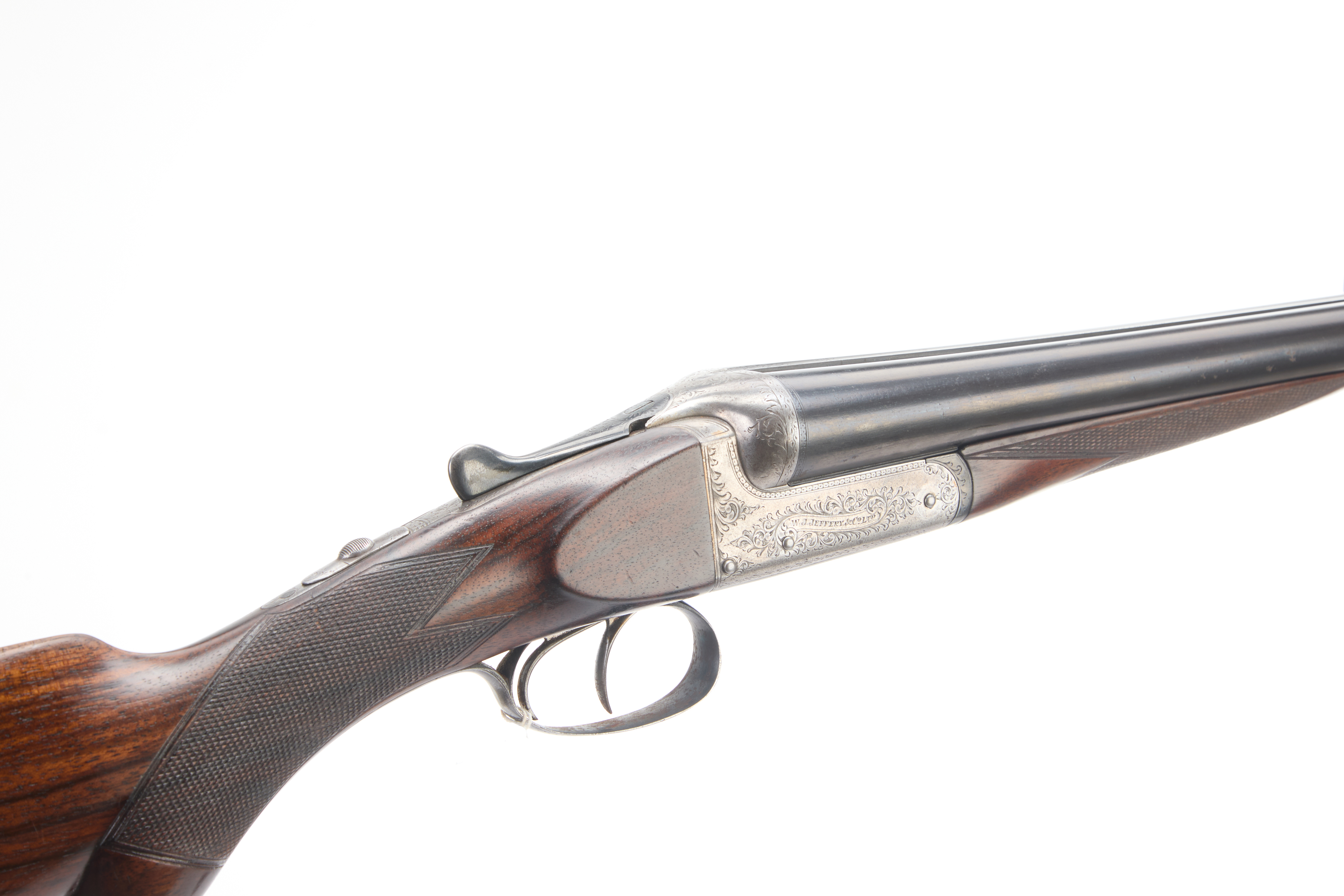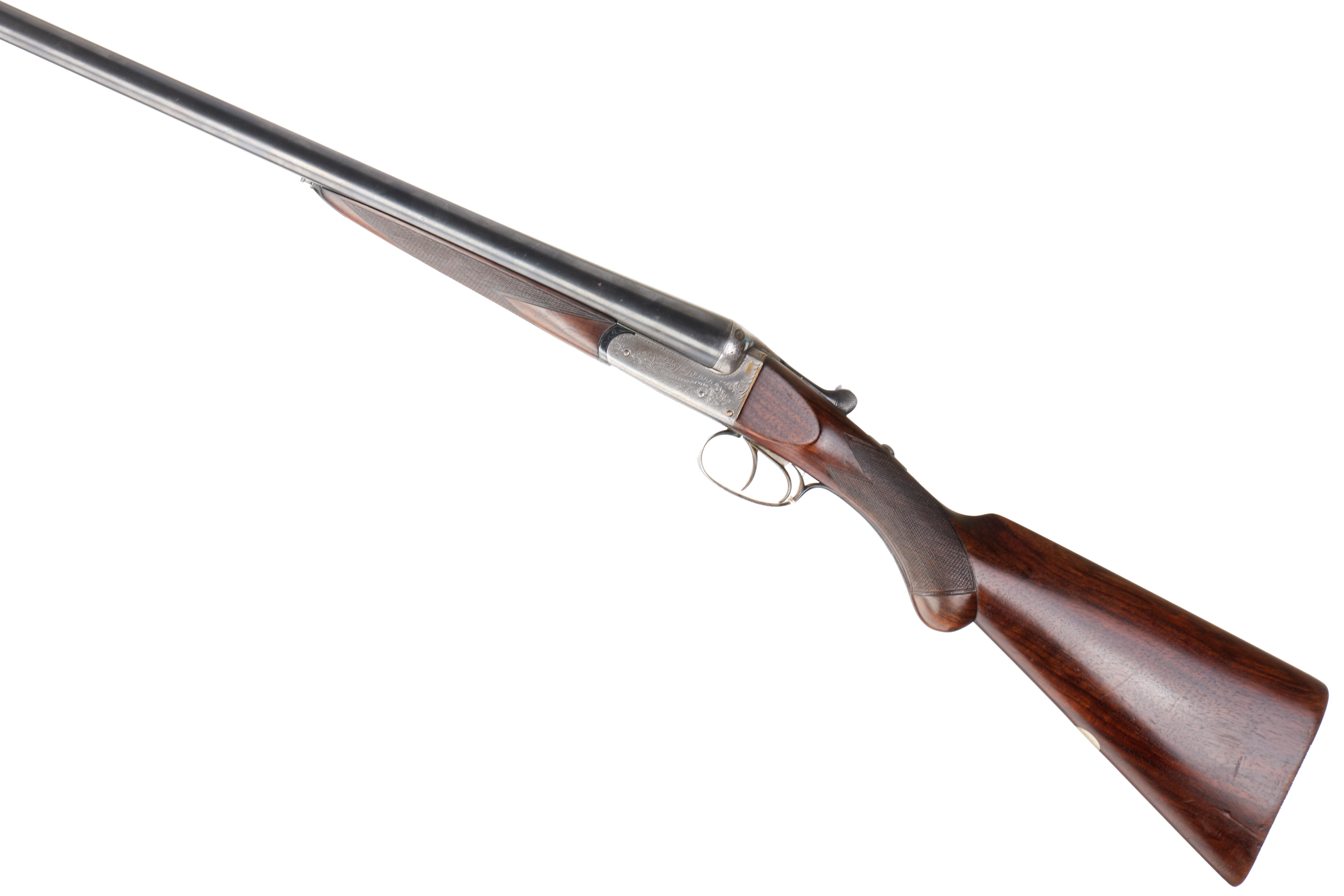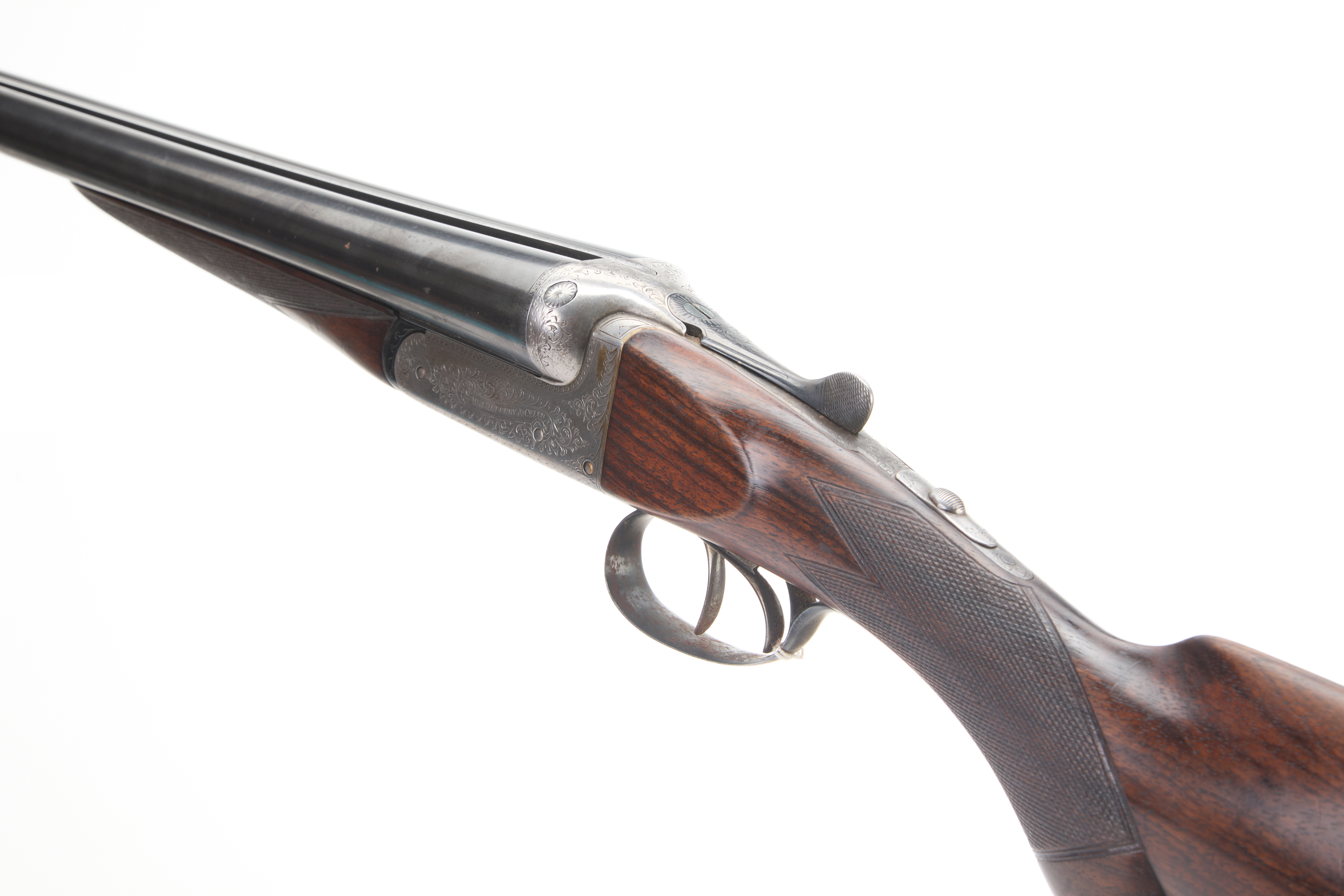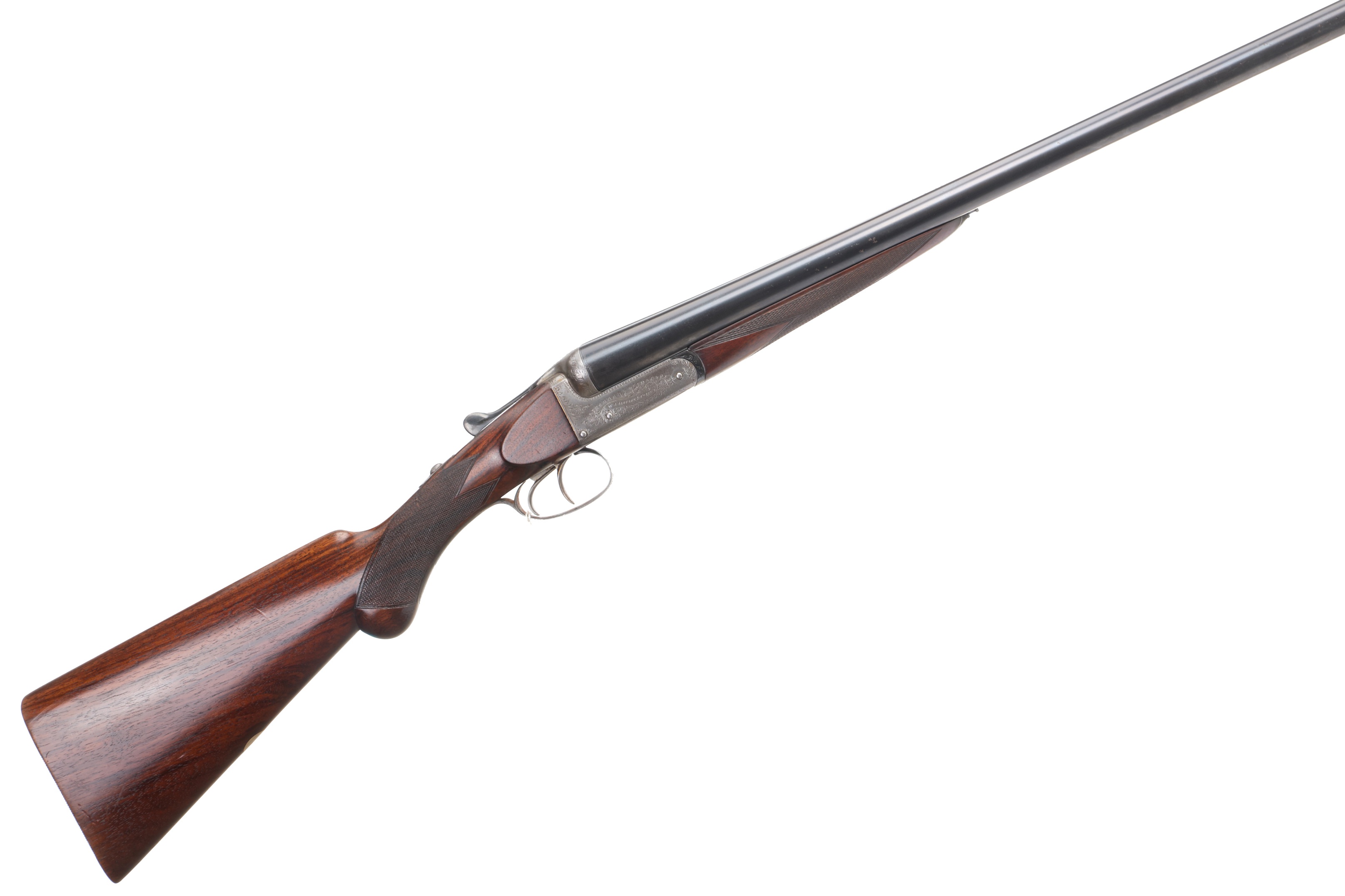 A side-by-side double-barreled shotgun, consistent with early 20th-century style. The firearm features a dark, finely checkered wood stock and fore-end, likely walnut, and blued steel barrels. The metal receiver is adorned with extensive scroll engraving. Partial text, appearing to include “H. E. L. & Co.”, is visible on the left side of the receiver. The trigger guard and triggers are also constructed of metal.