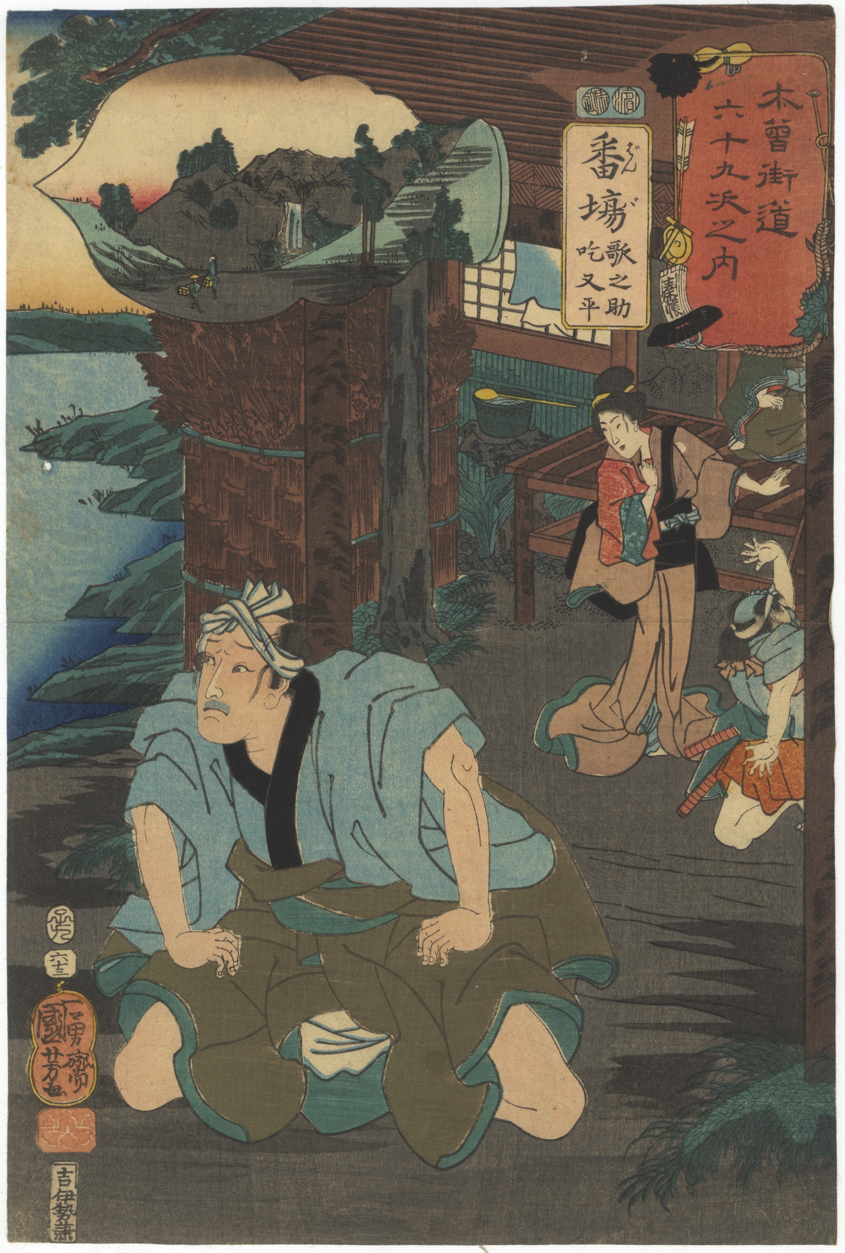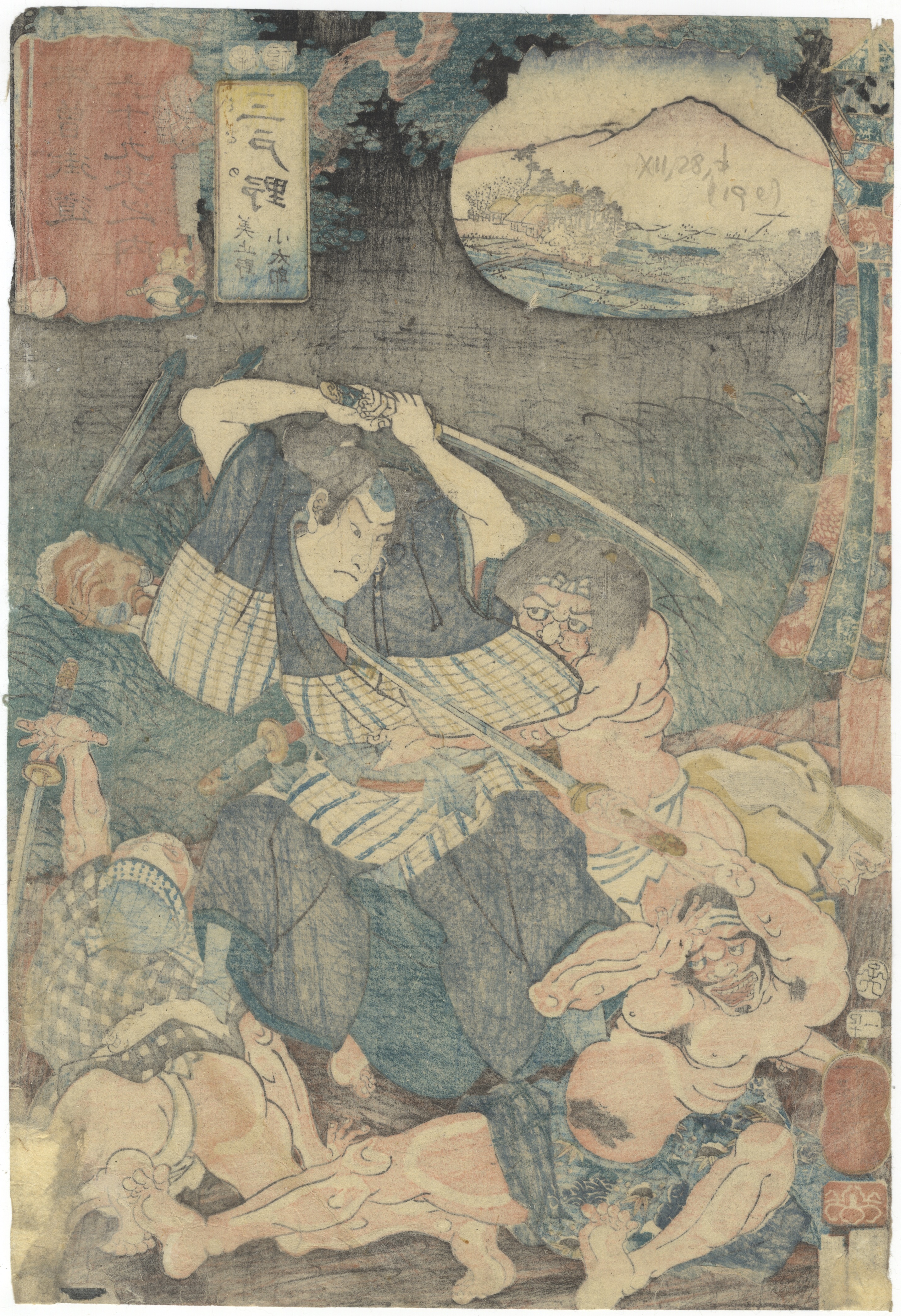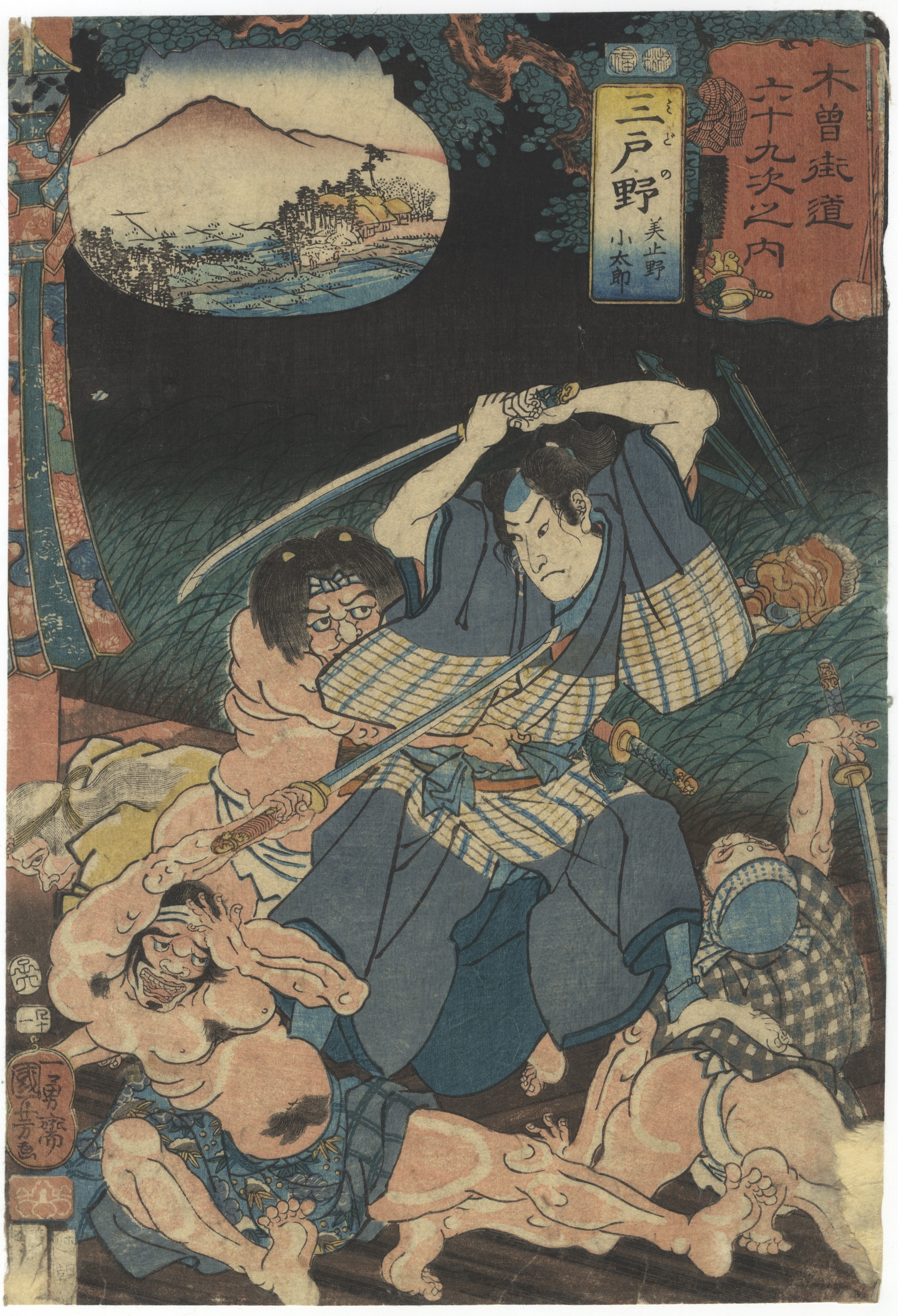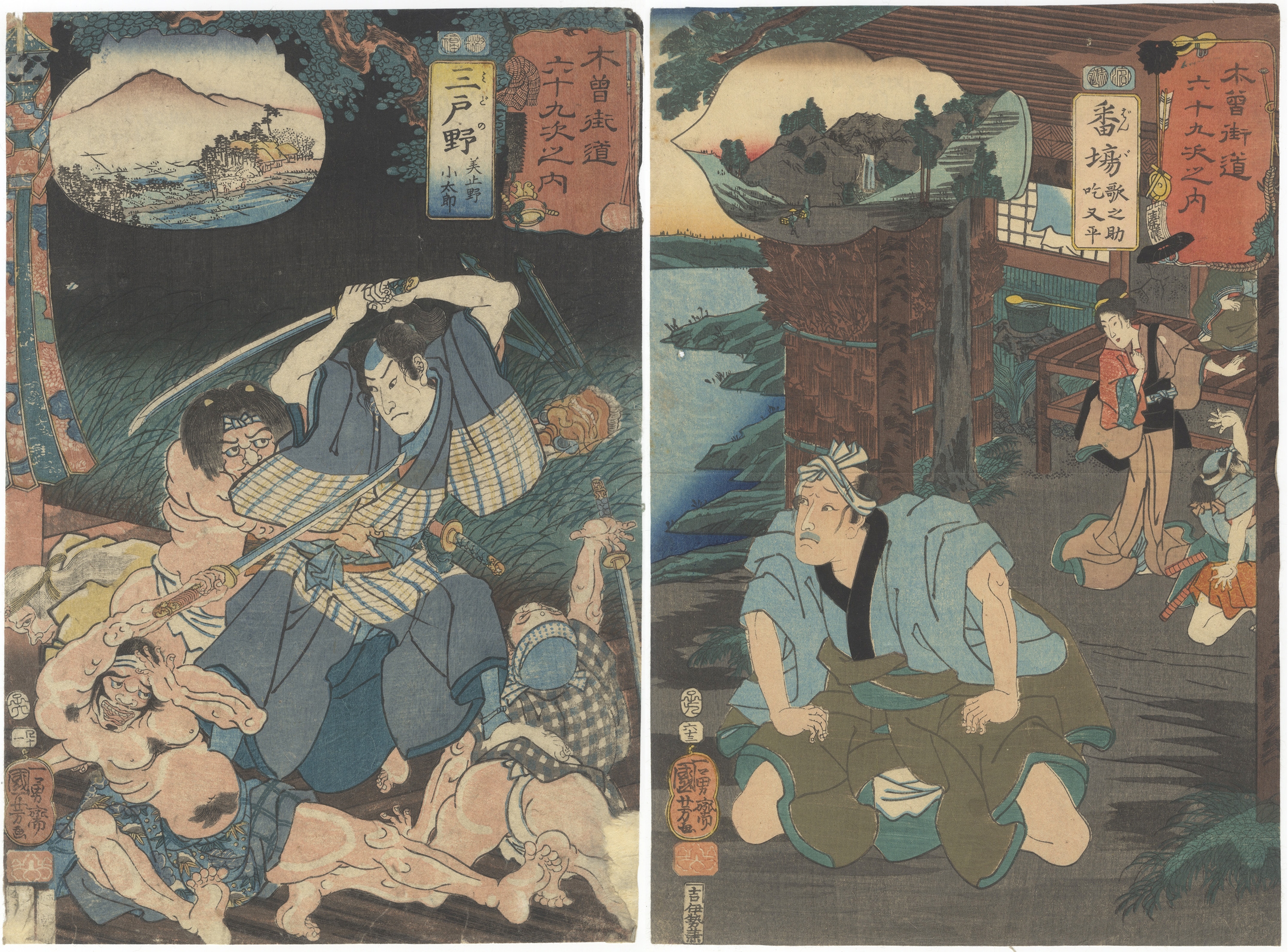 A pair of Japanese ukiyo-e woodblock prints on paper, characteristic of the Edo period. The left print depicts a dynamic battle scene at night, featuring a central samurai figure engaged with multiple combatants. The right print portrays figures in a domestic or roadside setting, with a distant landscape visible. Both prints incorporate an oval or circular cartouche containing a landscape vista. Each print bears multiple Japanese text cartouches in red and yellow hues, along with red seals, likely indicating series title, individual print title, artist, and publisher.