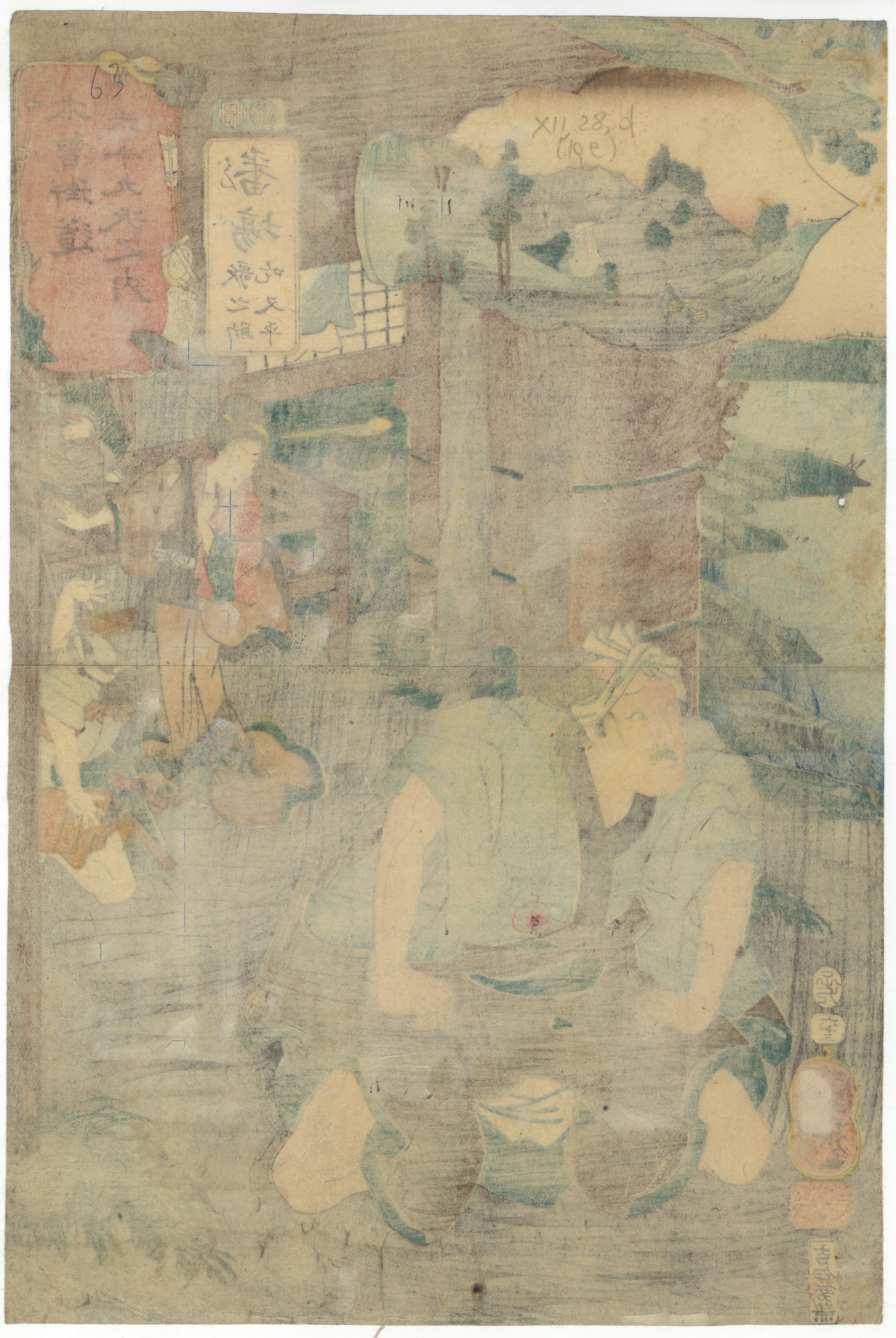 Apparent condition suggests significant age, with noticeable color fading throughout, particularly evident on the verso of the prints. General creasing, smudging, and minor edge wear or small losses are present, consistent with their age and material.