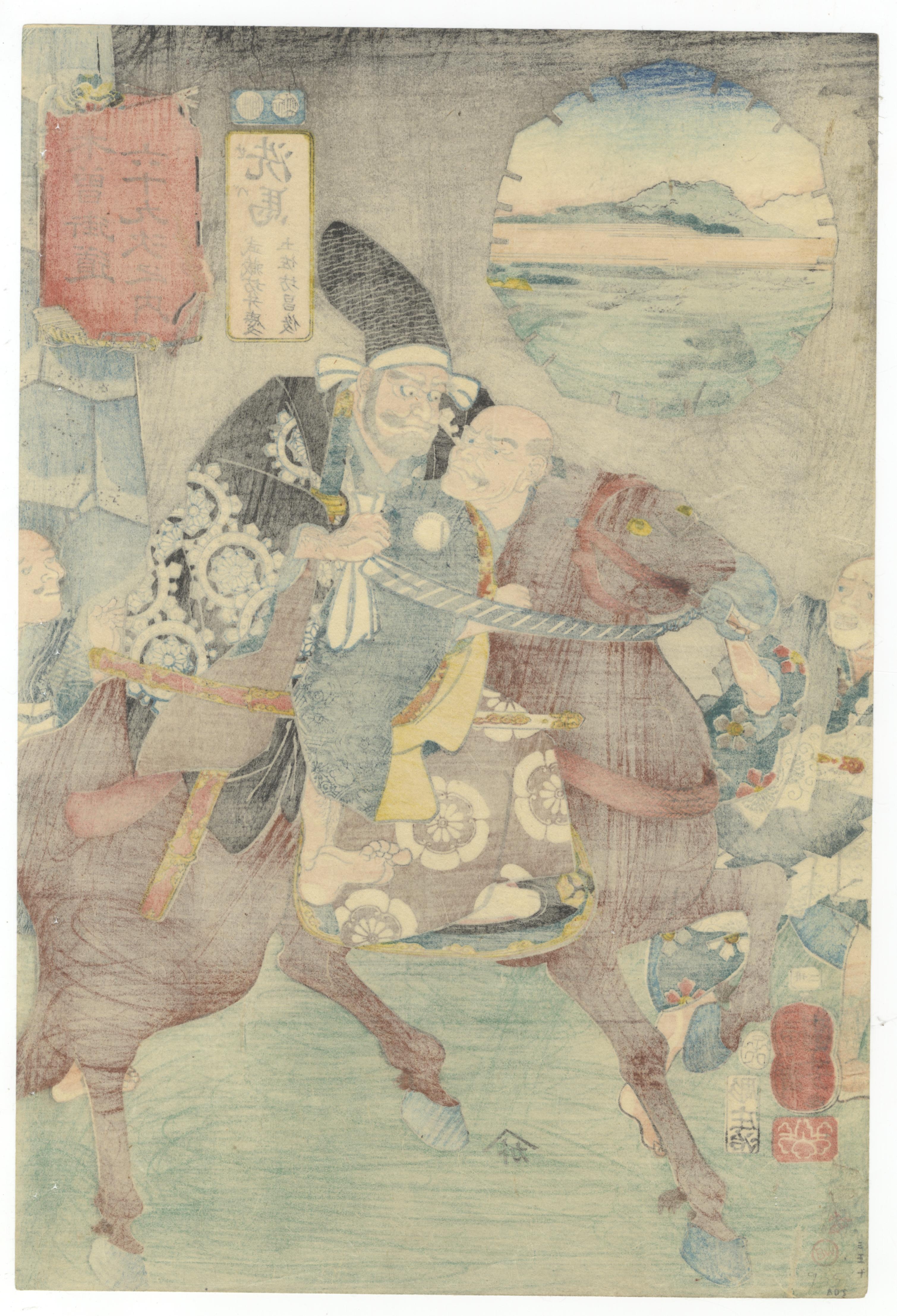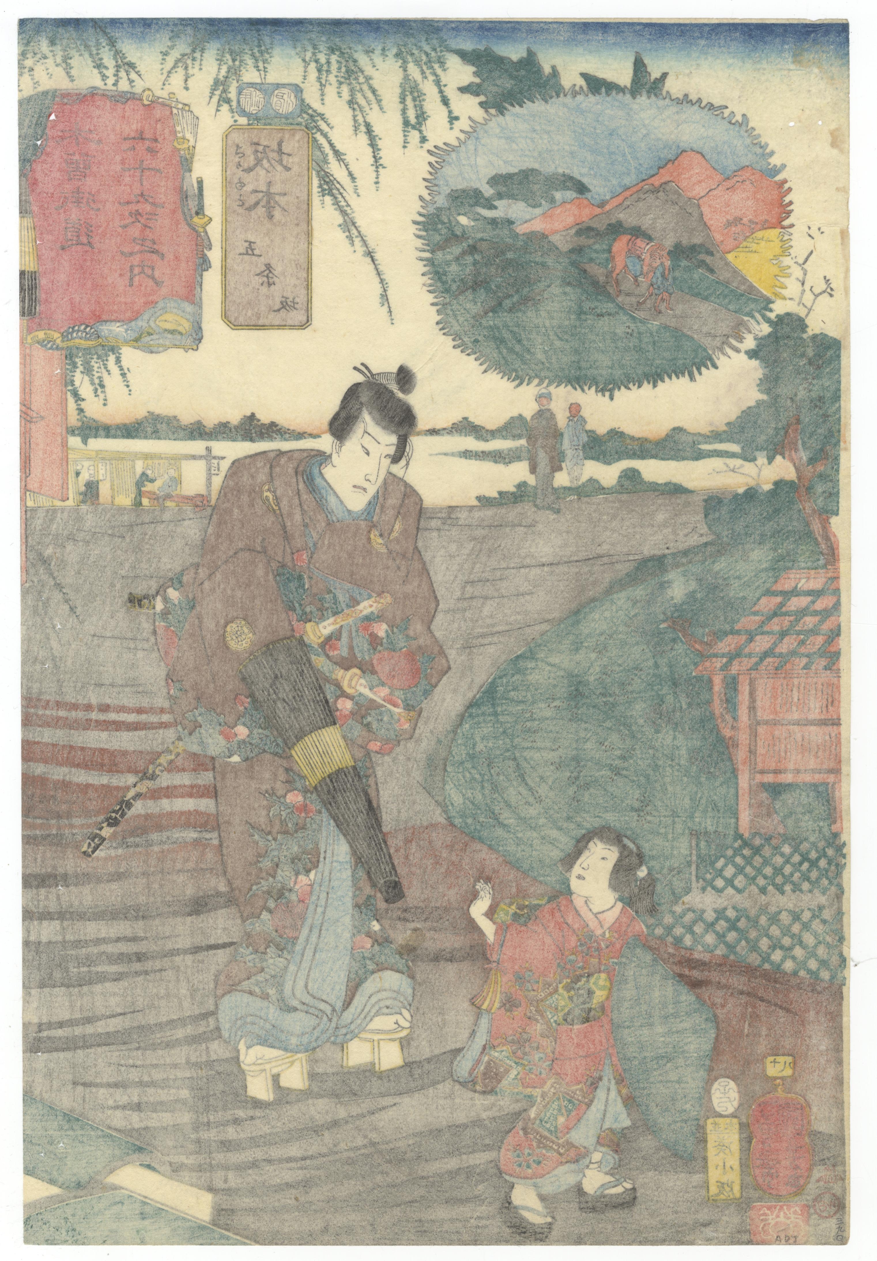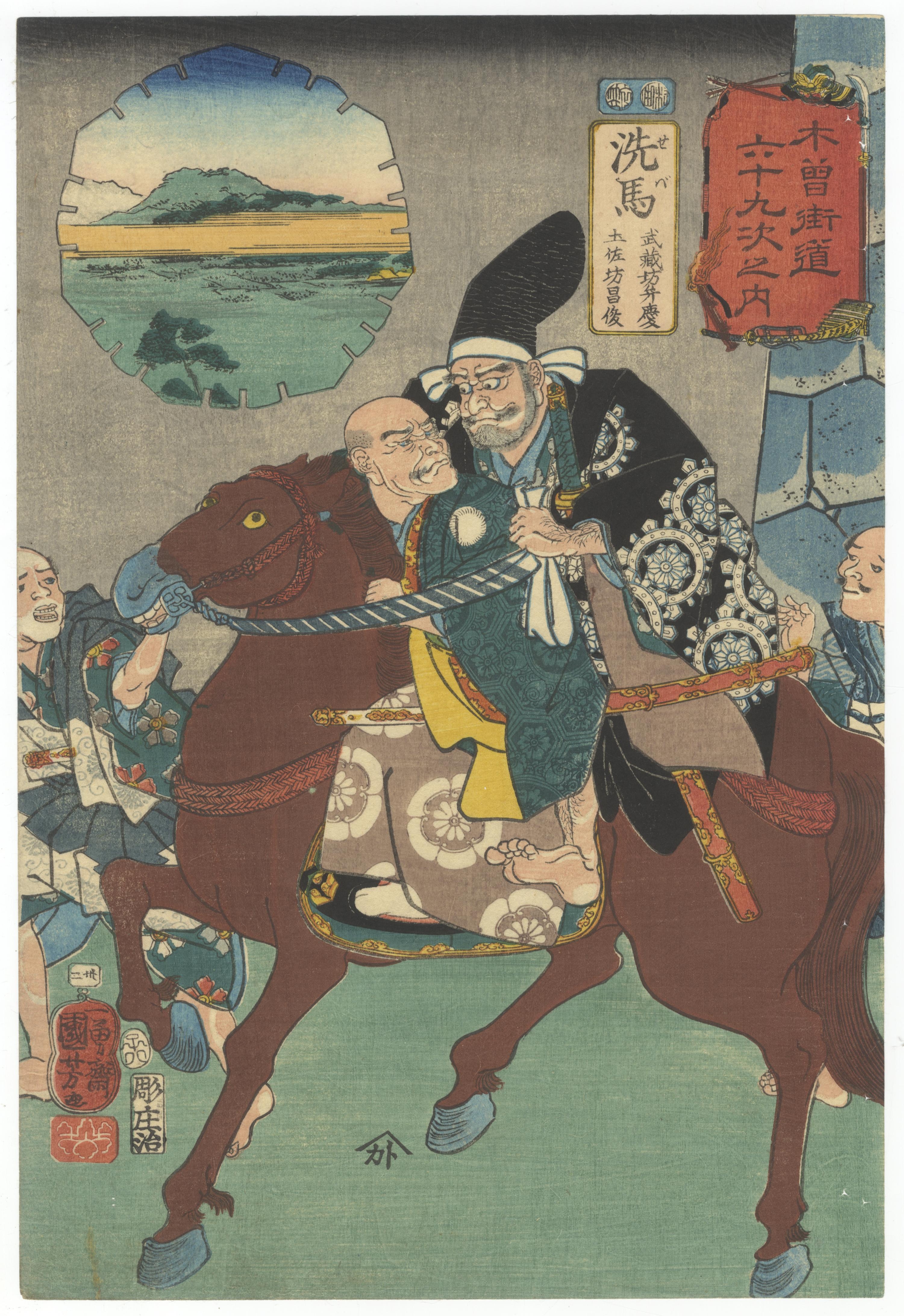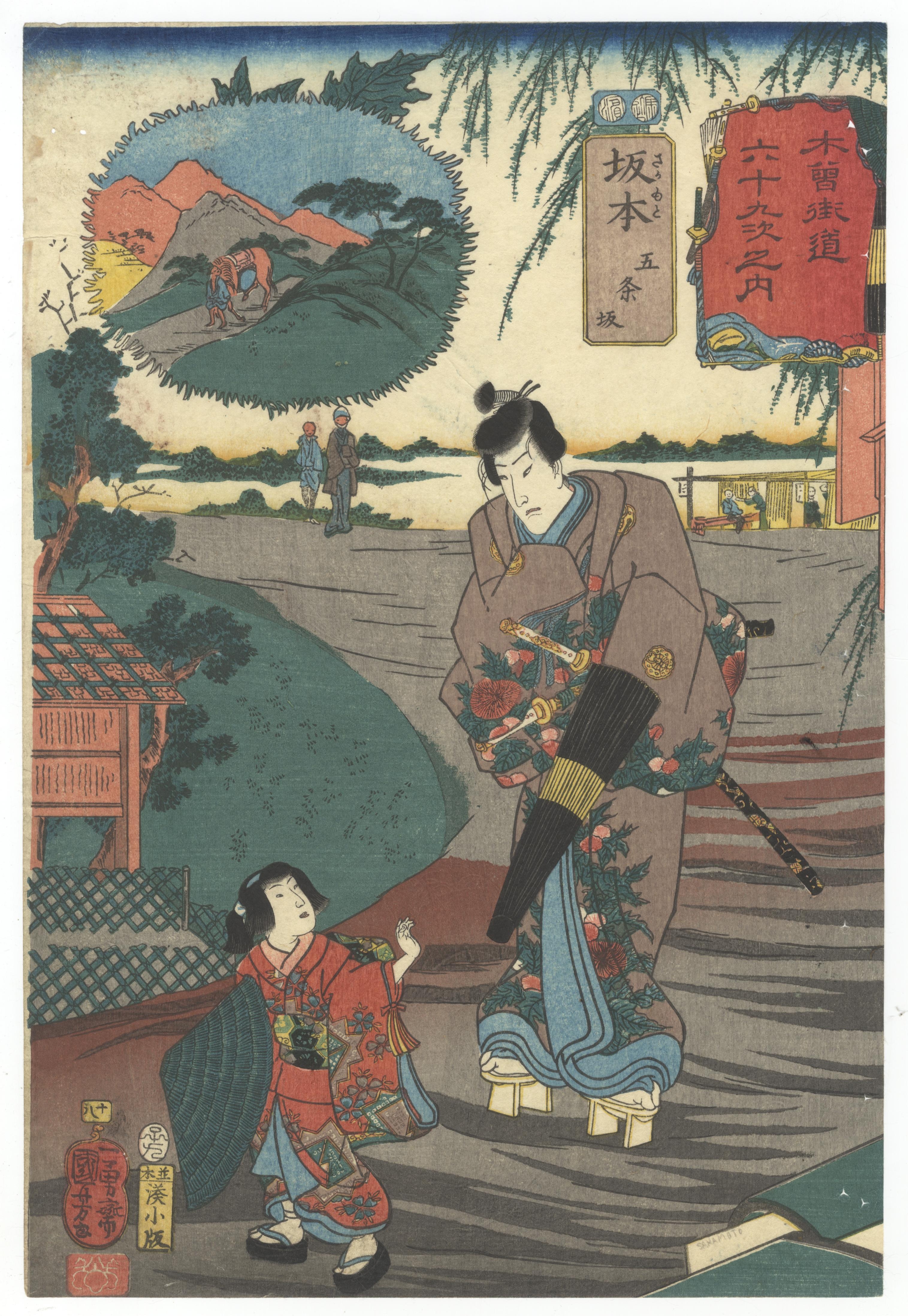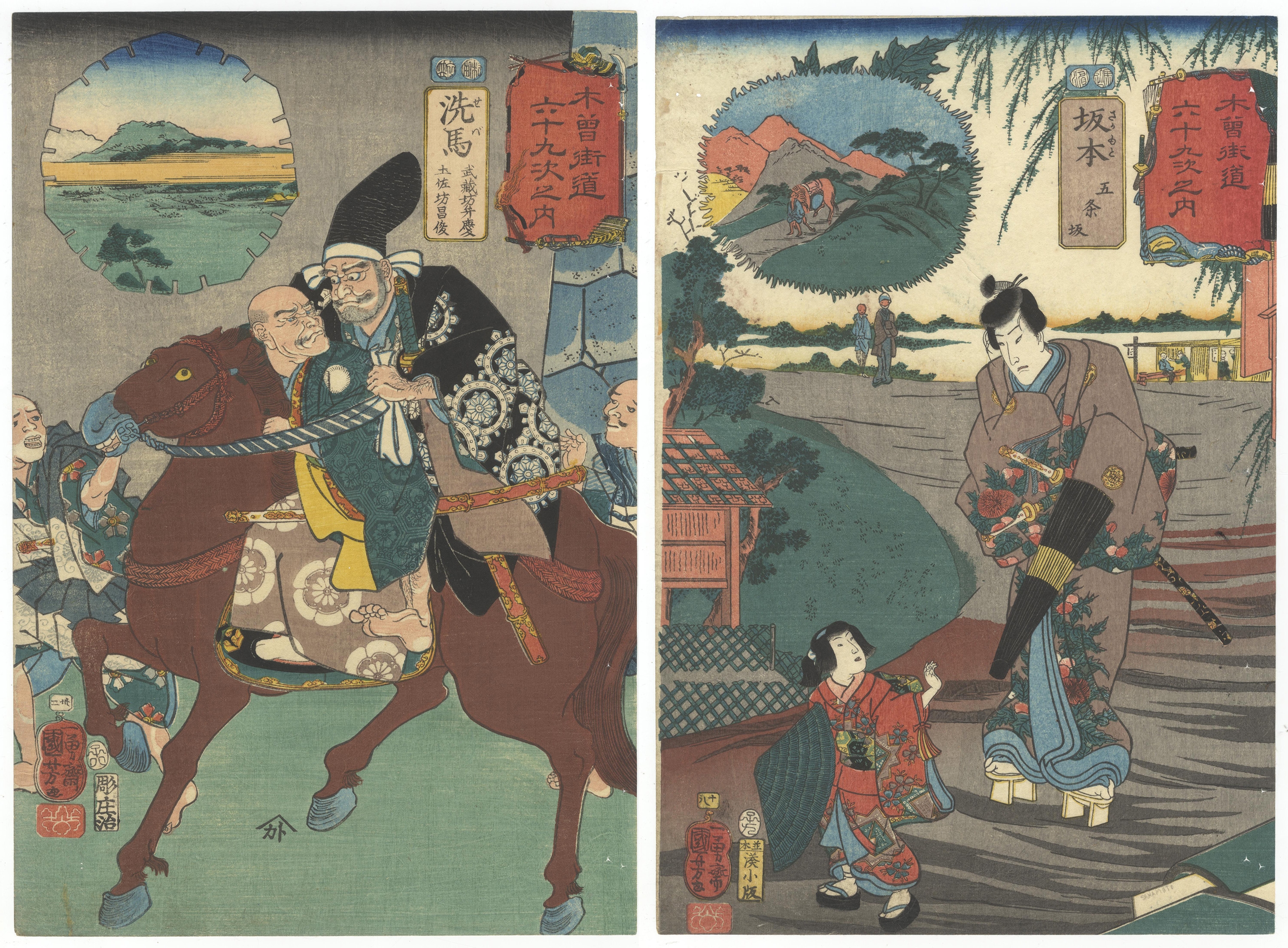 A pair of Japanese Ukiyo-e woodblock prints by Utagawa Hiroshige (1797-1858), from the series ‘Kisokaido Rokujūkyū-tsugi no uchi’ (Sixty-Nine Stations of the Kisokaido Road). The left print depicts the station ‘Sehba’ and the right print depicts ‘Sakamoto Gojōzaka’. Both prints feature figural scenes with landscape elements, characteristic of the Edo period (19th century) Ukiyo-e style, and are rendered in colors on paper. Each print bears the signature ‘Hiroshige ga’ and ‘Ichiryūsai’, along with visible publisher’s seals.