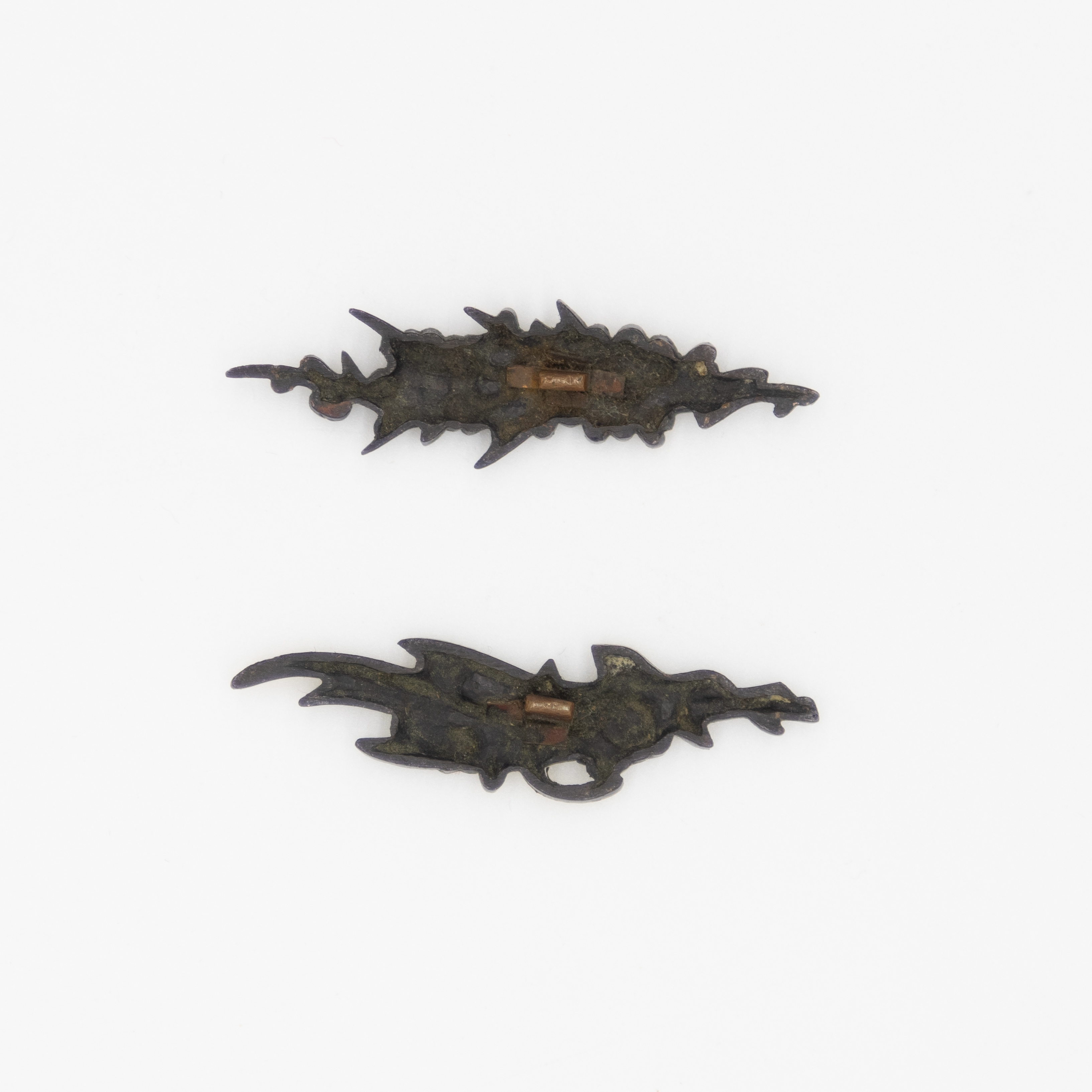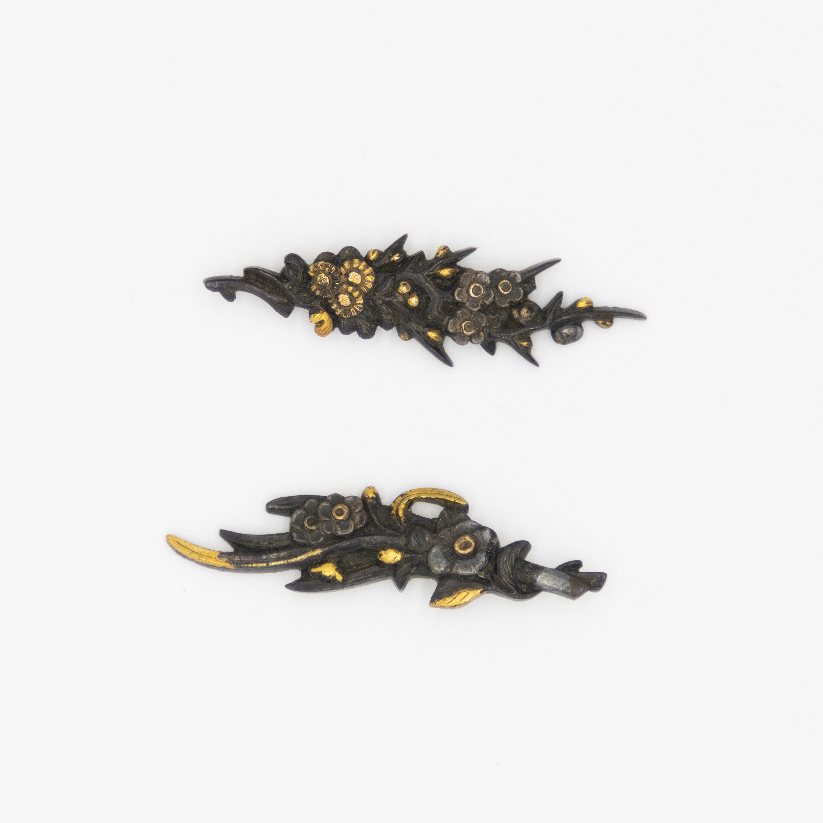 A pair of decorative metal appliques, likely cast from bronze or brass, exhibiting a dark, aged patination with selective gold-toned detailing. The upper element features a distinctly floral design of clustered blossoms and foliage. The lower displays a more stylized, organic composition that appears to incorporate a mythological or zoomorphic head within foliate scrolls. The reverse of each includes a central, raised attachment tab, and the upper piece’s reverse bears faint, largely indiscernible stamped markings, possibly reading ‘JAPAN’.