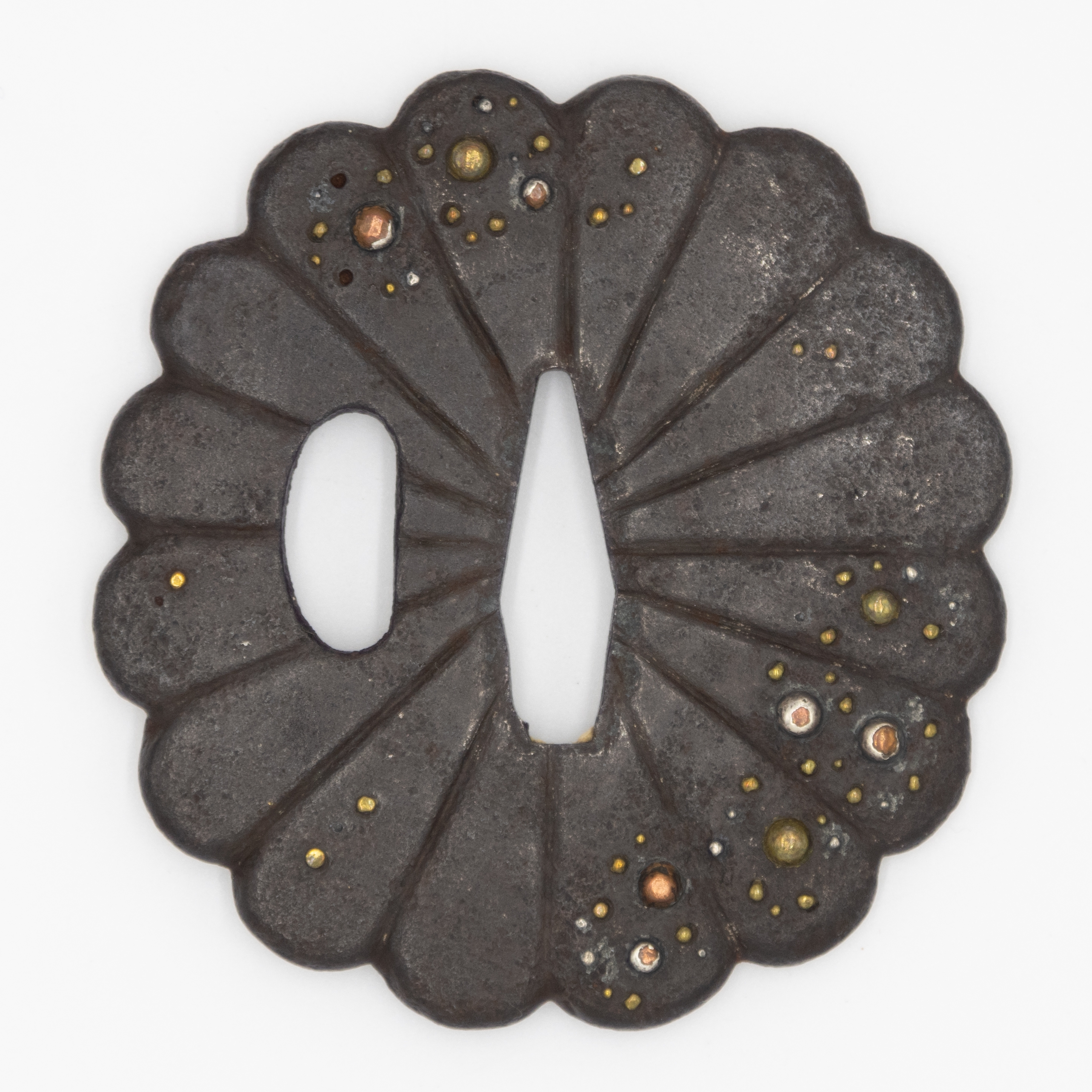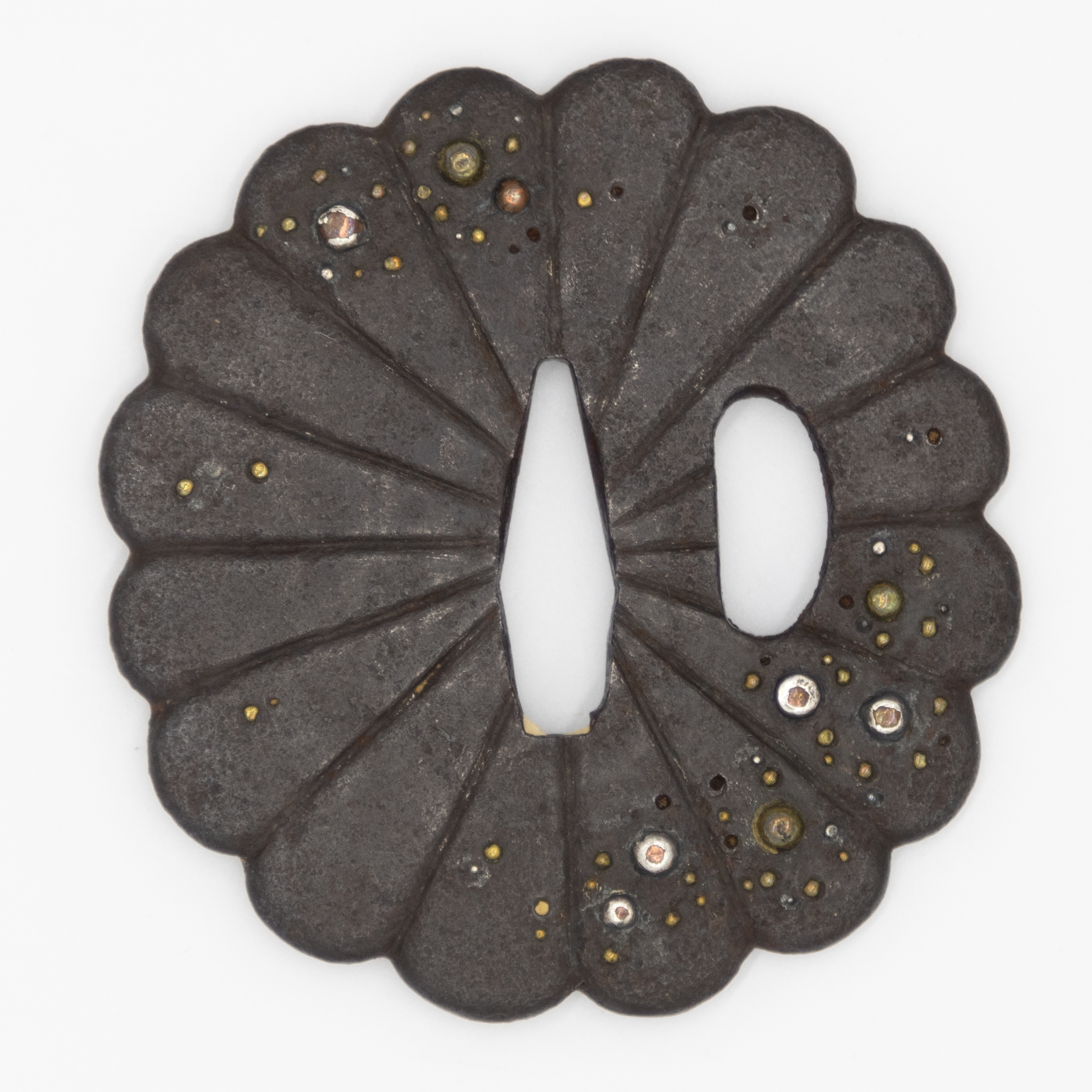 A Japanese sword guard, or tsuba, crafted from dark, patinated iron with a lobed or fluted outline, resembling a chrysanthemum. The surface is adorned with scattered circular inlay decorations of varying sizes, executed in contrasting metals including gold, silver, copper, and a yellow alloy such as brass or bronze. No visible text, signatures, or specific markings are apparent. The central nakago-ana and the flanking kozuka-ana and kogai-ana are present and appear intact.
