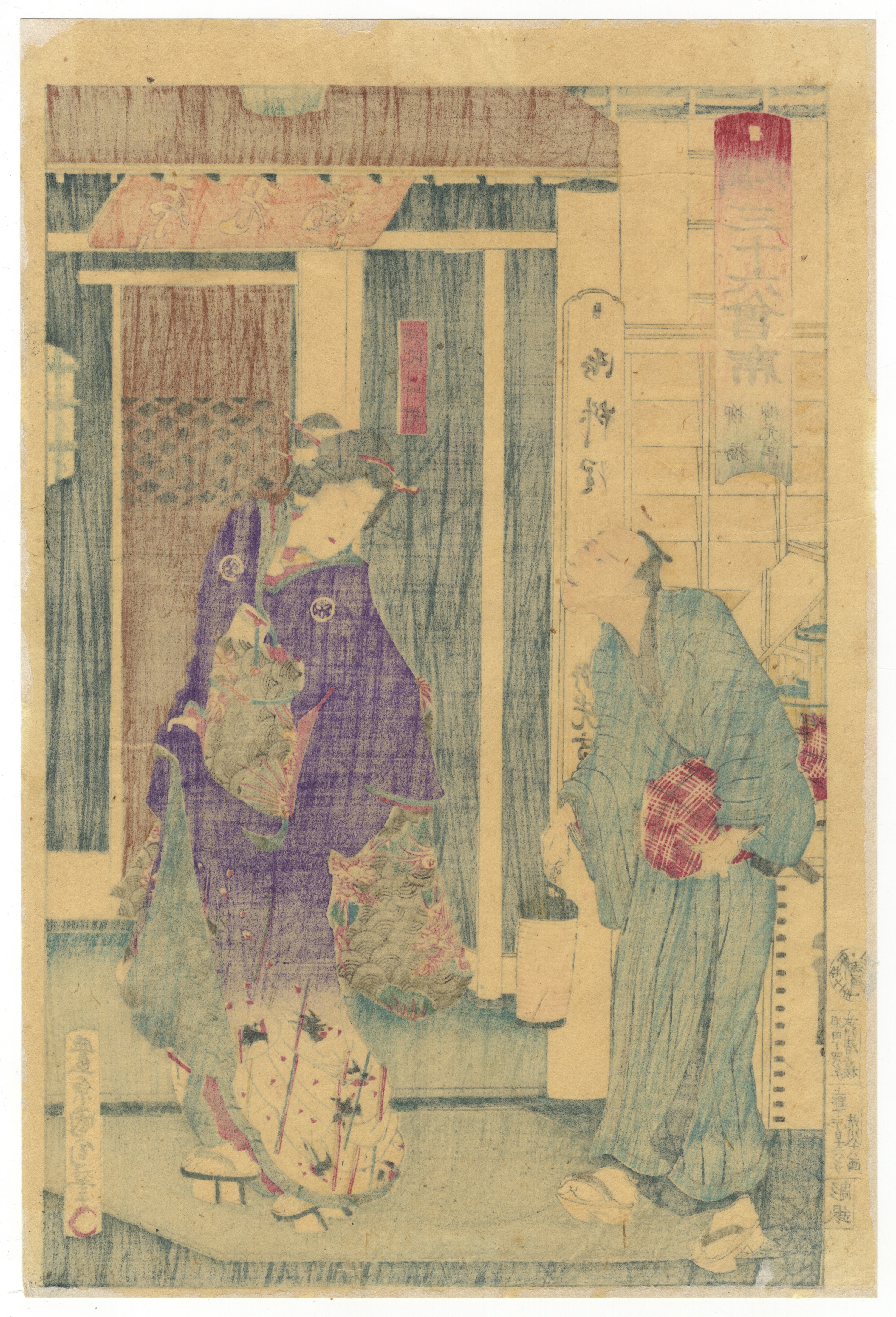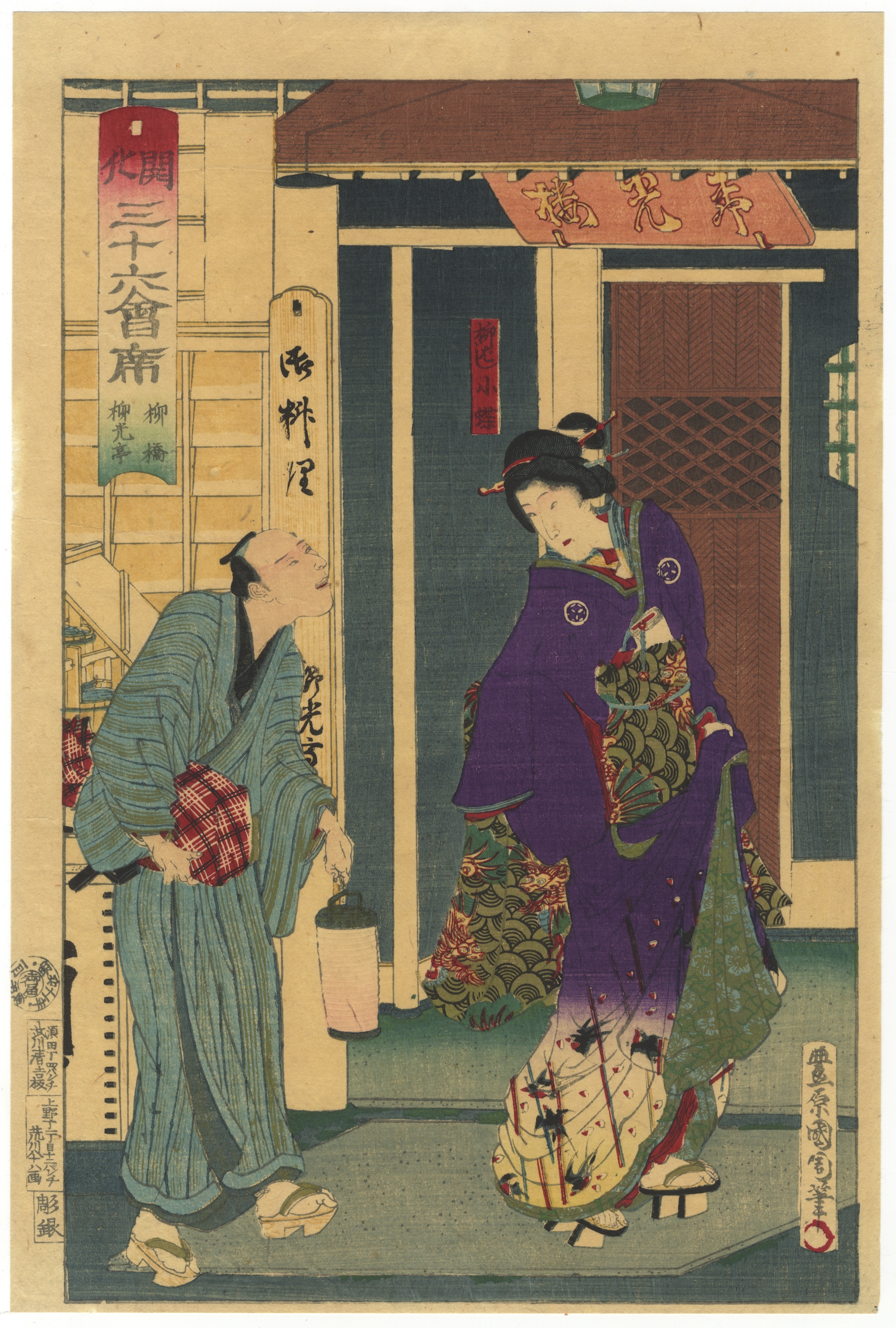 A Japanese Ukiyo-e style woodblock print, executed in multiple colors on paper. The scene depicts two full-length figures in traditional attire, a man holding a lantern and a fan, and a woman in an elaborate kimono, set against a background featuring architectural elements and shop signs. Numerous vertical and horizontal Japanese text cartouches and banners are visible throughout the composition, along with distinct artist and/or publisher seals in the lower left and right margins.