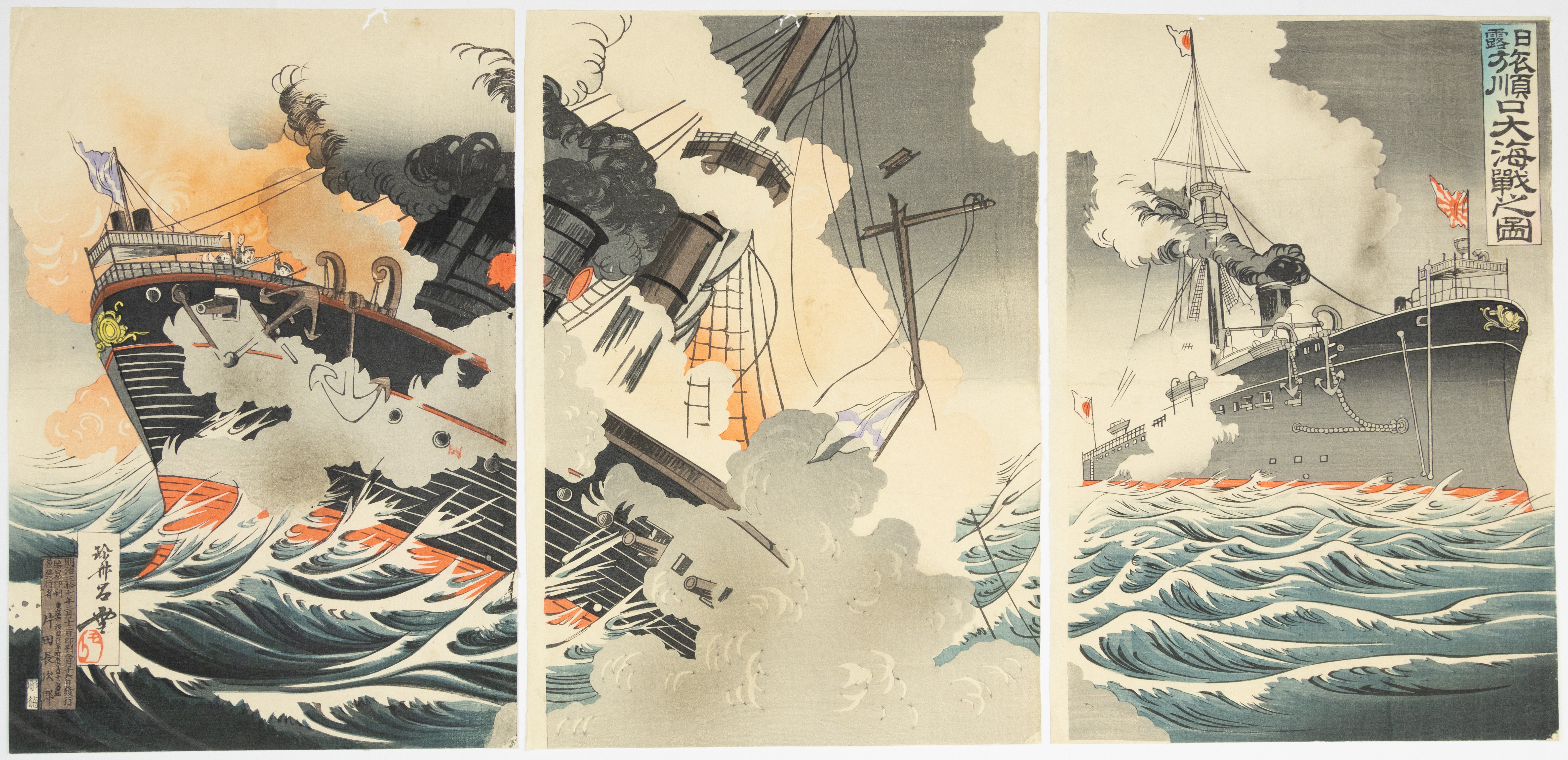 A Japanese woodblock print triptych, likely dating from the late 19th or early 20th century, depicting a dynamic naval battle scene featuring battleships amidst explosions and turbulent seas. Executed on paper, the prints display visible Japanese text and red seals on both the right and left panels, consistent with a title and artist/publisher’s marks.