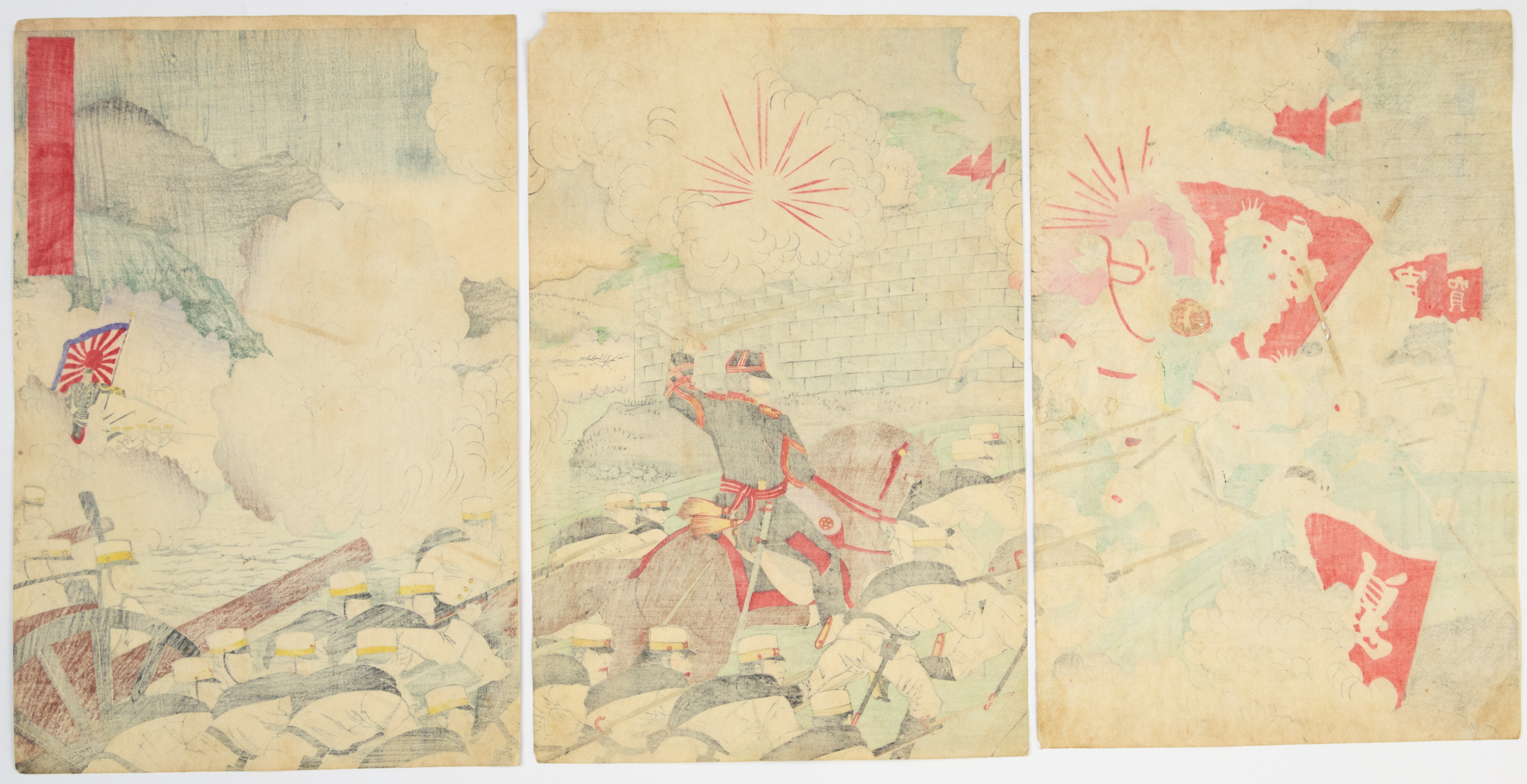 A Japanese woodblock print triptych from the Meiji period, depicting a dynamic battle scene. The composition features soldiers in late 19th to early 20th-century military uniforms, cannons, and fortifications. Executed on paper, the upper right panel includes Japanese text within a red cartouche.