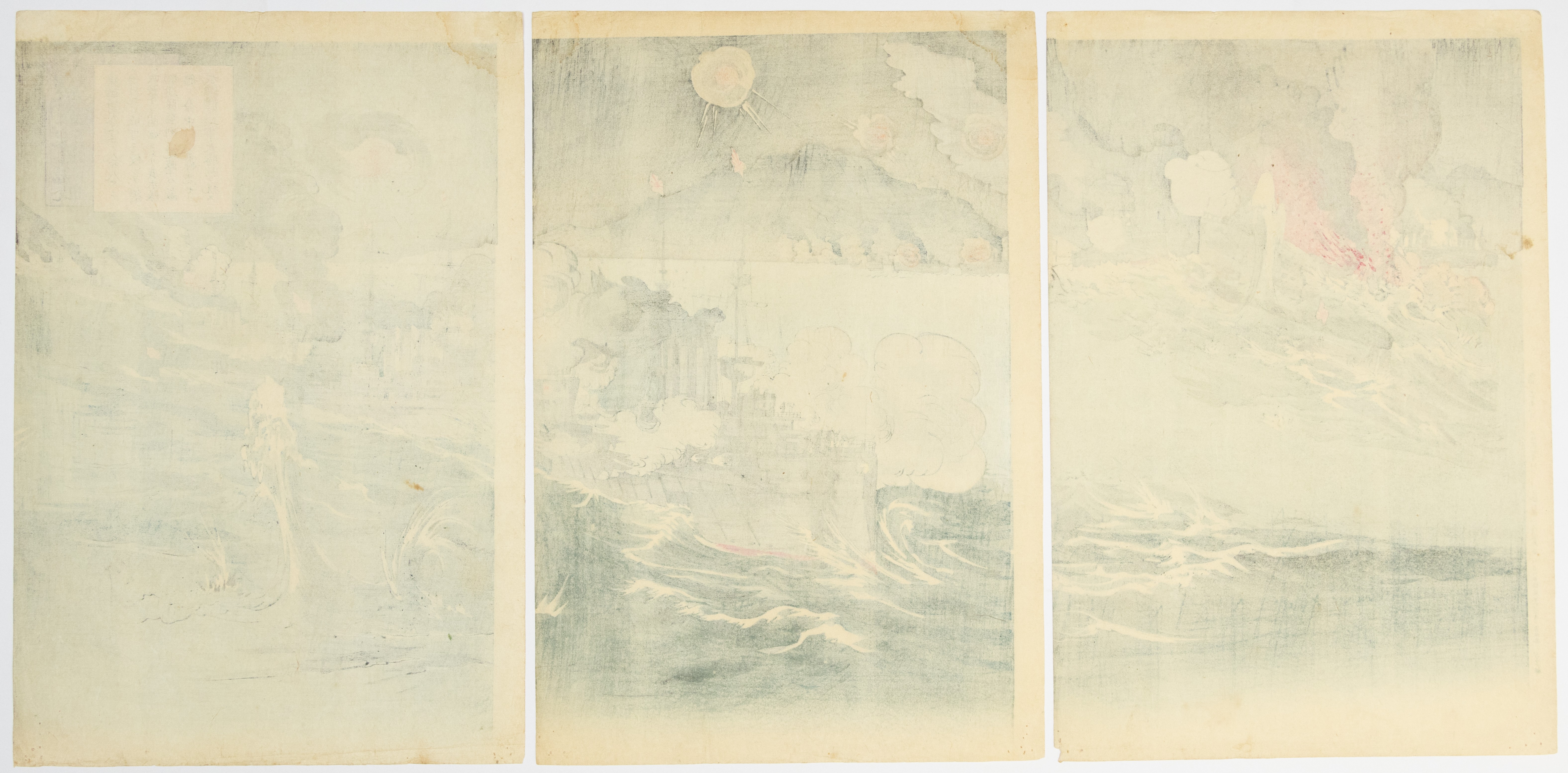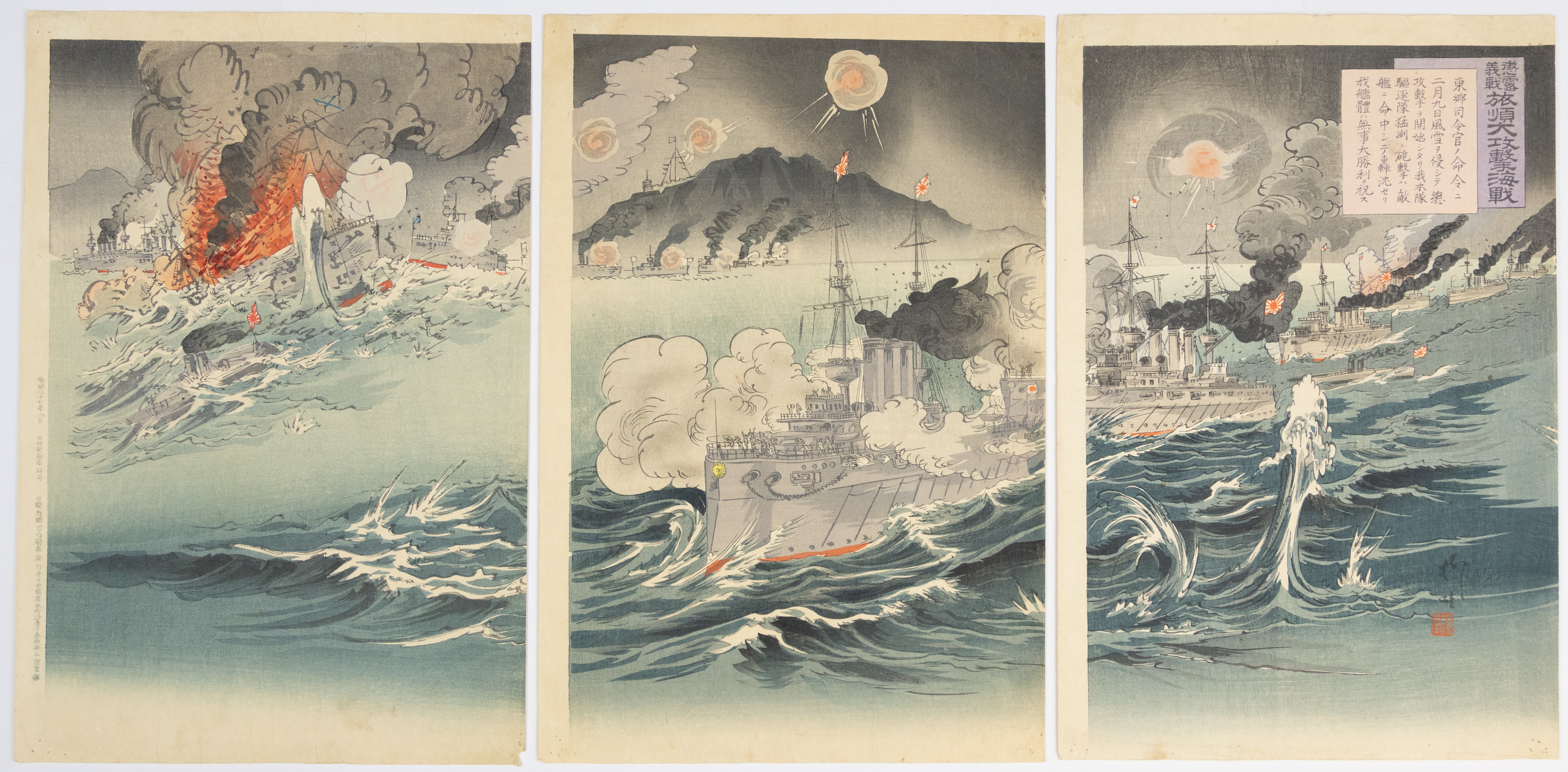 A three-panel Japanese woodblock print triptych, executed on paper, depicting a dynamic naval battle scene. Multiple warships are engaged in combat amidst turbulent seas and smoke. The artistic style is consistent with late 19th or early 20th century Japanese printmaking. Rectangular cartouches with Japanese characters are visible on the upper right section of the rightmost panel and the upper left of the leftmost panel, likely containing titles, artist signatures, or publisher information.