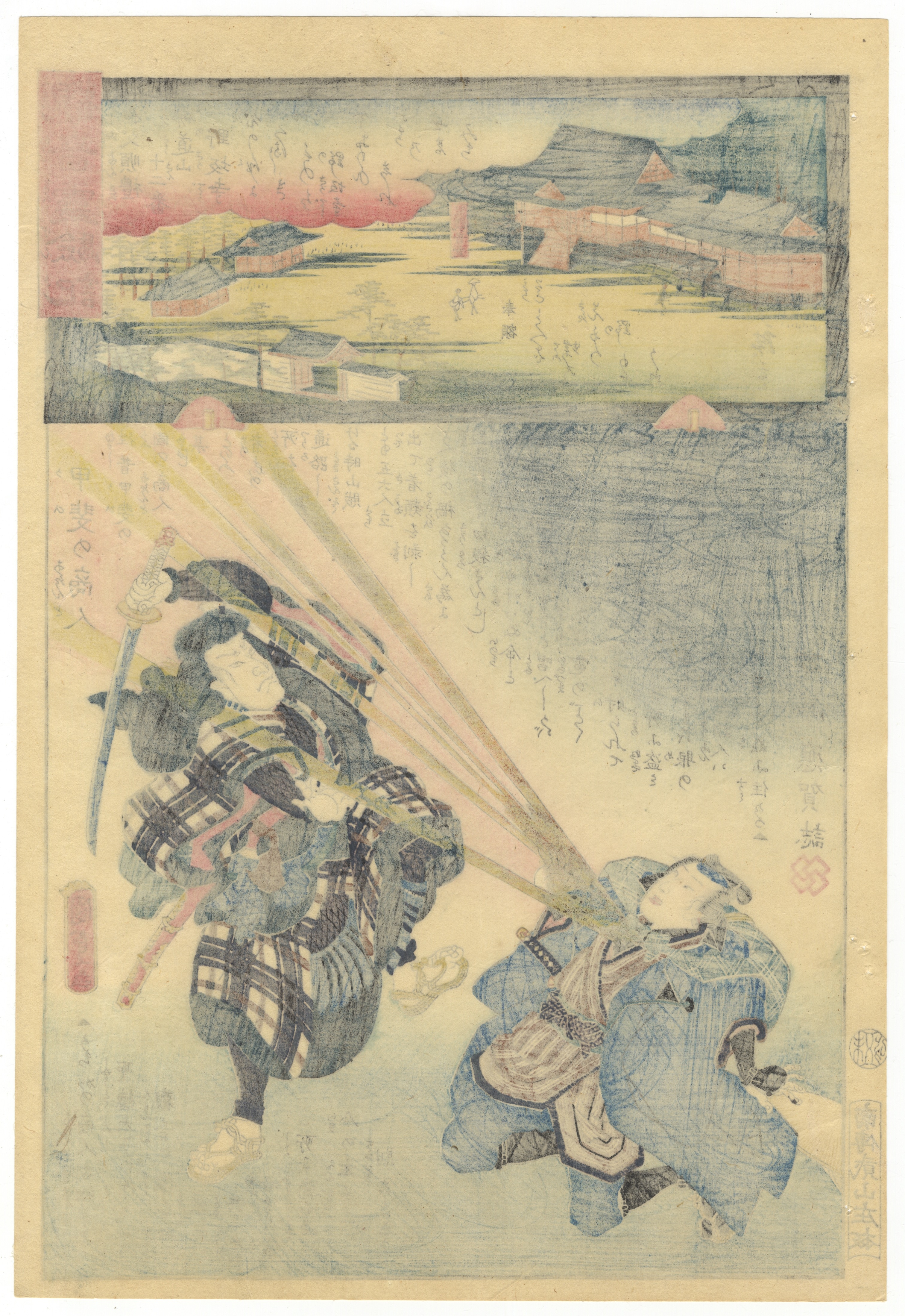 This Japanese ukiyo-e woodblock print on paper, likely dating from the Edo or early Meiji period, features a divided composition. The upper section depicts a landscape with traditional buildings, while the larger lower section presents a dynamic scene with two figures in traditional Japanese attire, one appearing to project rays of energy. The print exhibits characteristic ukiyo-e elements, including bold outlines and areas of flat color. Extensive Japanese text, various cartouches for titles or names, and multiple seals, including what appear to be artist and publisher marks, are visible, notably in the lower left and right.