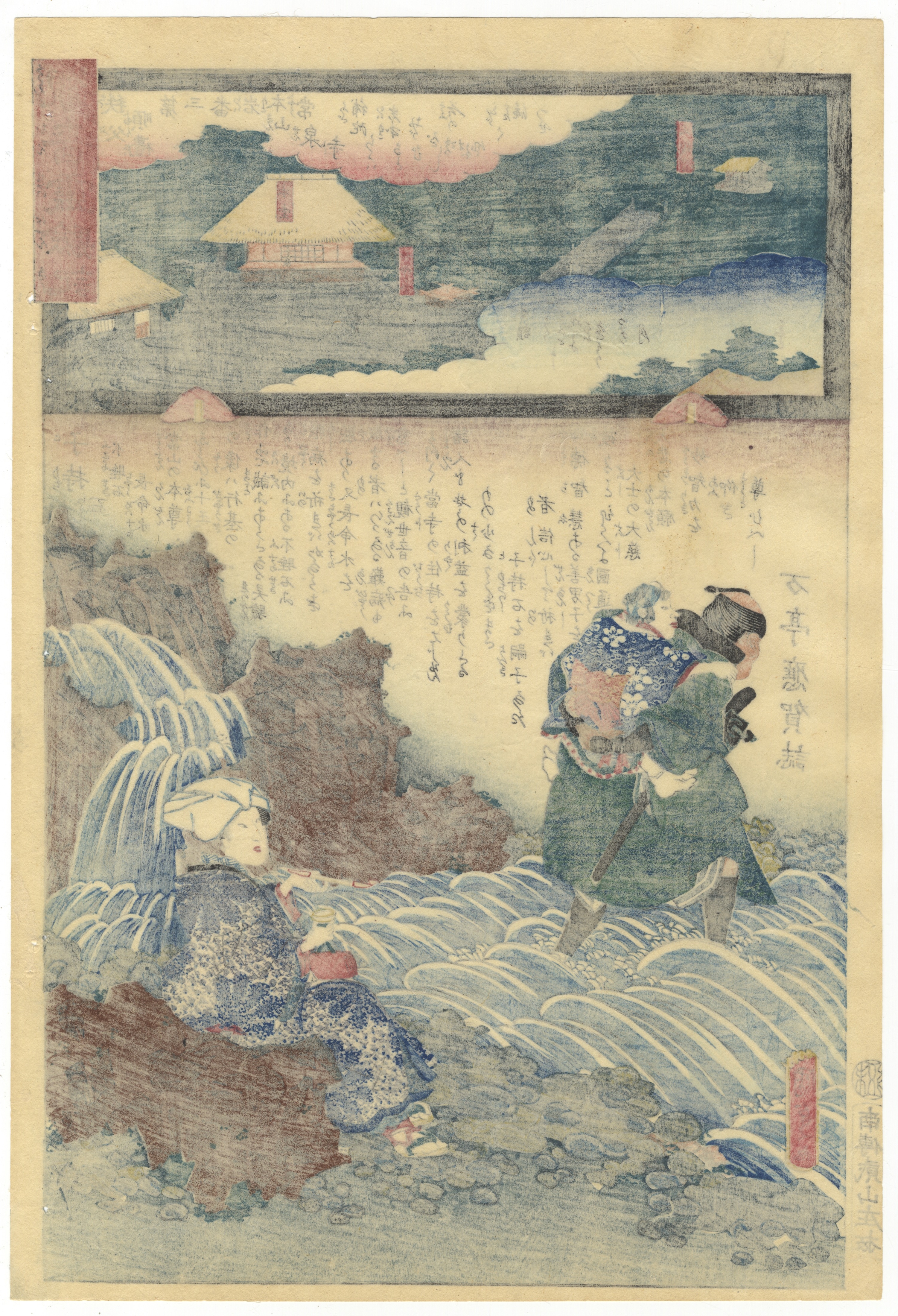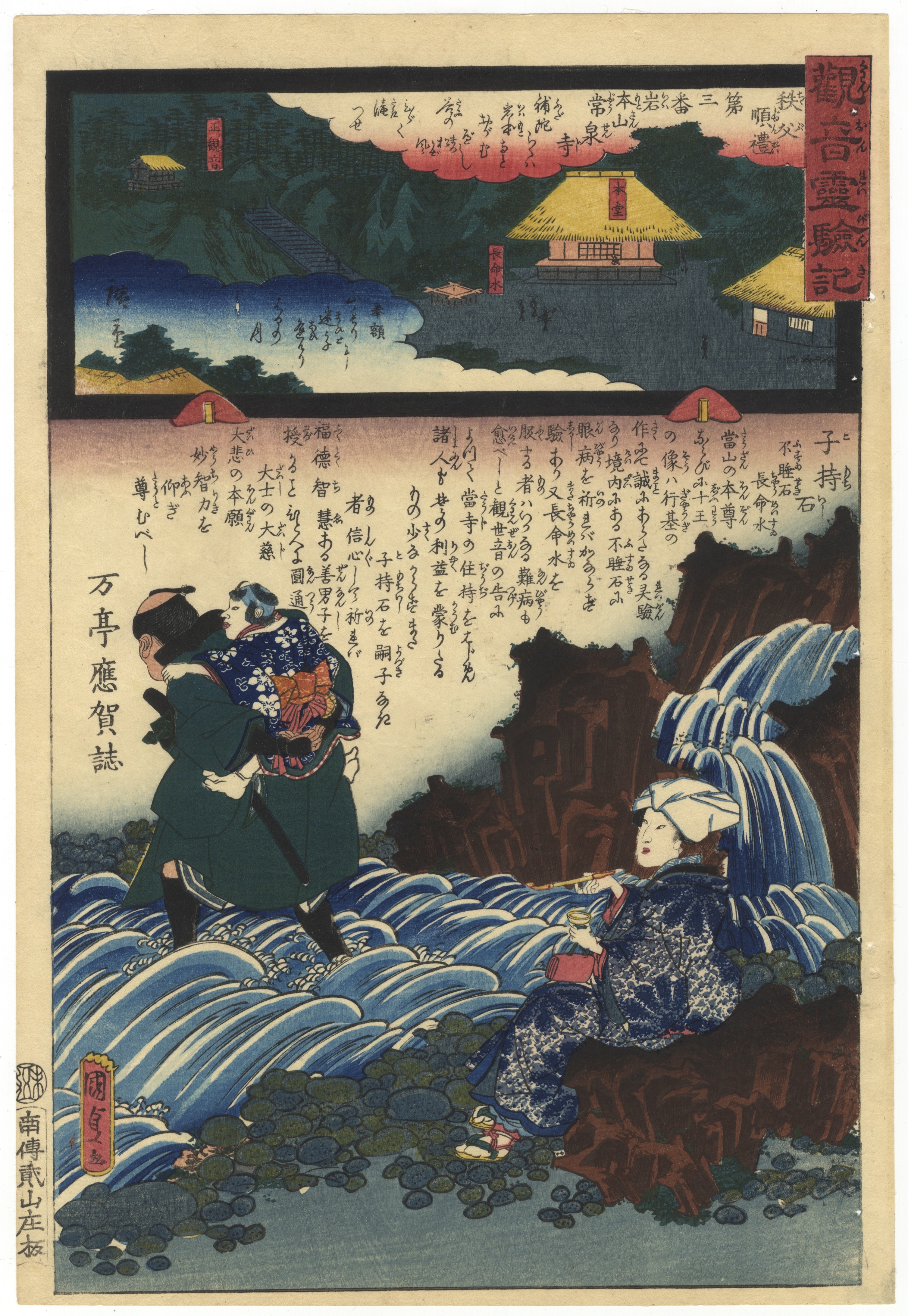 A Japanese Ukiyo-e woodblock print, likely dating from the Edo or Meiji period. It features a multi-panel composition. The larger lower scene depicts two figures, one carrying a child, navigating a rocky, wave-filled shoreline, while another figure rests by a waterfall. The upper section portrays a landscape with temple buildings nestled in mountains. Extensive Japanese text blocks are present, including a prominent red title cartouche in the upper right, a smaller red cartouche within the upper landscape, a vertical column of script on the right side of the main scene, and a red artist or publisher mark in the lower left.