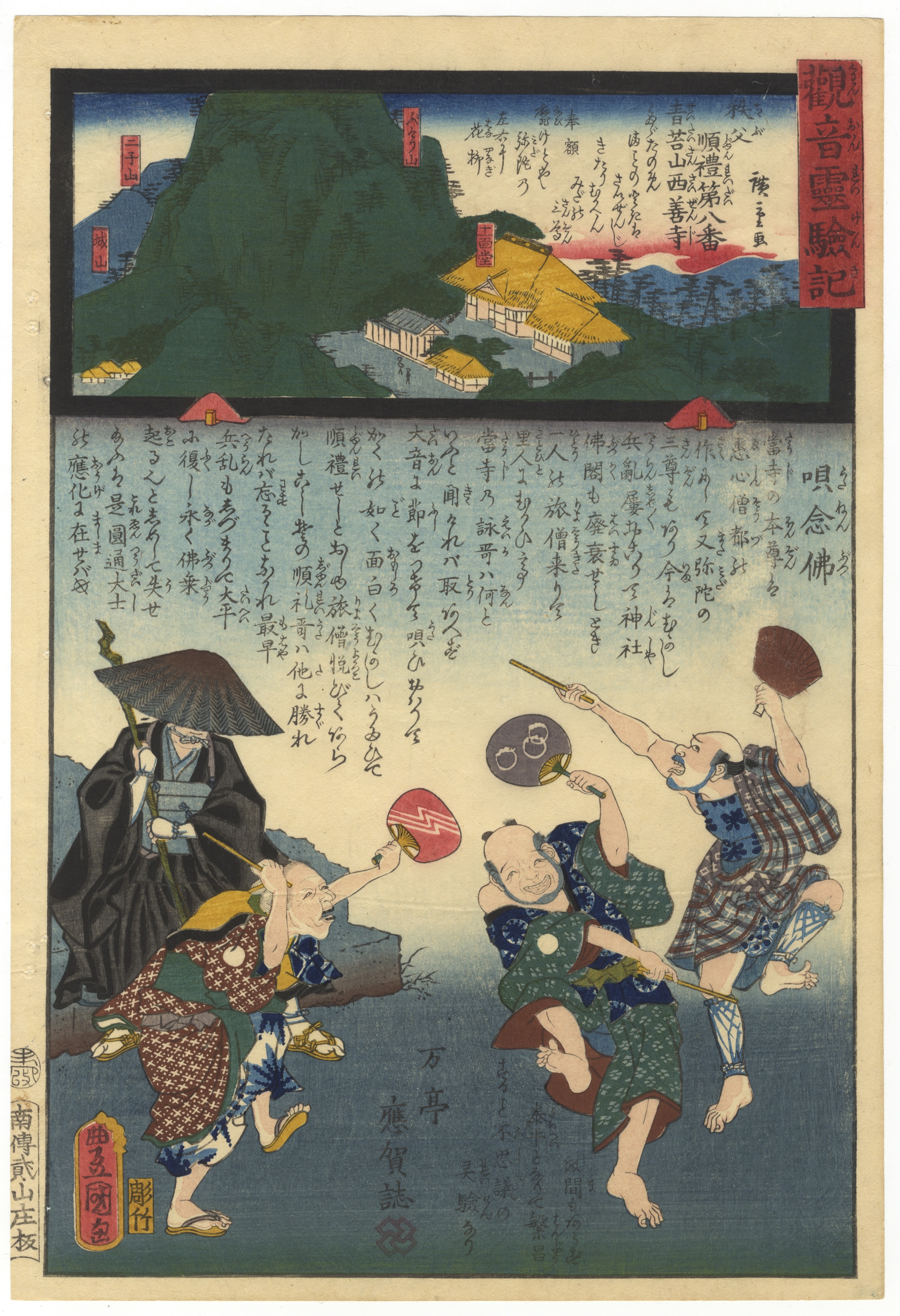 A Japanese polychrome woodblock print by Toyohara Kunichika, from the series ‘Kannon Reigenki’ (観音霊験記), dated Man’en 2 (1861). The print features a two-tiered composition. The upper section depicts a mountainous landscape with traditional buildings, while the lower section illustrates a figural scene with five characters, including a seated traveler or monk and four animated figures, possibly performers or pilgrims, engaged in a dance with fans. Extensive Japanese text and narrative elements are present throughout, alongside several red cartouches. The artist’s signature ‘豊原国周画’ (Toyohara Kunichika ga) is visible in a red cartouche in the lower left corner, and the series title ‘観音霊験記’ (Kannon Reigenki) is in a prominent red cartouche in the upper right.