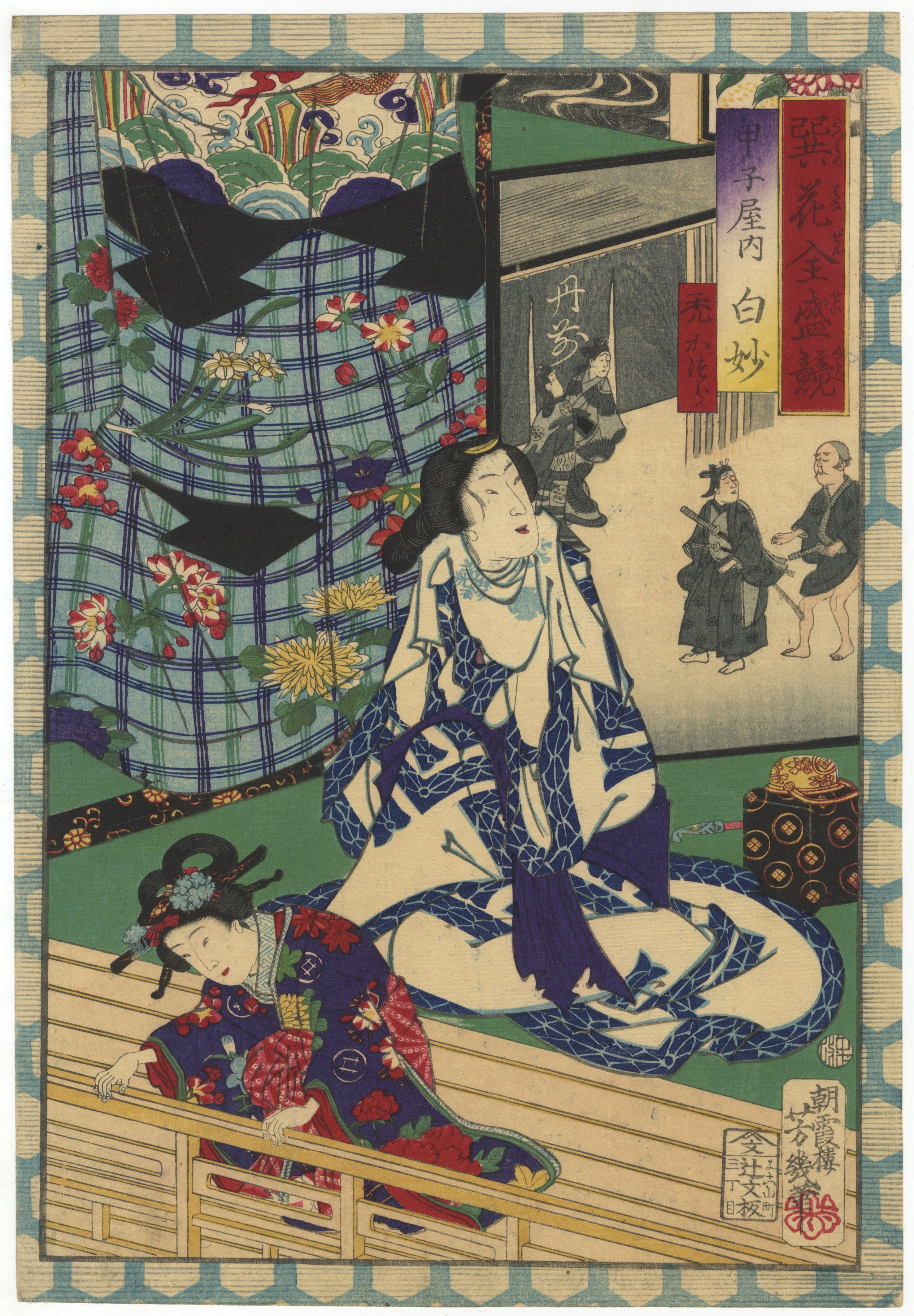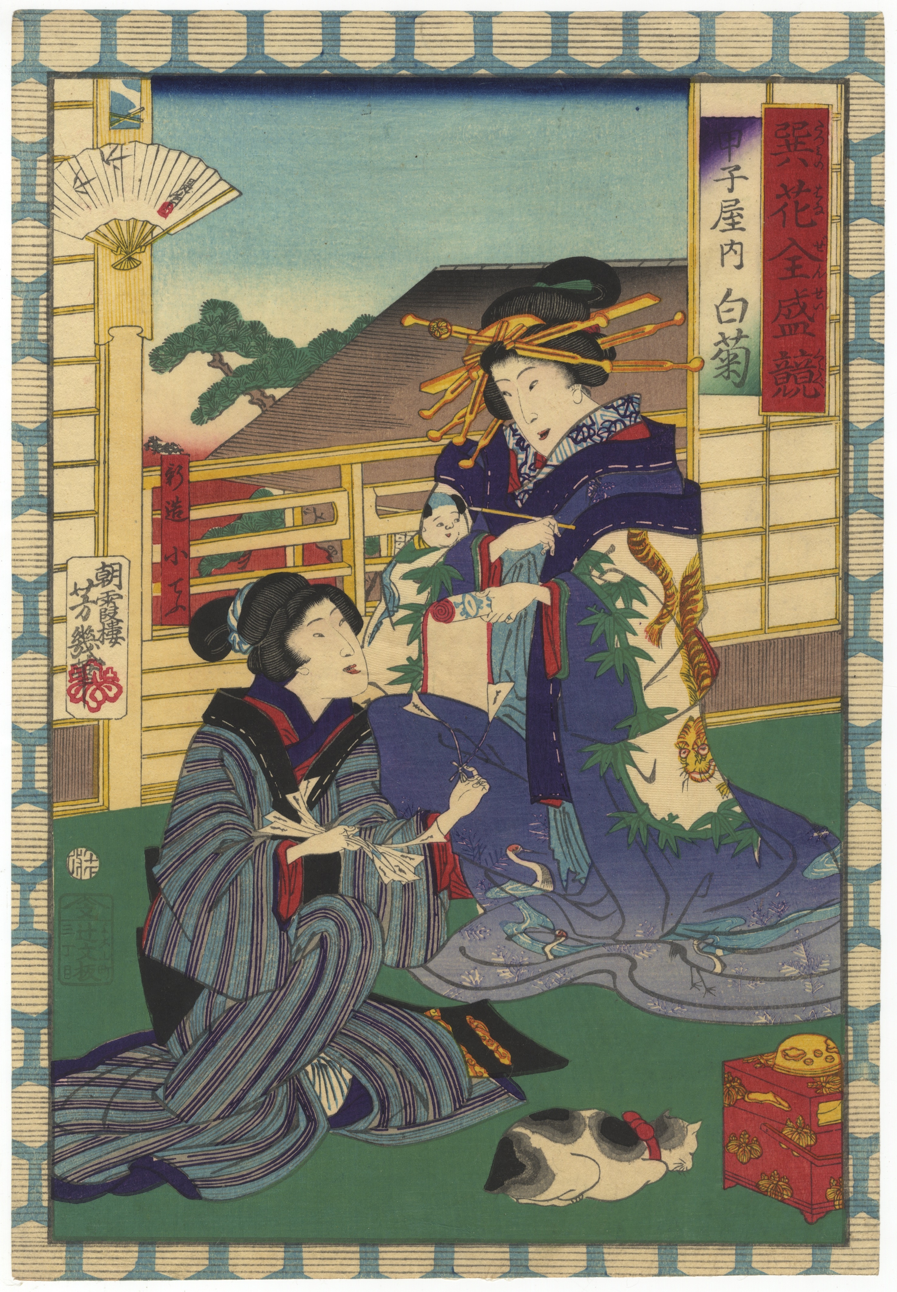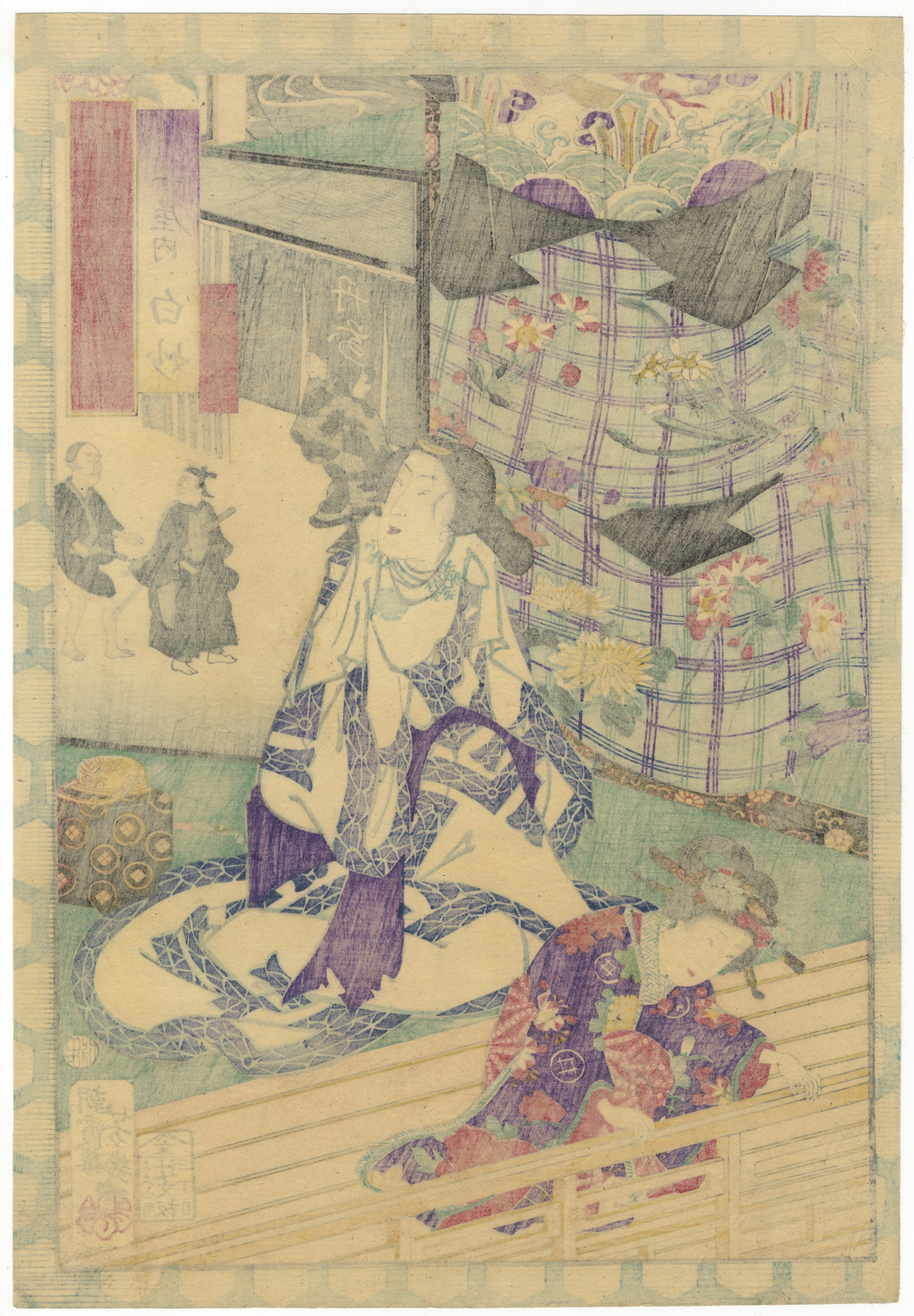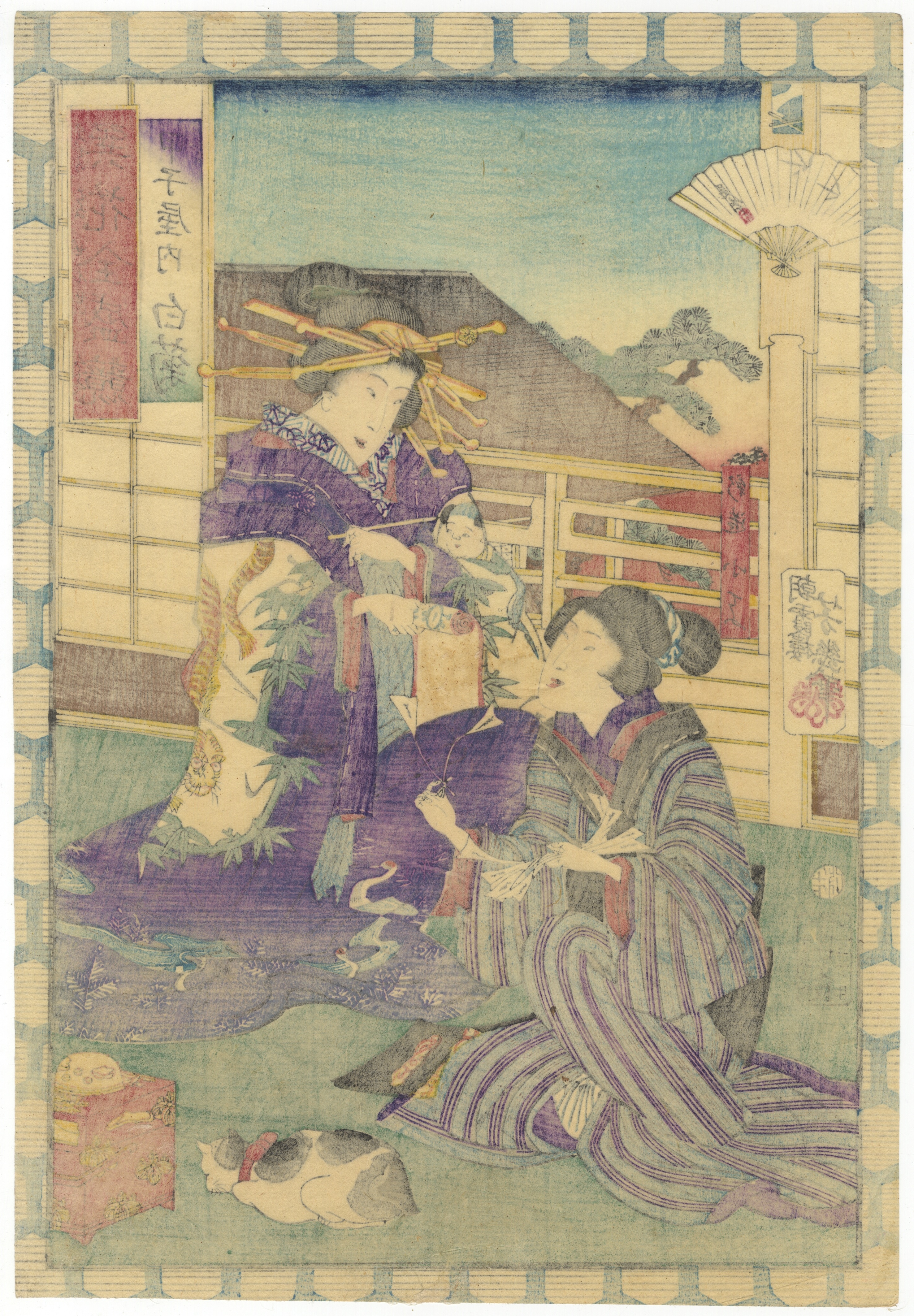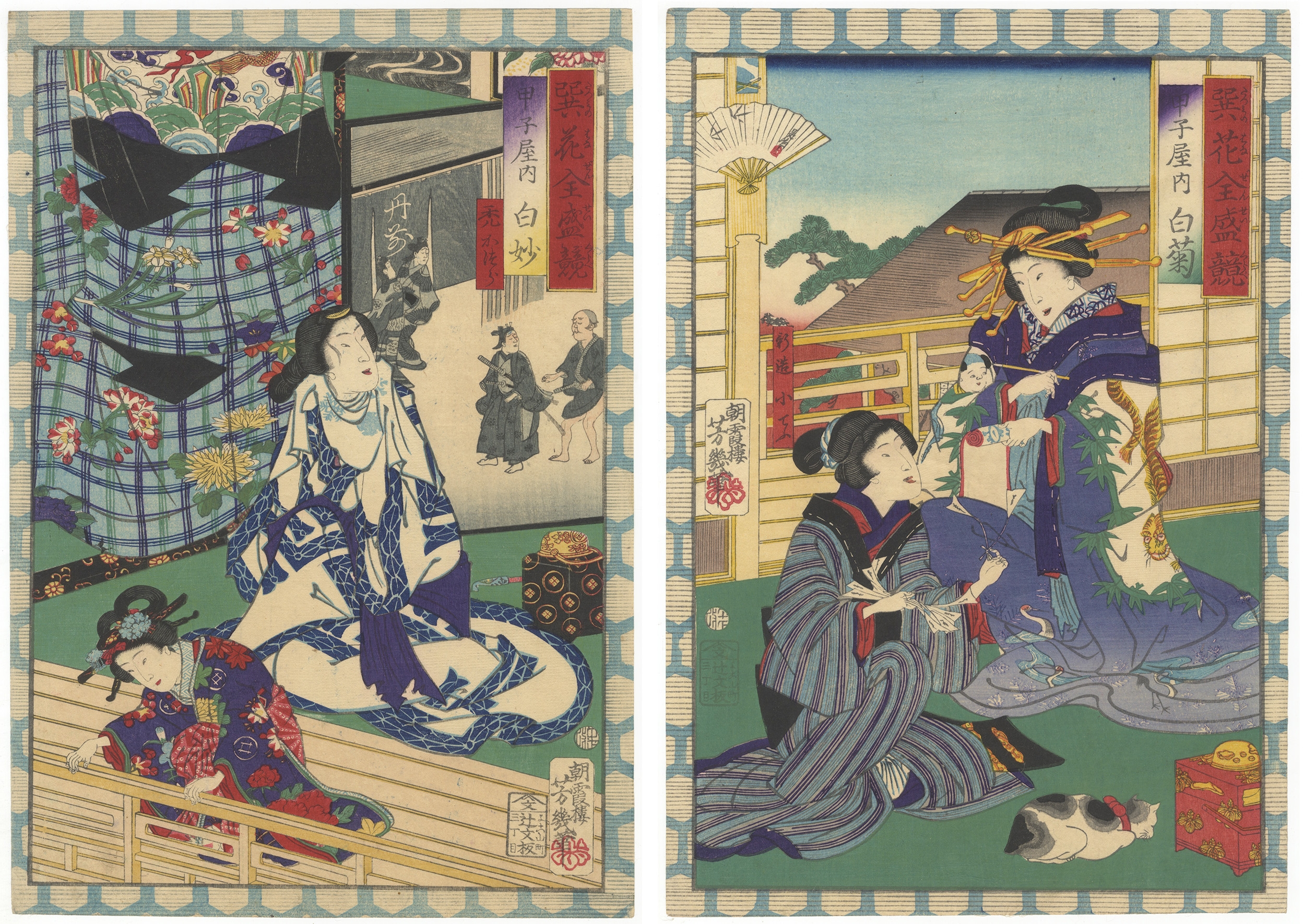 This item comprises two Japanese woodblock prints, presented as a diptych, executed in the Ukiyo-e style and likely dating from the late Edo or early Meiji period. Each panel depicts a genre scene featuring multiple figures in traditional attire, rendered with a multi-color palette on paper and framed by a repeating geometric border. Both prints contain vertical cartouches with Japanese characters at the upper right, along with additional smaller cartouches or a circular red seal bearing more characters in the lower or central-left areas.