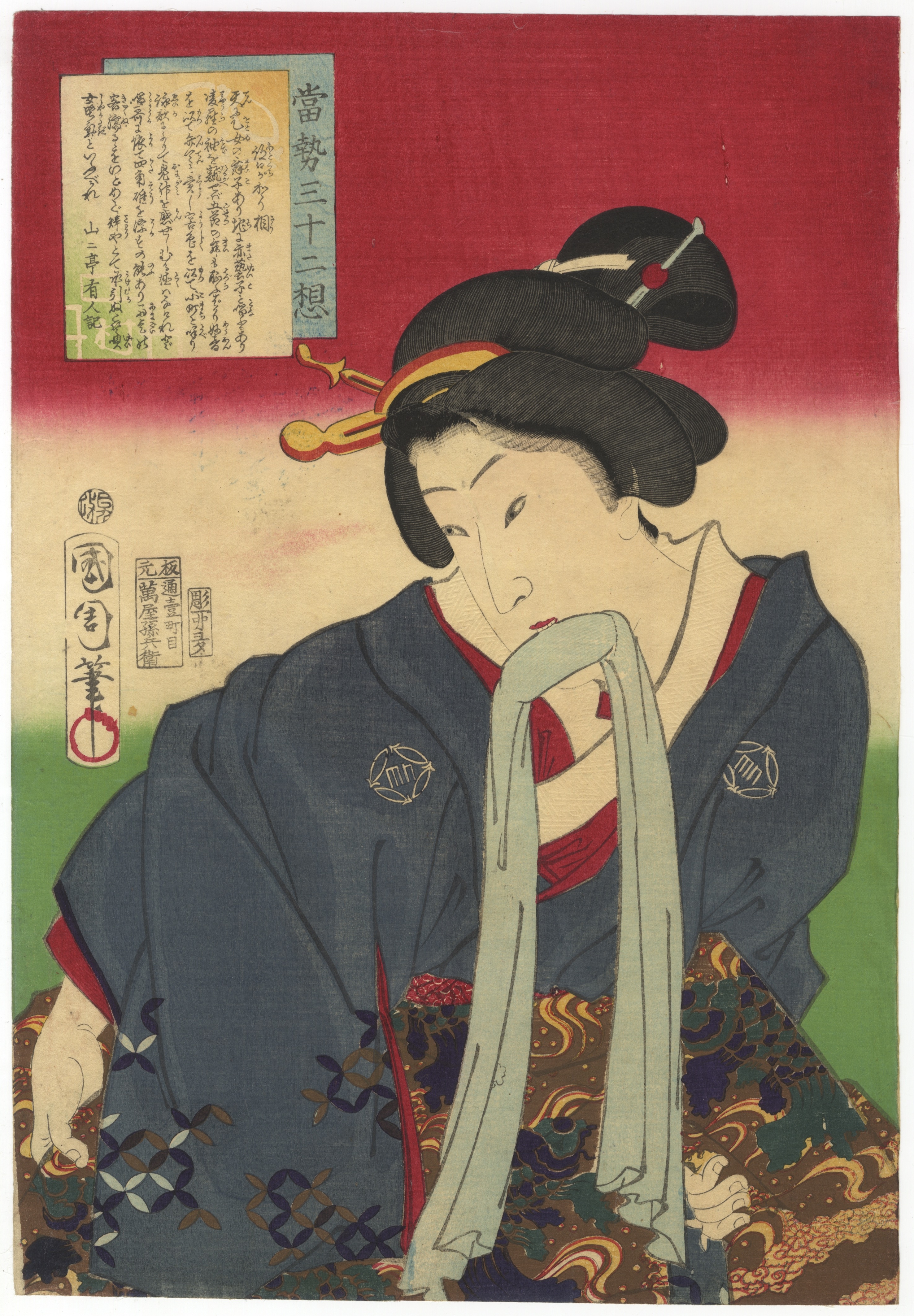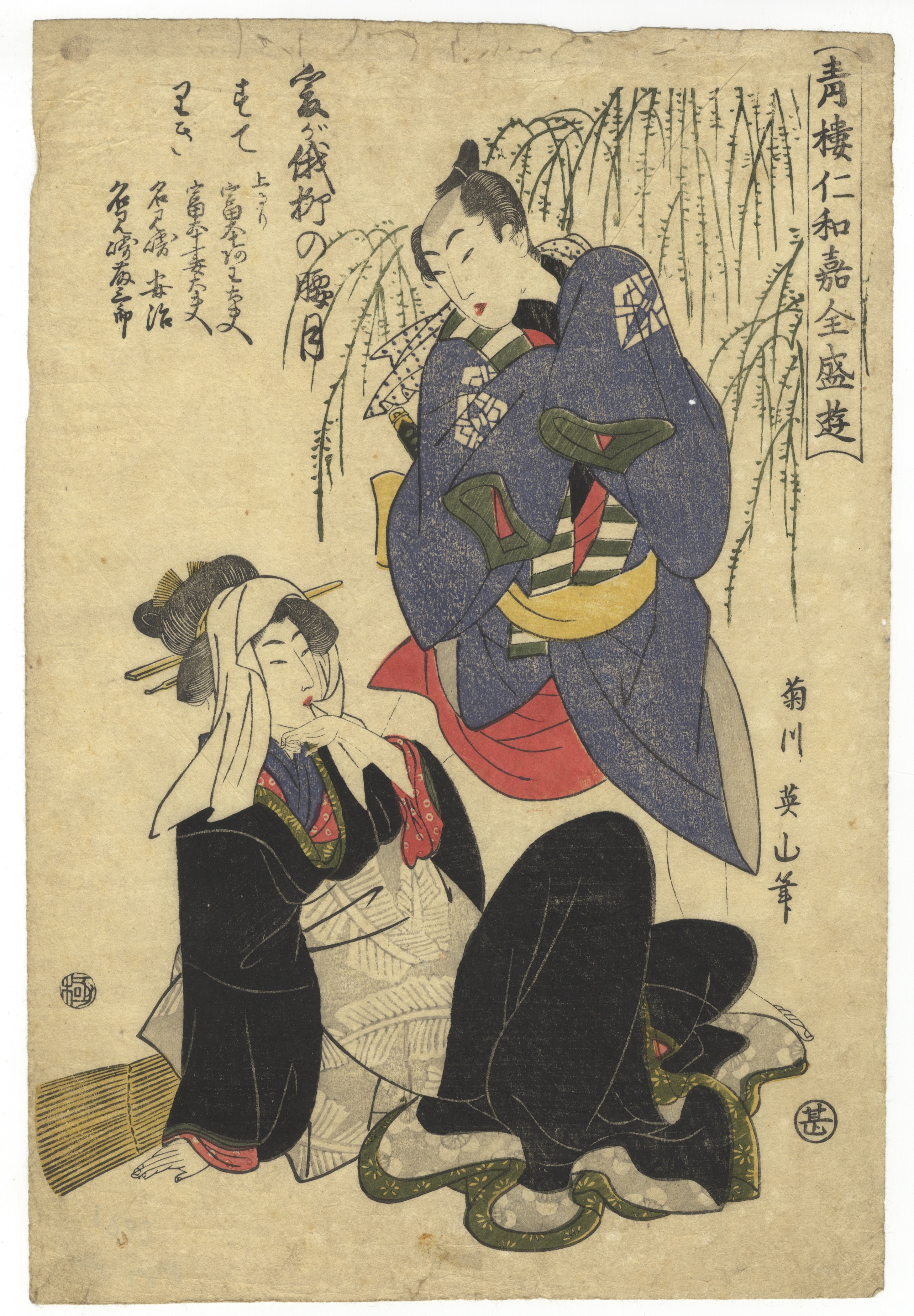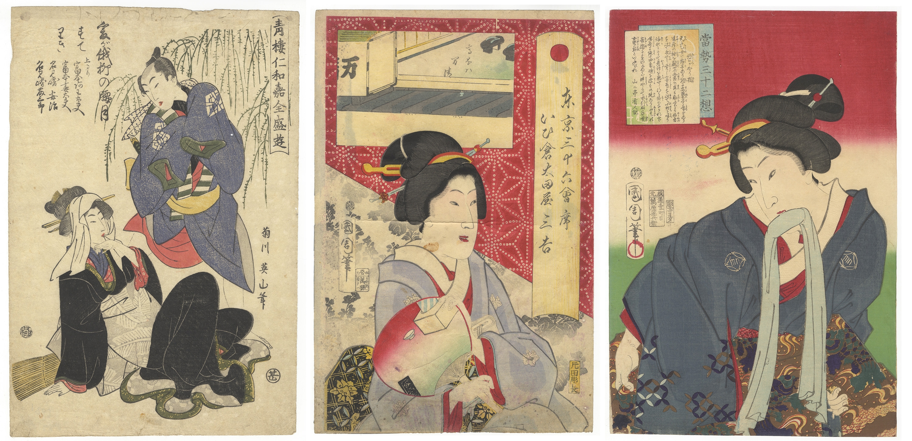This lot comprises three Japanese ukiyo-e woodblock prints on paper, each depicting female figures characteristic of the *bijinga* (beauty print) genre. The first print is signed “Kikukawa Eizan” and features two figures with extensive calligraphy and two visible seals. The second print is signed “Toyokuni ga” and bears a publisher’s seal, likely Nishimuraya Yohachi, portraying a single seated figure against patterned and architectural backgrounds. The third print is signed “Utagawa Kuniyoshi ga” and includes a title block “Tōsei Sanjūni Sō” along with publisher and censor seals, depicting a single figure holding a cloth.