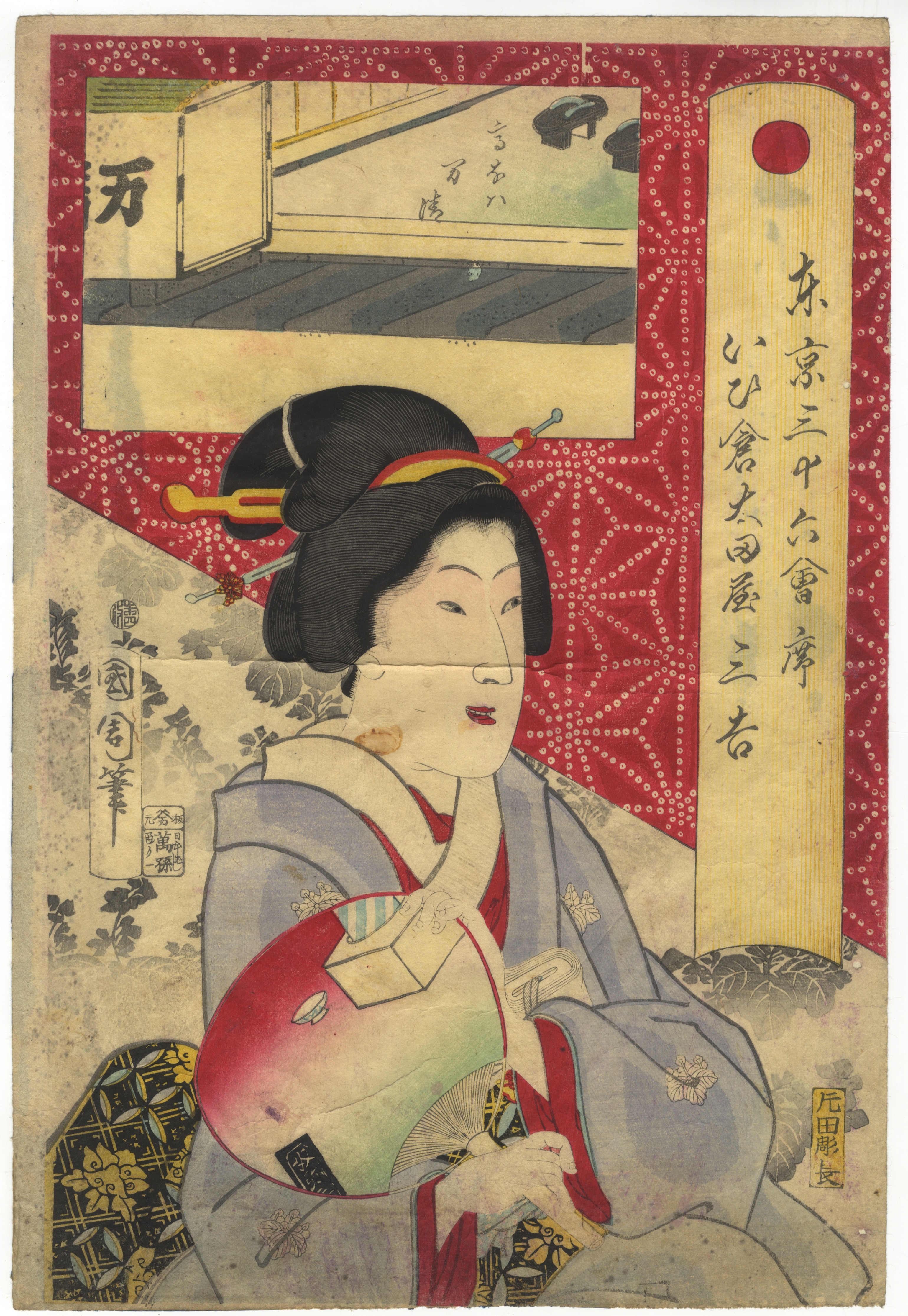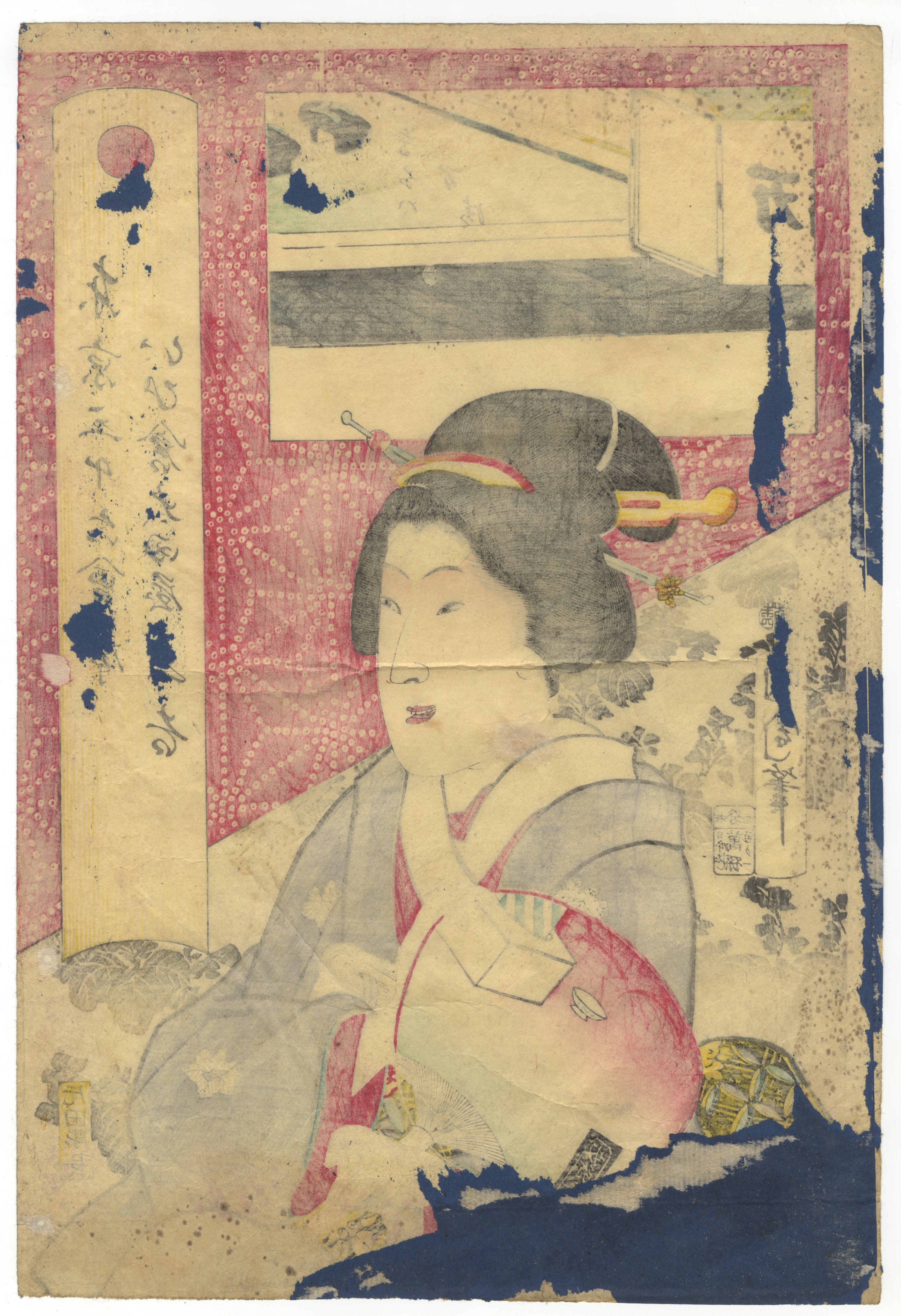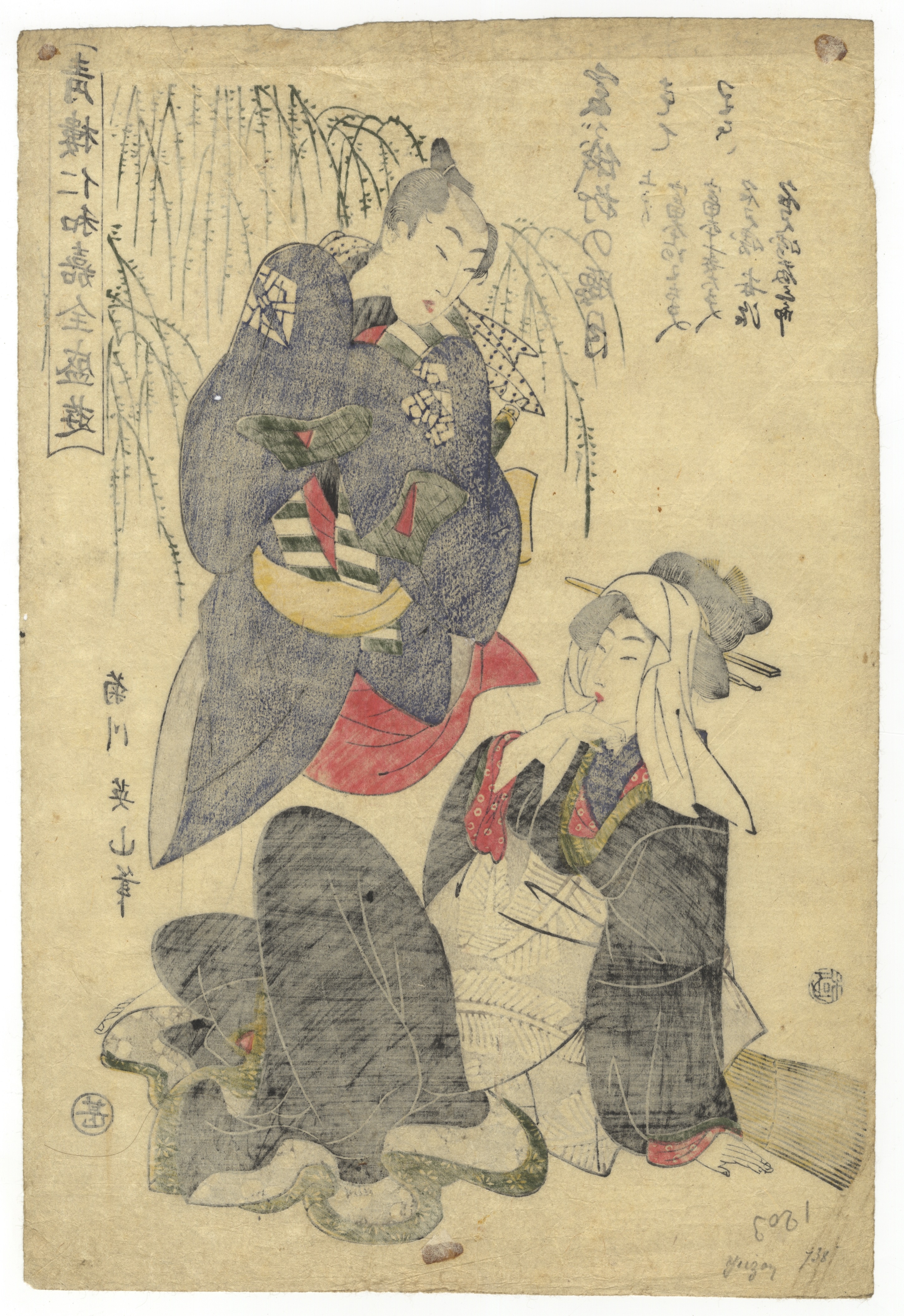 This lot comprises three Japanese ukiyo-e woodblock prints on paper, each depicting female figures characteristic of the *bijinga* (beauty print) genre. The first print is signed “Kikukawa Eizan” and features two figures with extensive calligraphy and two visible seals. The second print is signed “Toyokuni ga” and bears a publisher’s seal, likely Nishimuraya Yohachi, portraying a single seated figure against patterned and architectural backgrounds. The third print is signed “Utagawa Kuniyoshi ga” and includes a title block “Tōsei Sanjūni Sō” along with publisher and censor seals, depicting a single figure holding a cloth.