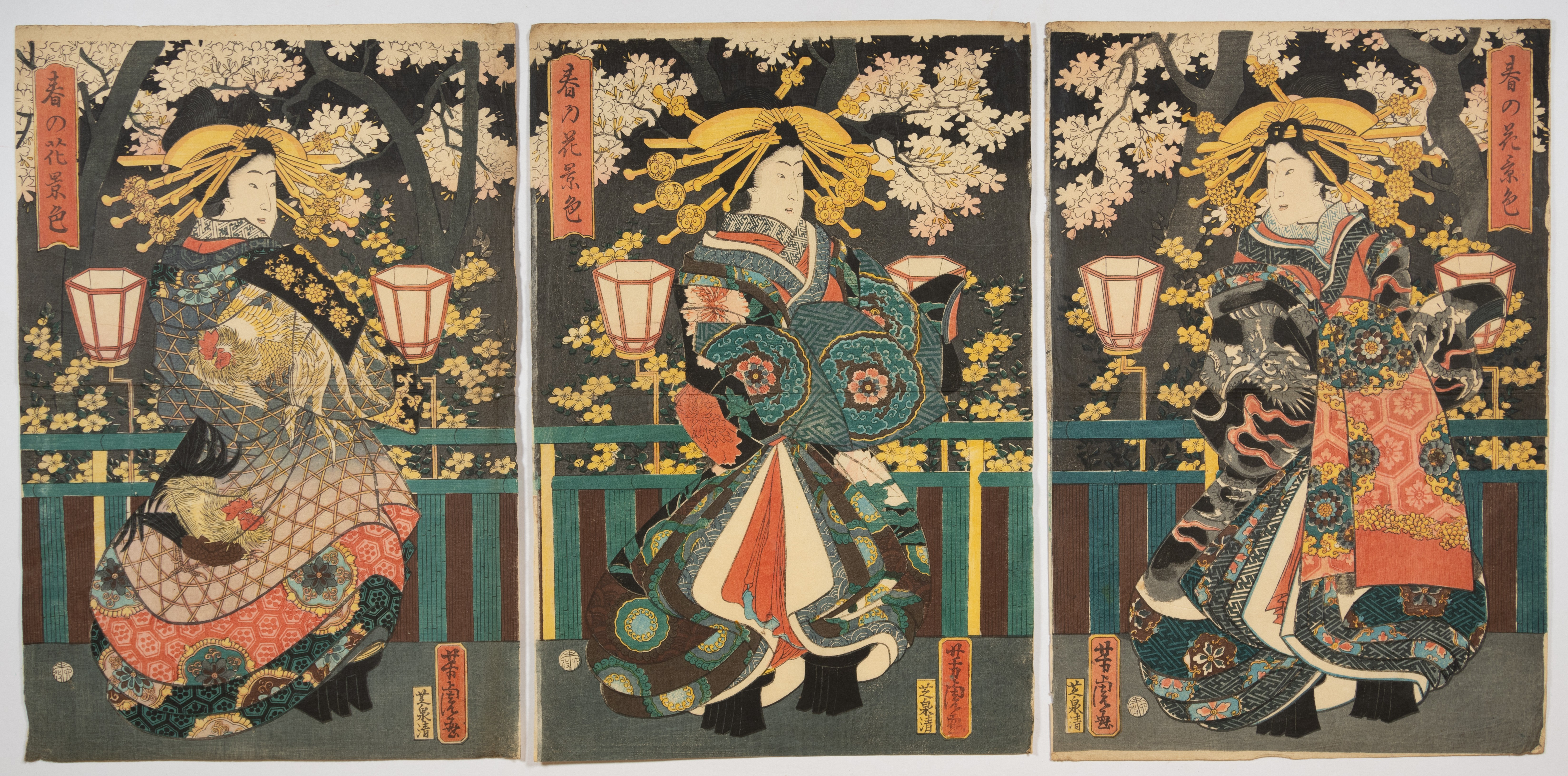 A Japanese woodblock print triptych, consistent with the ukiyo-e style of the Edo period. The prints depict three elaborately dressed courtesans or beauties (bijin-ga) under flowering cherry trees, illuminated by lanterns, suggesting a night scene. Each panel features vertical textual inscriptions in the upper corners and smaller cartouches containing Japanese characters near the lower corners, including a visible ‘豊國画’ (Toyokuni ga) mark on the left panel. The material is paper.