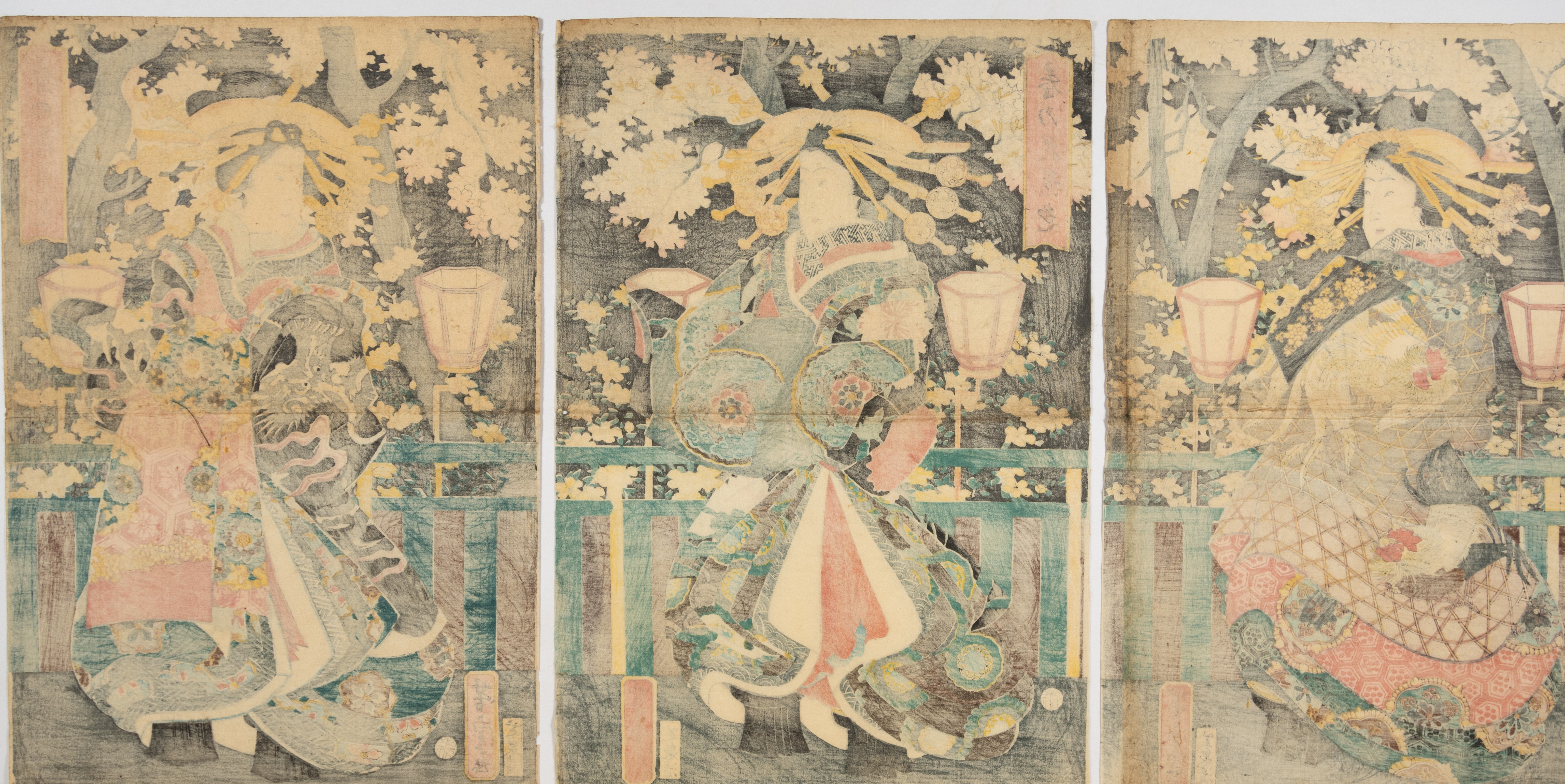 The prints exhibit significant color fading, particularly in the blues and greens. The paper shows general signs of age, including some discoloration and minor creasing. Overall, the triptych appears to be in fair to good condition for its type and age.