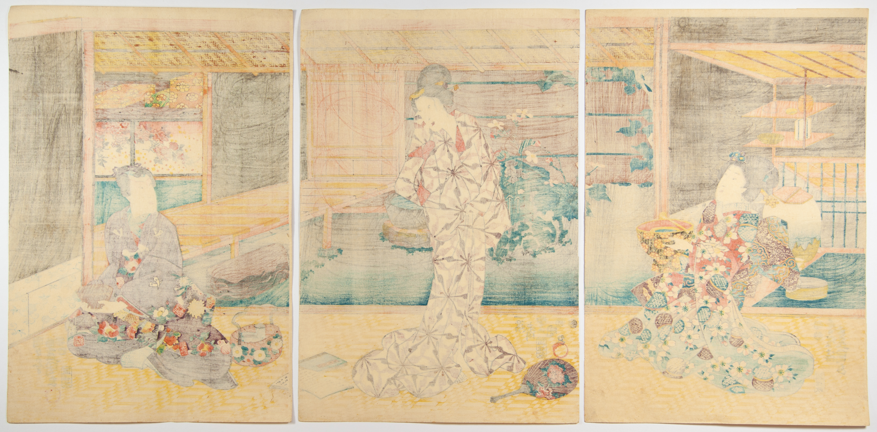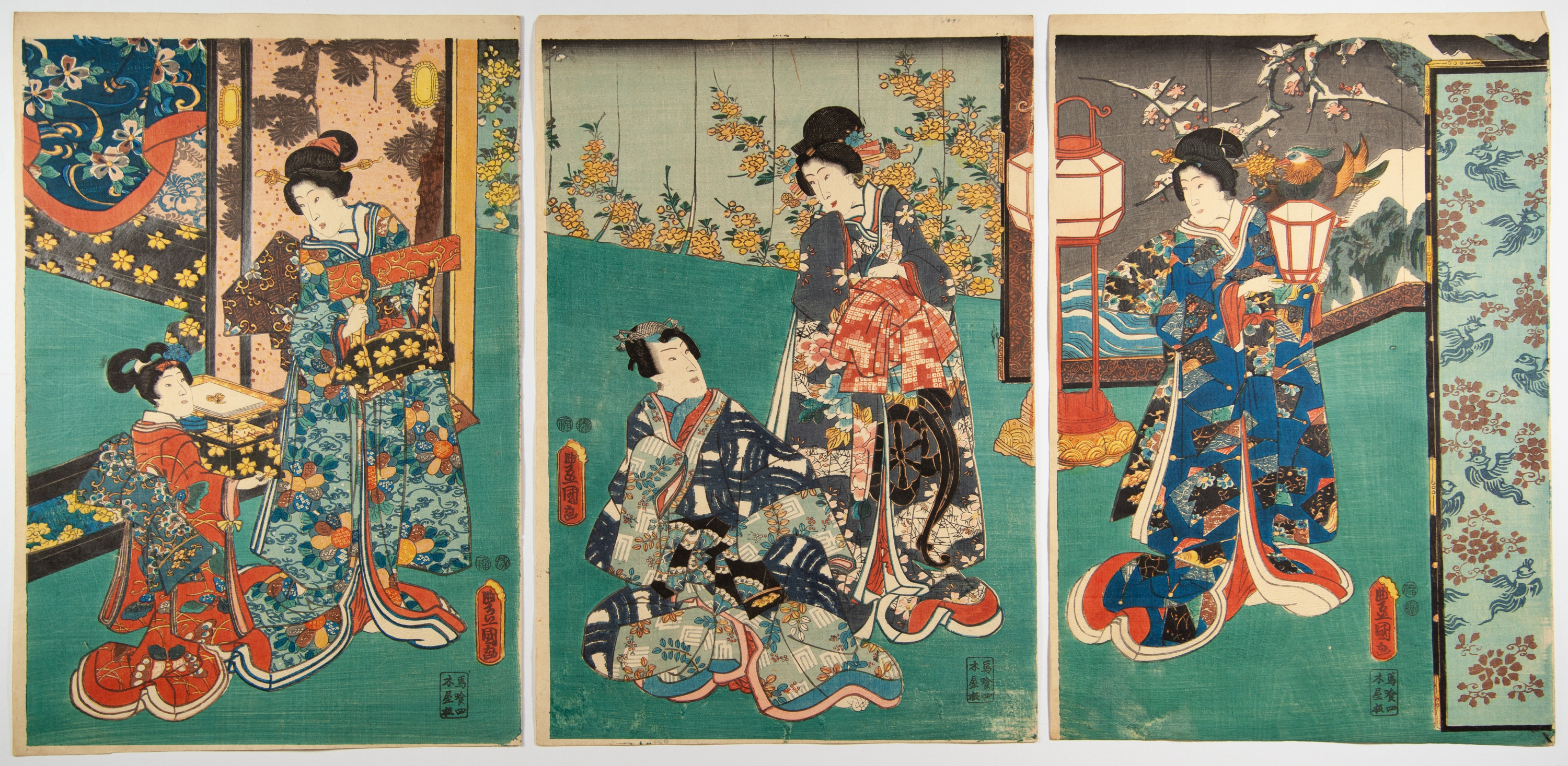 A Japanese woodblock print triptych, rendered in the Ukiyo-e style and likely dating from the Edo or early Meiji period. Each of the three panels, printed on paper, depicts elegant female figures in a domestic or garden setting. Visible textual markings, including artist’s signatures and publisher’s seals, are present on each panel.