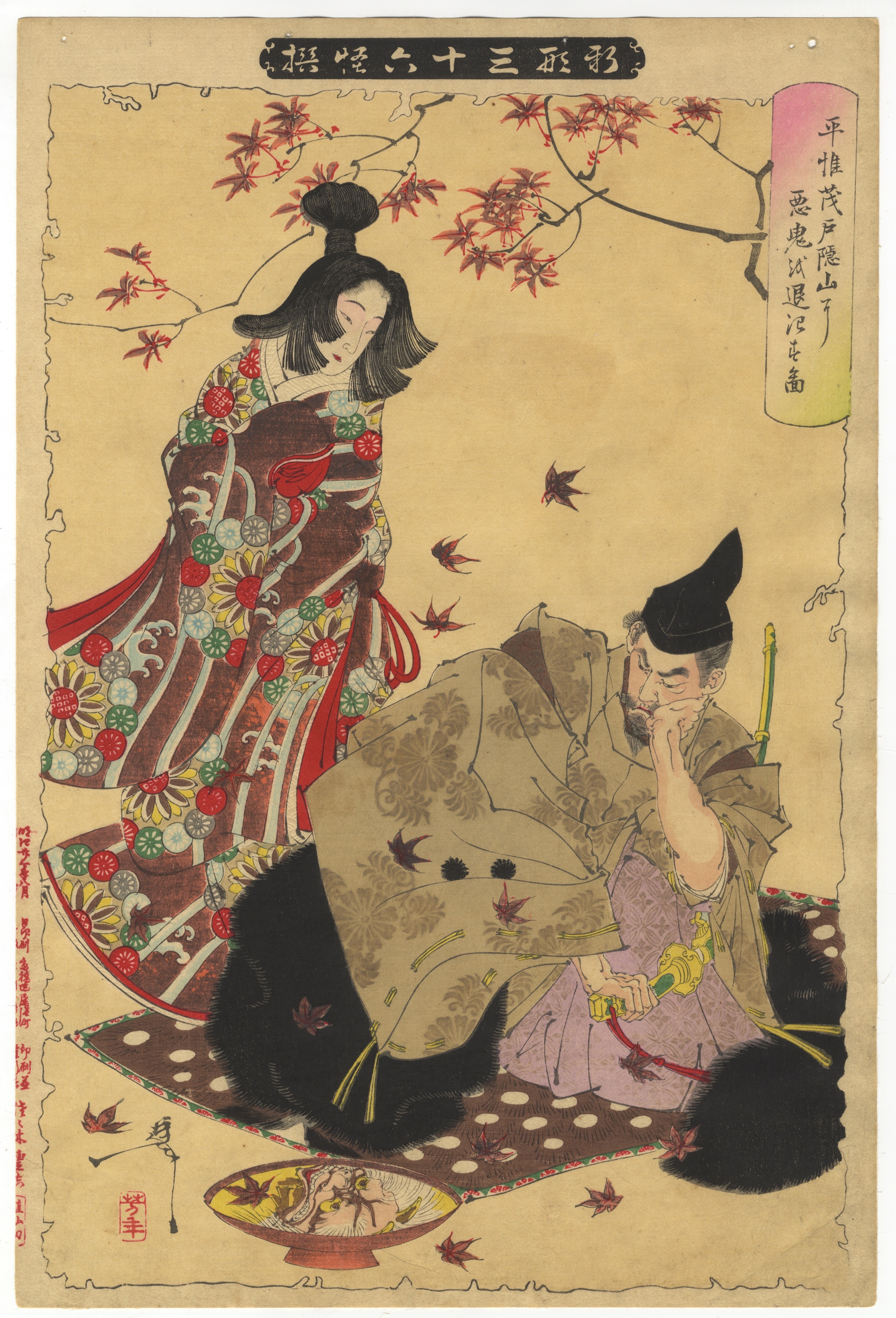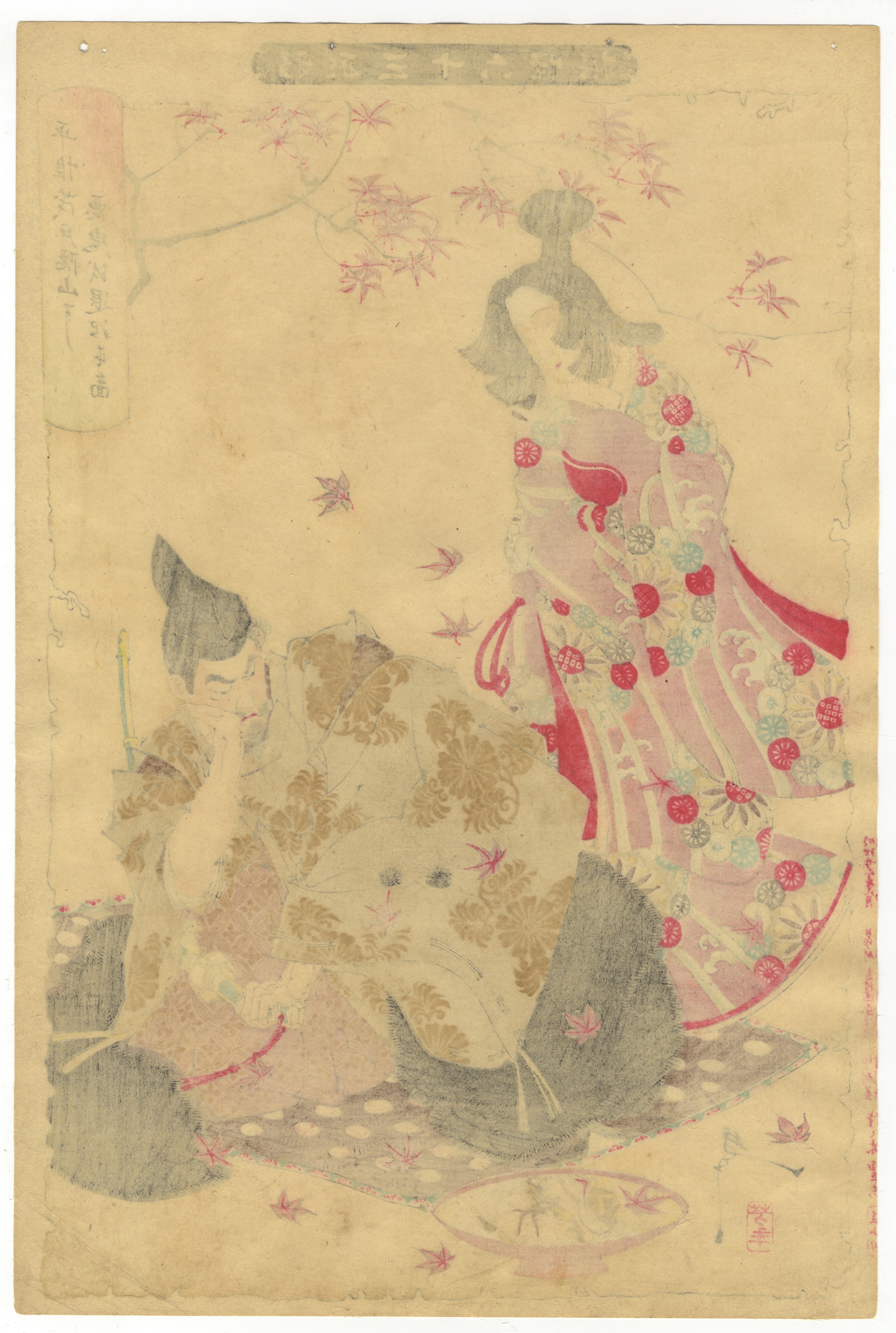 A Japanese ukiyo-e woodblock print, depicting two figures in traditional attire within a natural setting featuring autumn leaves. Printed on light brown-toned paper, it utilizes a multi-color palette for the figures’ kimonos and background details. Visible markings include Japanese characters within rectangular cartouches at the top center and right side, along with additional text and a red seal mark in the lower left quadrant.