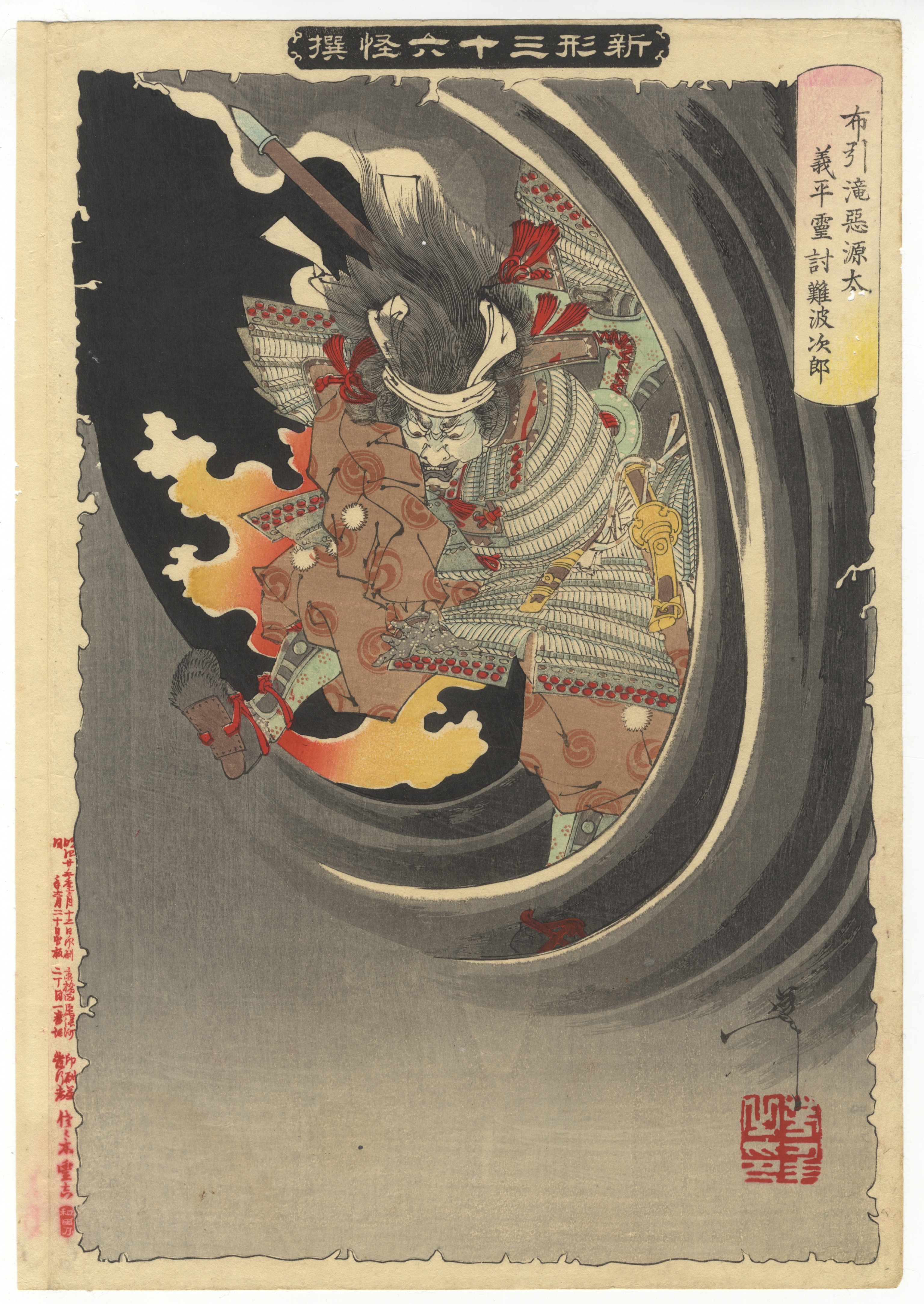 A Japanese woodblock print depicting a dynamically rendered, armored male figure wielding a spear, seemingly caught in a swirling vortex with elements of fire or energy. Textual elements are visible in a horizontal cartouche at the top center, a vertical cartouche on the right, and script along the left edge, complemented by a red seal impression in the lower right.