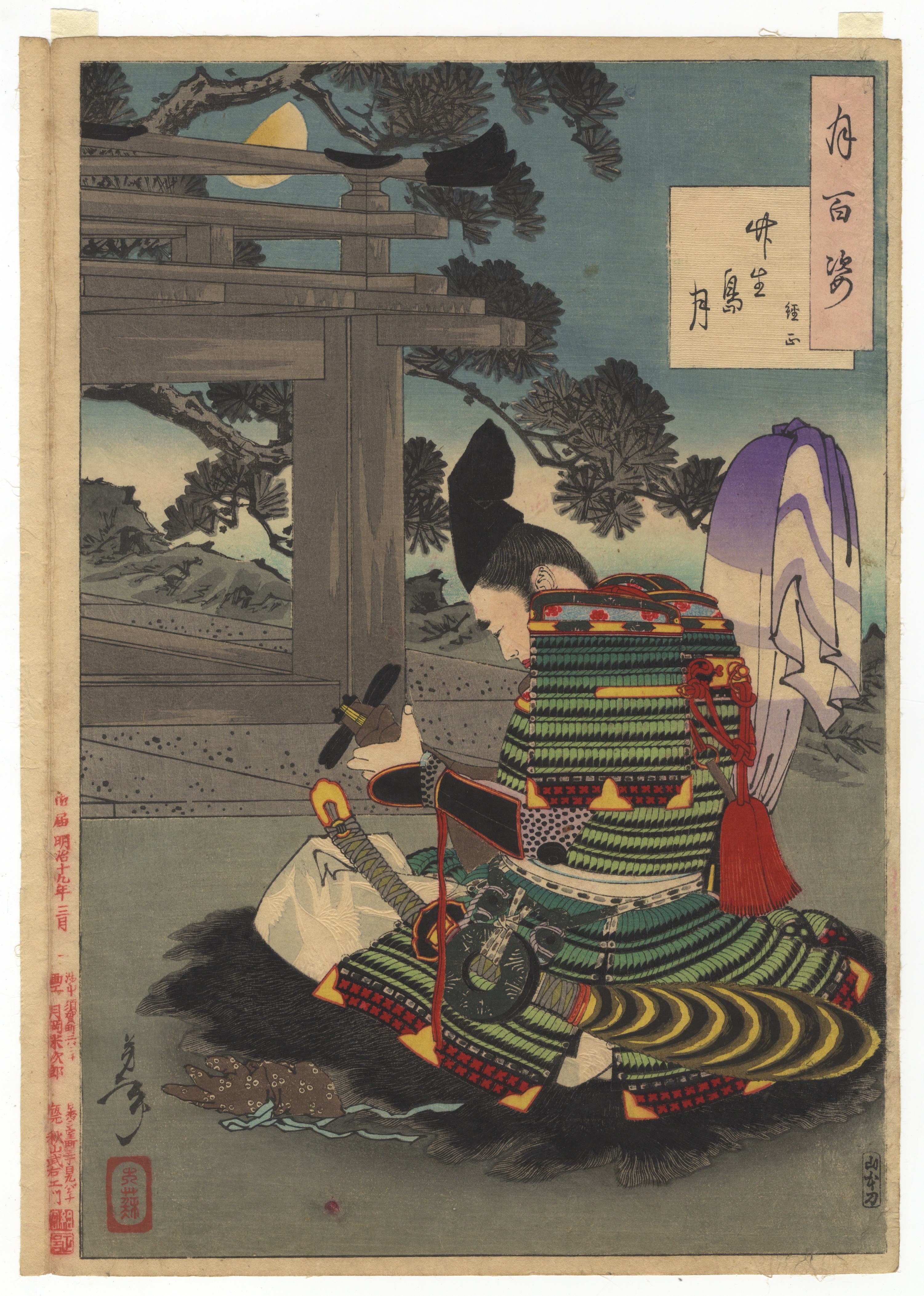 A Japanese Ukiyo-e woodblock print on paper, dating from the Ansei period (1858). The print depicts a seated samurai in intricate armor against a moonlit landscape. It features a series title cartouche ‘海百選’ (One Hundred Views of the Sea) and a scene title ‘月白御殿山’ (Moonlight at Gotenyama) on the upper right. A date inscription ‘安政五年戌午’ (Ansei 5th year) and a red seal mark are present on the lower left, accompanied by further vertical text identifying the publisher or censor.