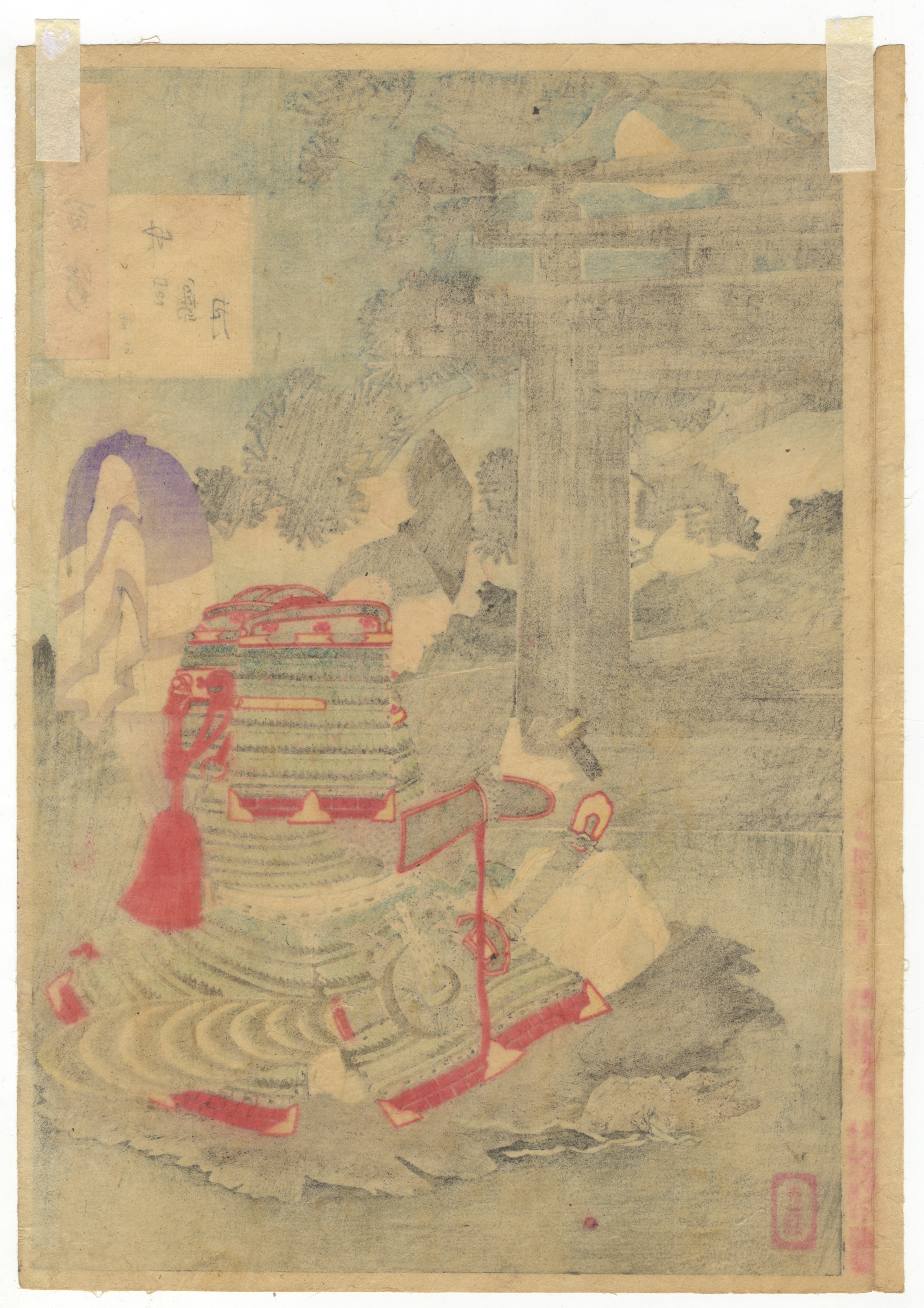 Overall paper toning. Visible staining and foxing. Pigments, particularly blues and greens, are faded. Edge wear present, with evidence of old tape residue at the top margin.