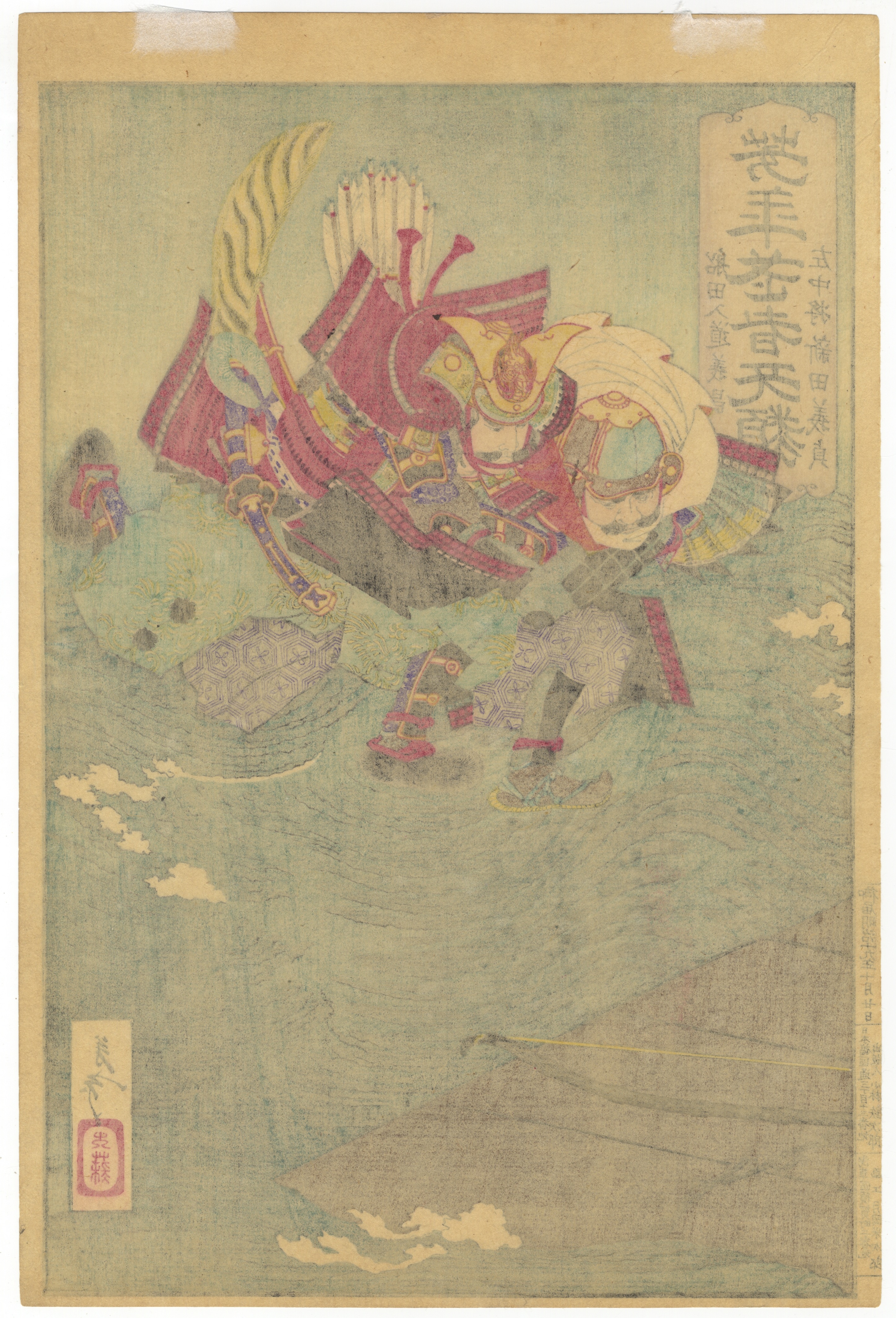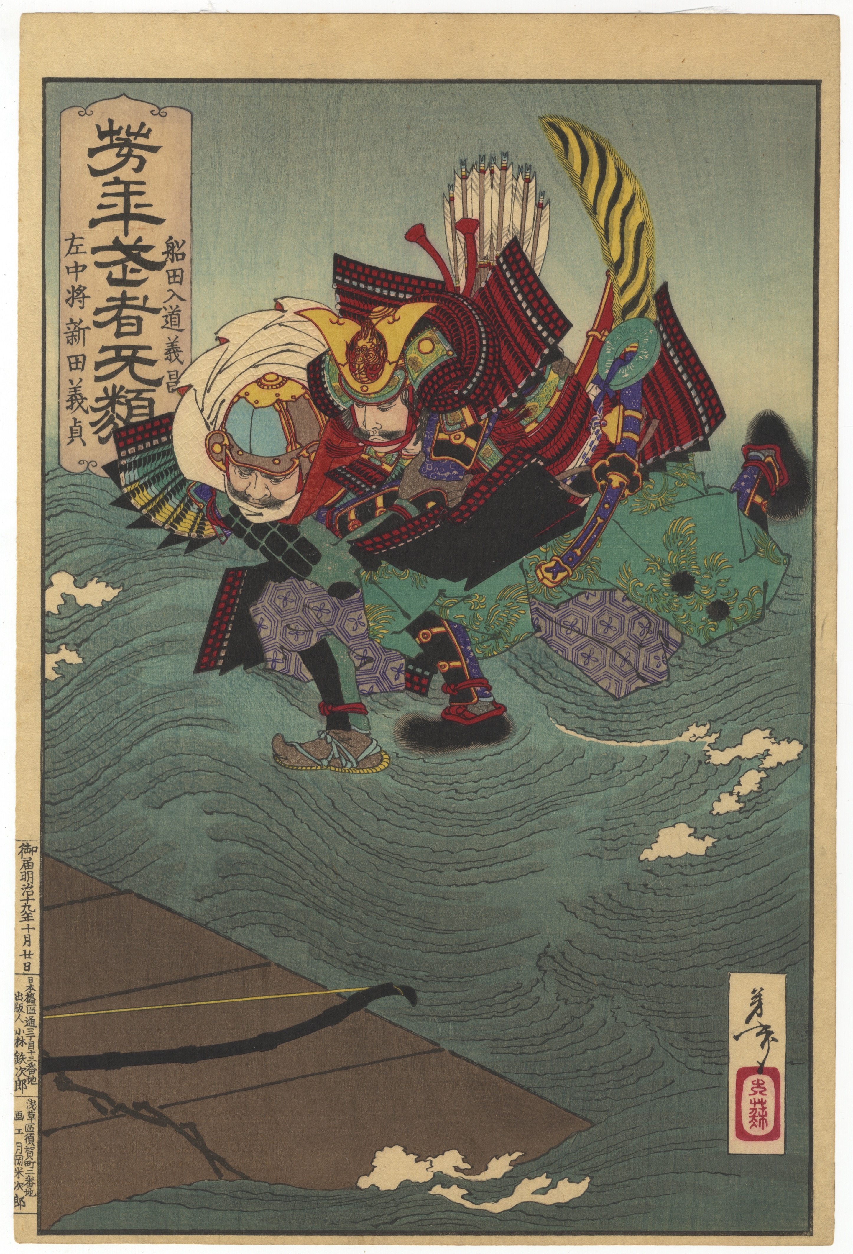 A Japanese woodblock print, rendered in the Ukiyo-e style, depicting a dynamic scene of armored figures, likely samurai, in or above turbulent water. A section of a boat and bow are visible in the lower foreground. The print features several columns of Japanese characters on the upper left and along the left margin, as well as a red cartouche containing characters in the lower right.