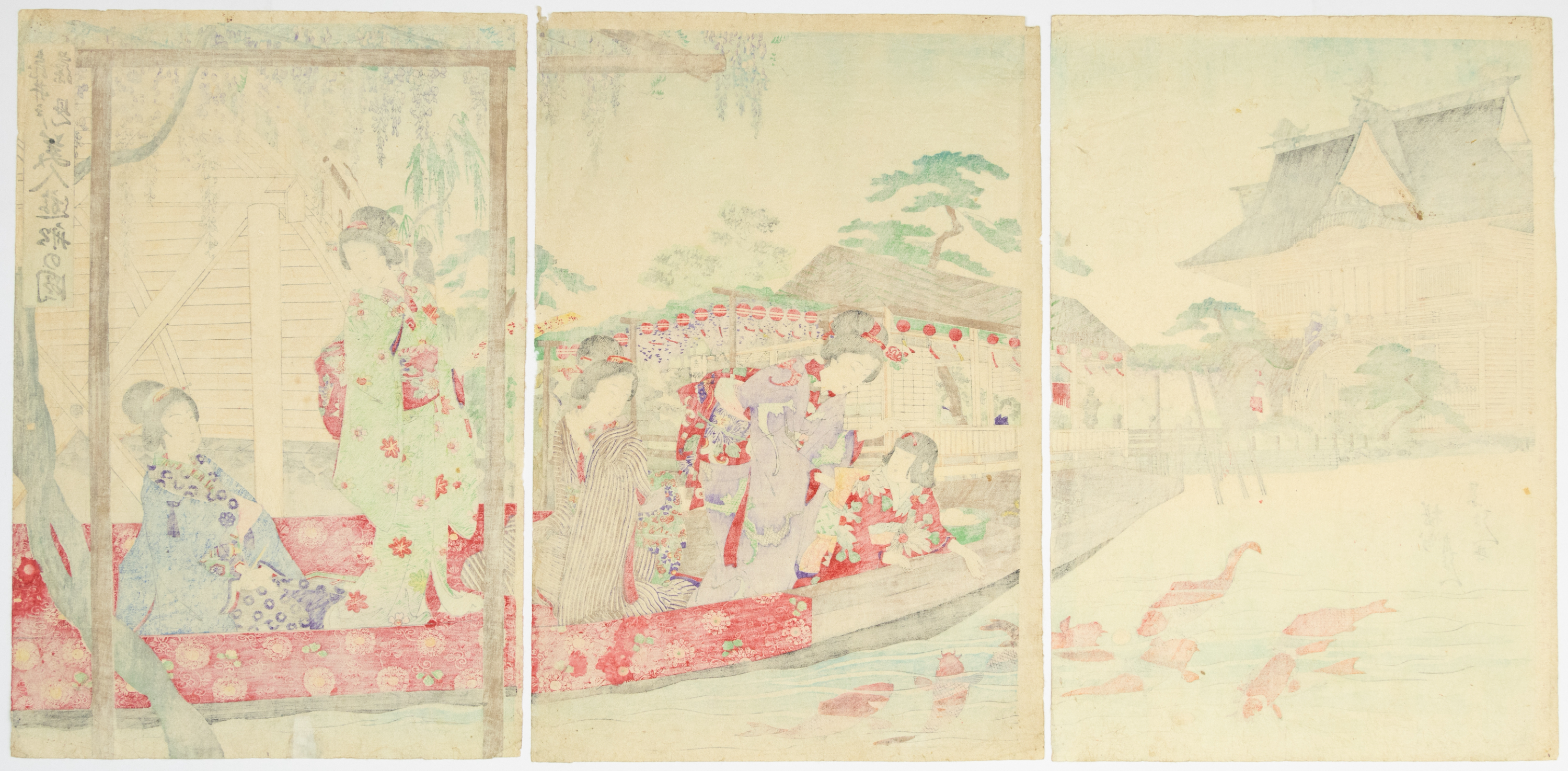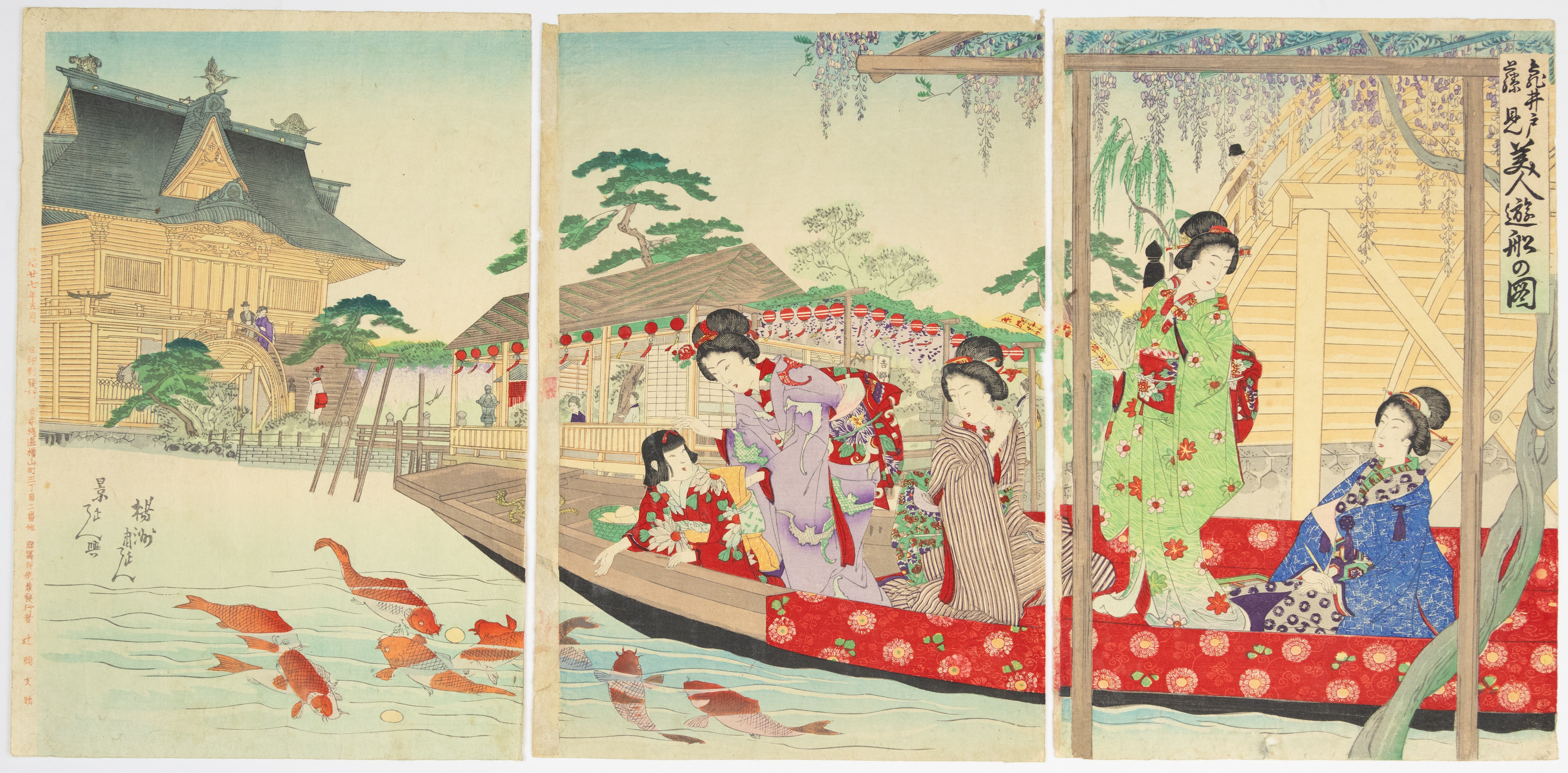 A Japanese ukiyo-e woodblock print triptych, executed on paper in multiple colors, depicting a complex scene across three vertical panels. The composition features a large, ornate temple or shrine on the left, a boat with several elaborately dressed female figures in the center, and a river or pond with koi fish, all set amidst traditional Japanese architectural and landscape elements such as wisteria, pine trees, and lanterns. Vertical script, including a series title ‘Yoshiwara bijin dōchū no zu’ (Procession of Yoshiwara Beauties), is visible along the right edge of the rightmost panel, with additional textual markings and red seals present on the left panel. Stylistically consistent with works from the late Edo or early Meiji period.