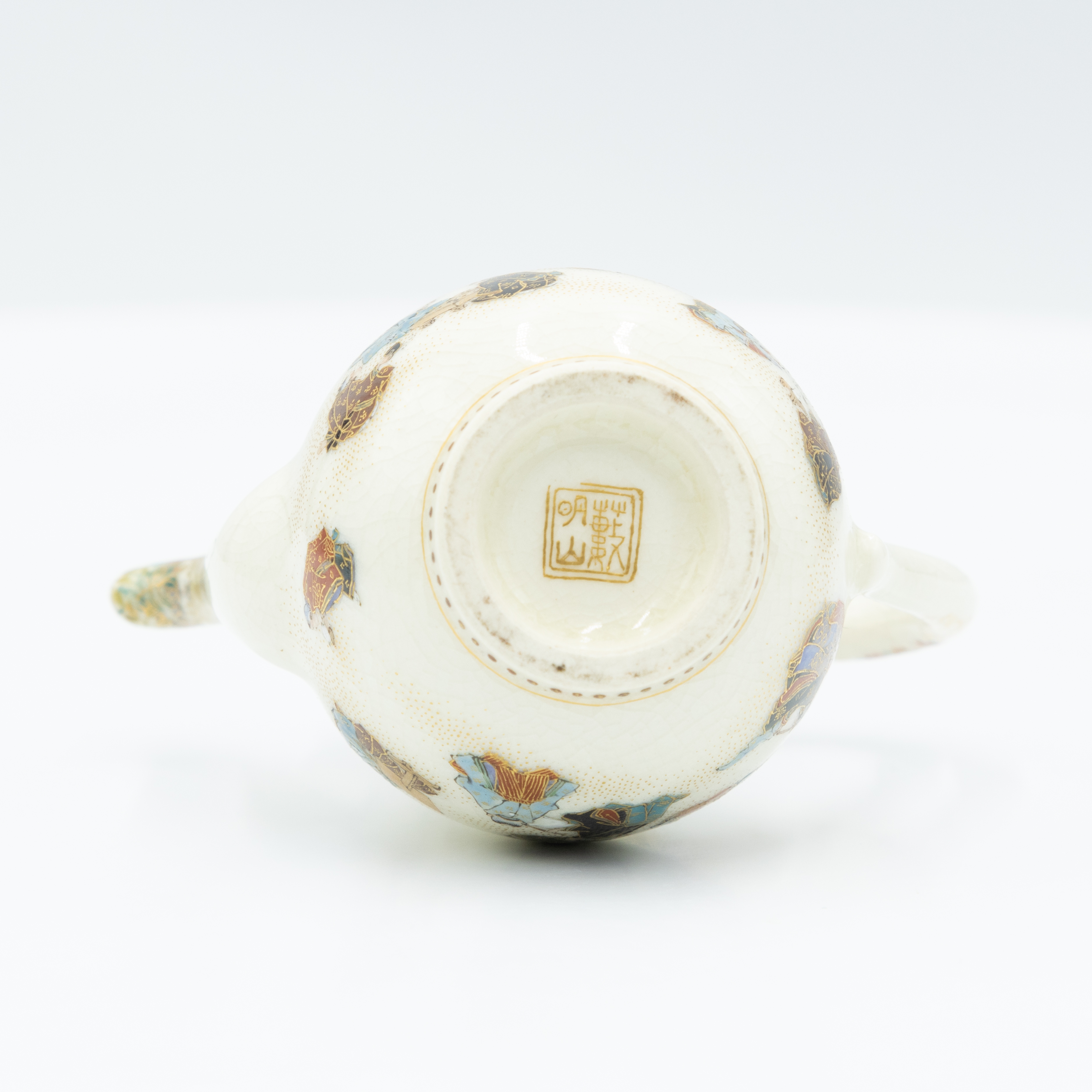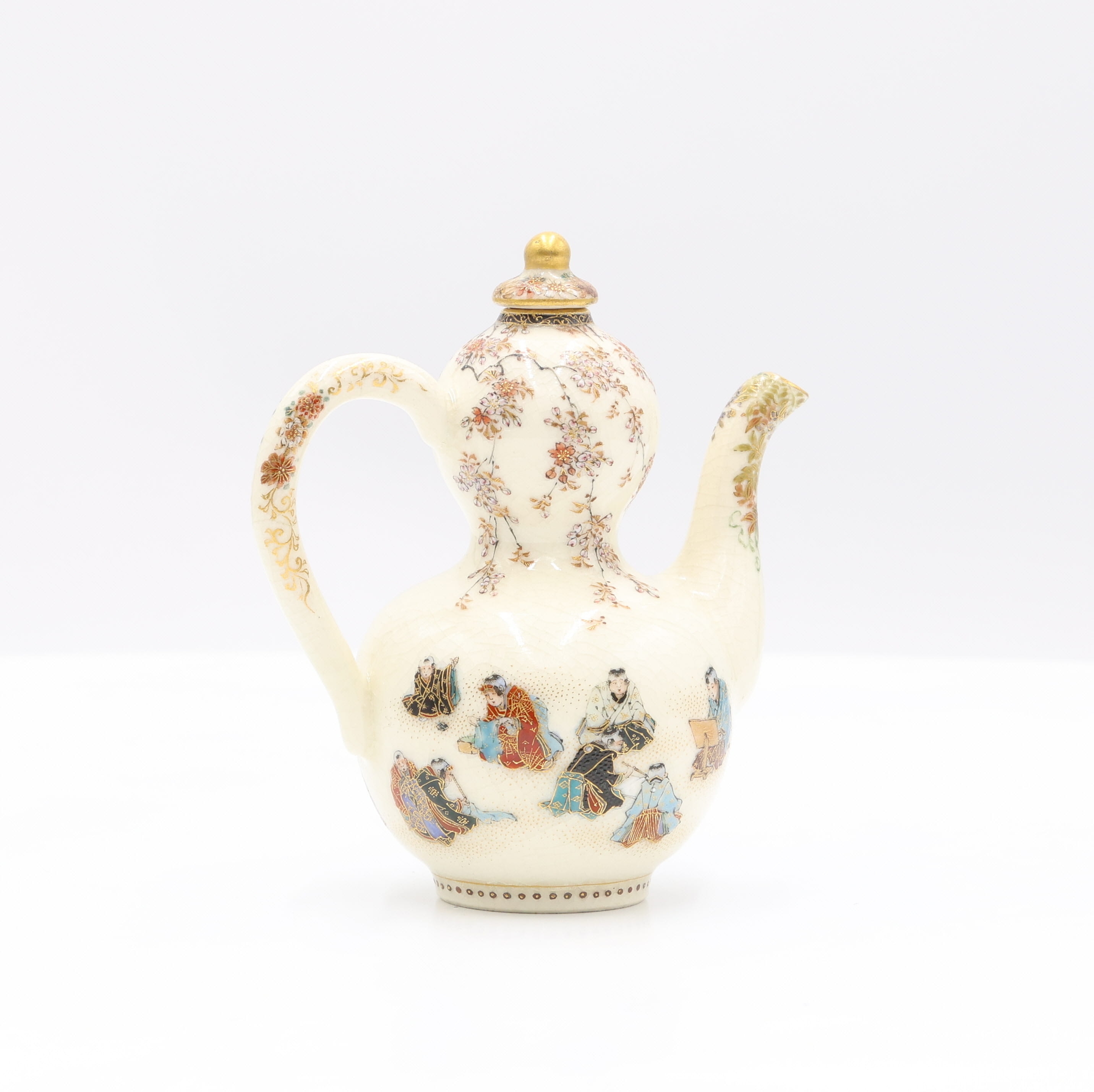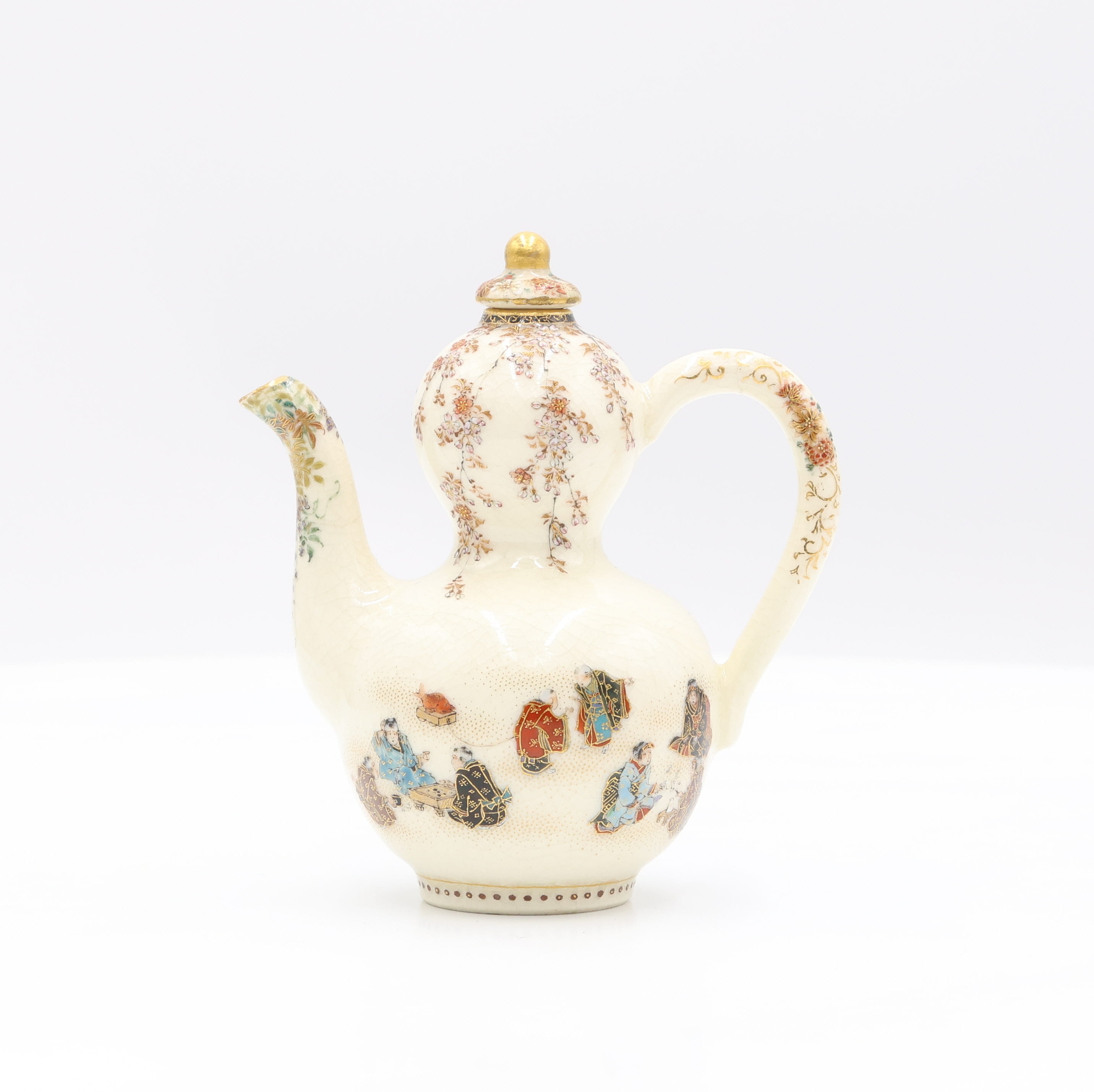 A ceramic ewer or kettle, featuring a double-gourd form with a looped handle, curved spout, and a domed lid topped with a gilded finial. The off-white body is extensively decorated with polychrome enamels and gilding. The upper section and lid display intricate floral and vine motifs, while the lower section depicts multiple figures in traditional East Asian attire against a finely stippled ground. The base bears a square, four-character seal mark in a reddish-orange hue.