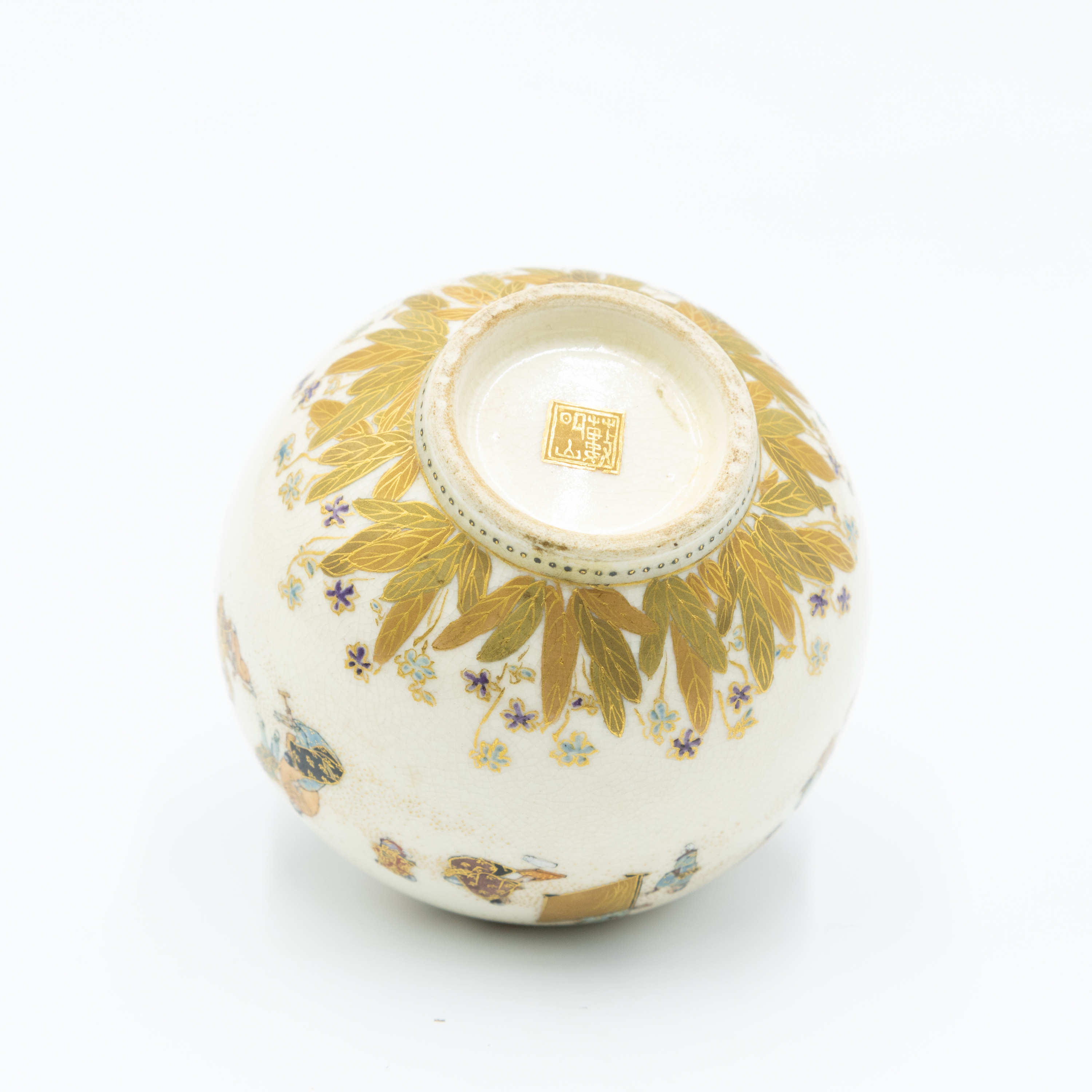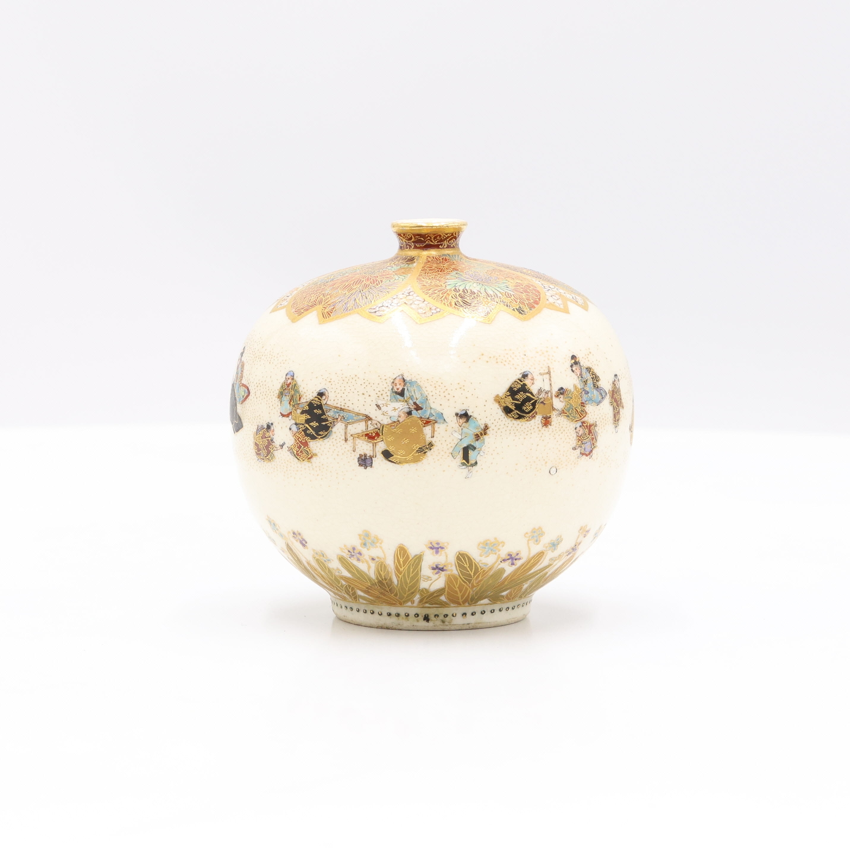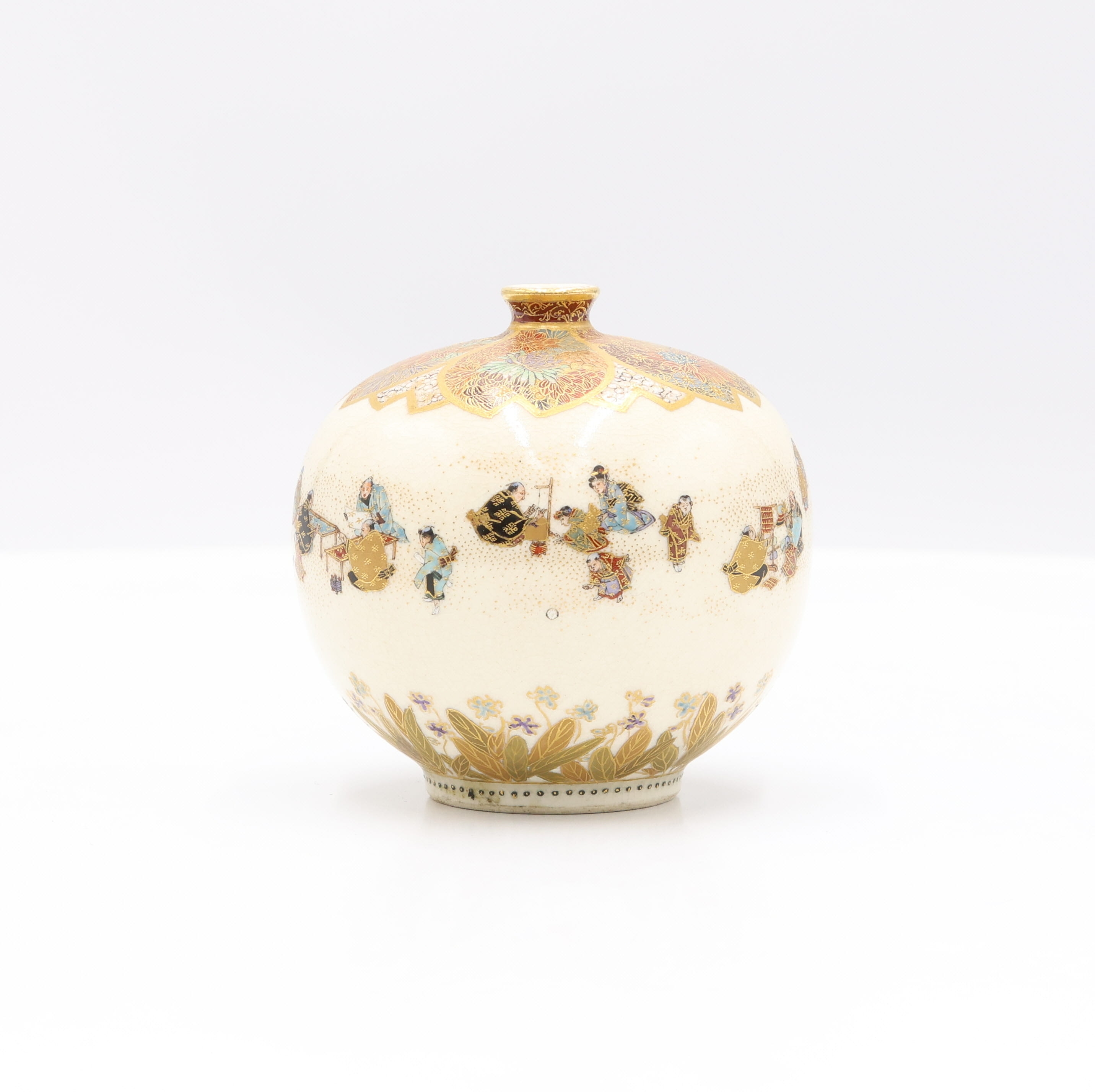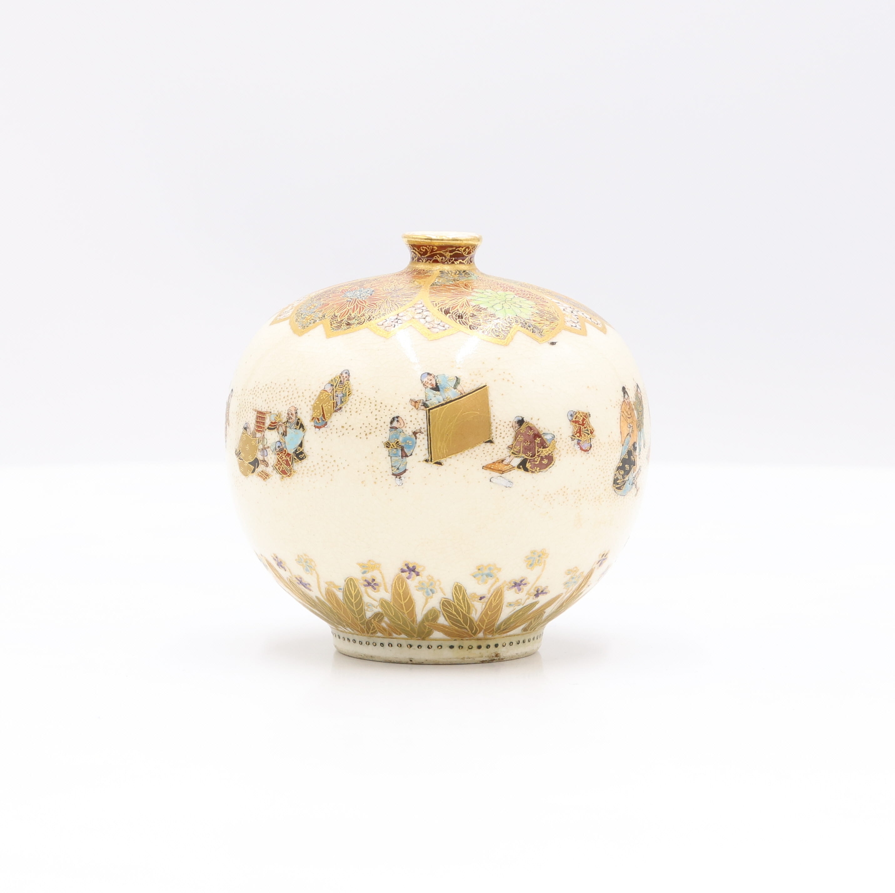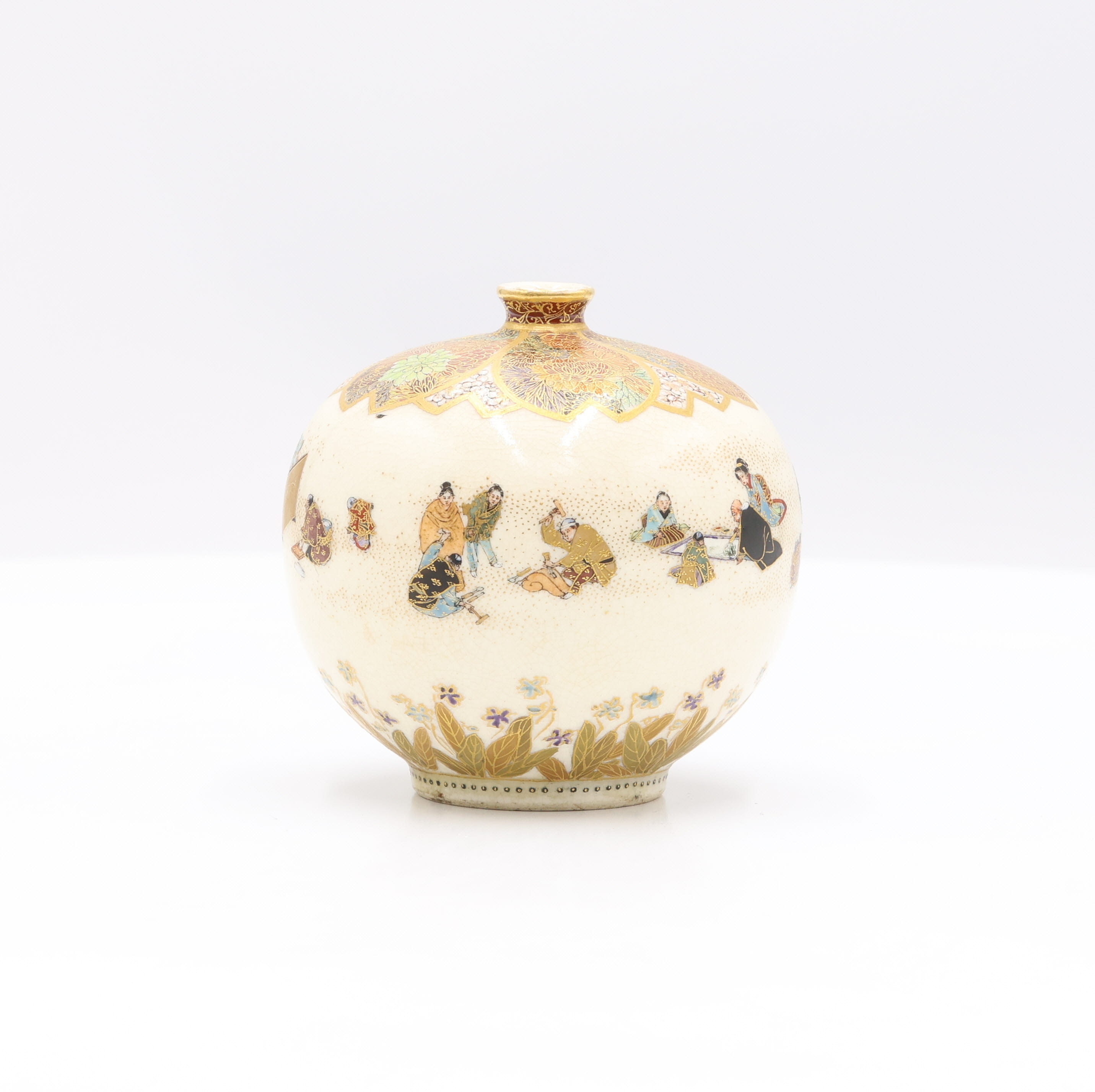 A globular ceramic vase, likely Japanese, adorned with polychrome enamels and extensive gilt decoration on a finely crackled cream-colored glaze. The main body depicts multiple figures in traditional attire set against a stippled ground, while the shoulder and short neck feature dense stylized floral or foliate patterns in gilt and various colors. The base is encircled by a band of gilded leaves and small flowers. A red square seal mark is visible on the unglazed footrim of the base.