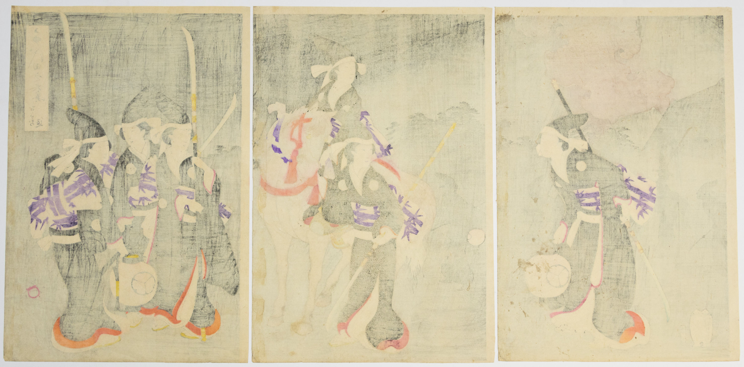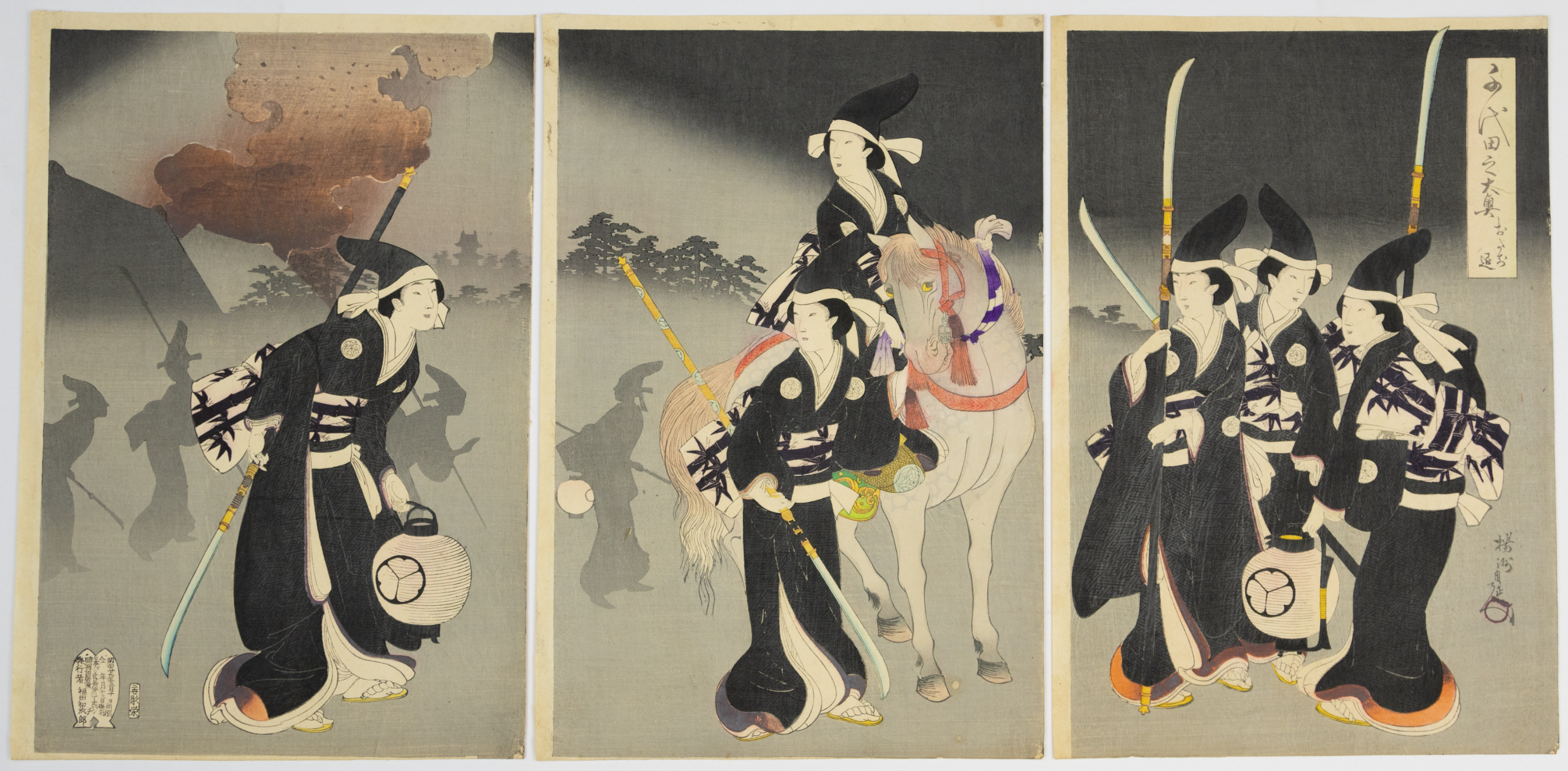 A Japanese Ukiyo-e woodblock print triptych, likely dating to the Edo period. Comprising three vertical panels, the prints depict a procession scene featuring multiple figures in traditional attire, some holding lanterns or weapons, with one figure mounted on a horse. The scene is set against a dark, atmospheric background with subtle landscape elements. Each panel features vertical Japanese text, and a red seal-like mark is visible on the lower left of the leftmost print.