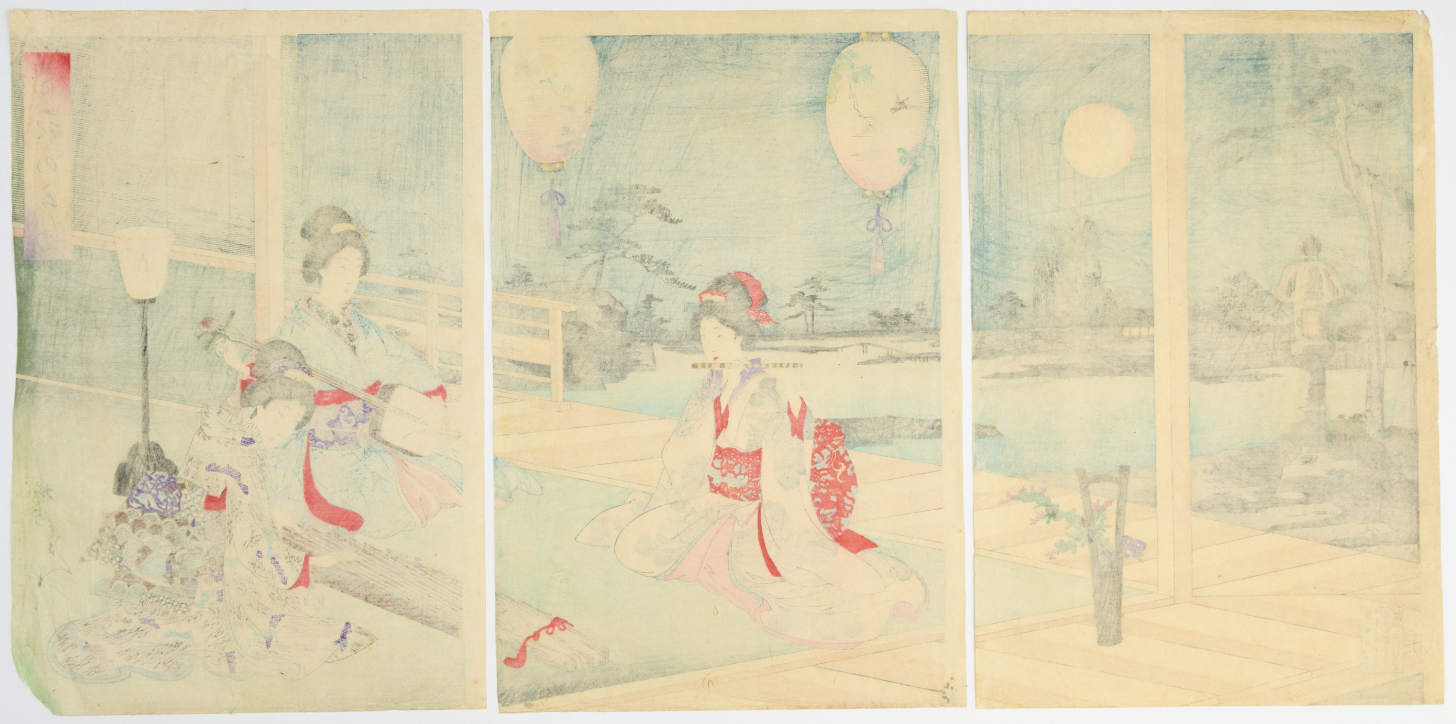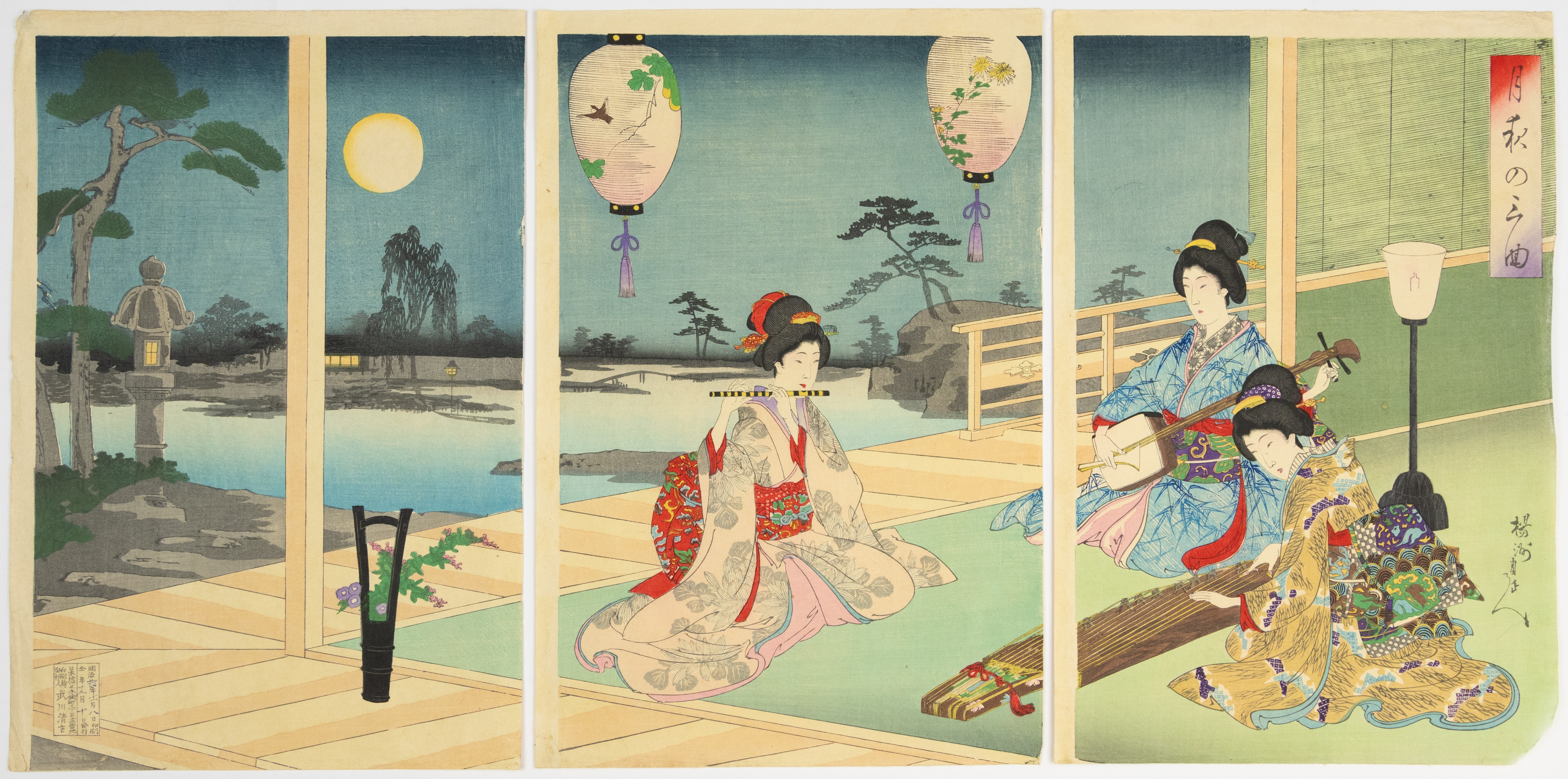 A Japanese Ukiyo-e woodblock print triptych on paper. The composition depicts a genre scene of women in a moonlit garden and an adjacent interior setting, engaged in musical performance and contemplation. Visible markings include artist signatures and seals on the lower left of the left panel and lower right of the right panel. Vertical inscription blocks are present on the upper left of the left panel and upper right of the right panel, likely indicating titles or series information.