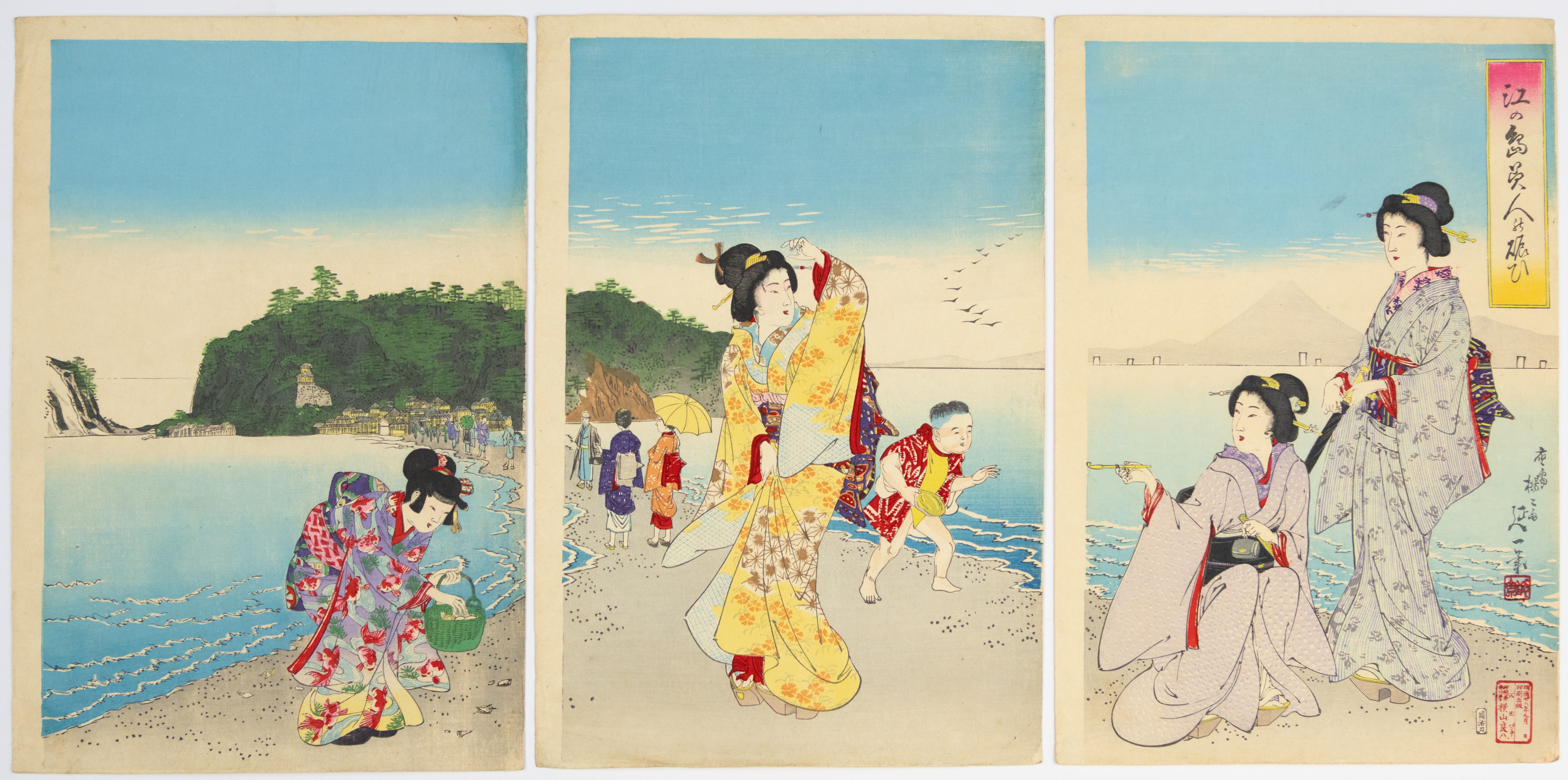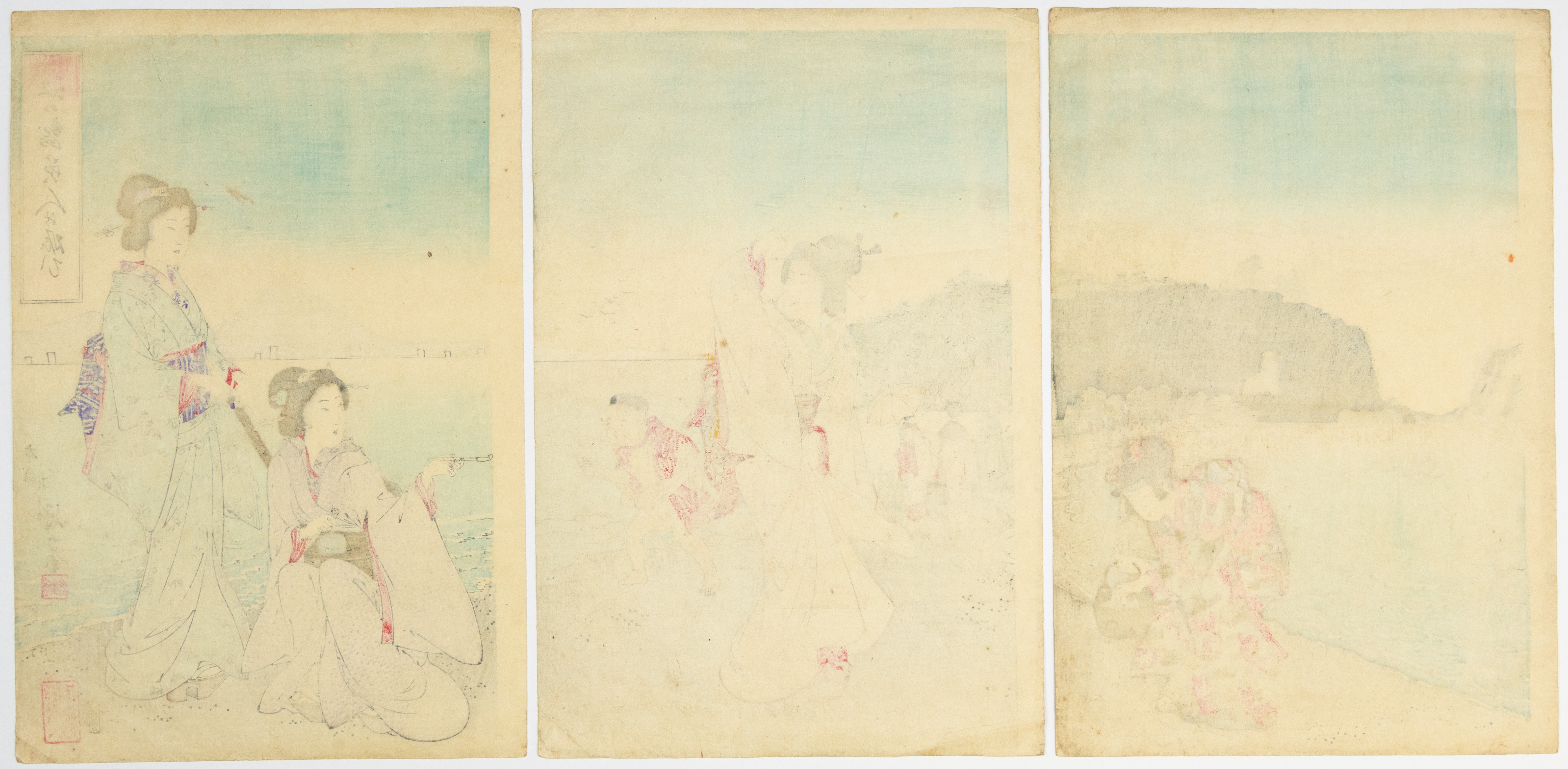 A Japanese woodblock print triptych, executed in the Ukiyo-e style, likely dating from the Edo or Meiji period. The three panels collectively depict a seaside leisure scene featuring figures, primarily women and children in traditional attire, by the water’s edge, with a prominent island to the left and distant mountains, possibly Mount Fuji, to the right. Rendered with polychrome inks on paper, the rightmost panel exhibits a vertical cartouche with red and black text, along with two red seals.