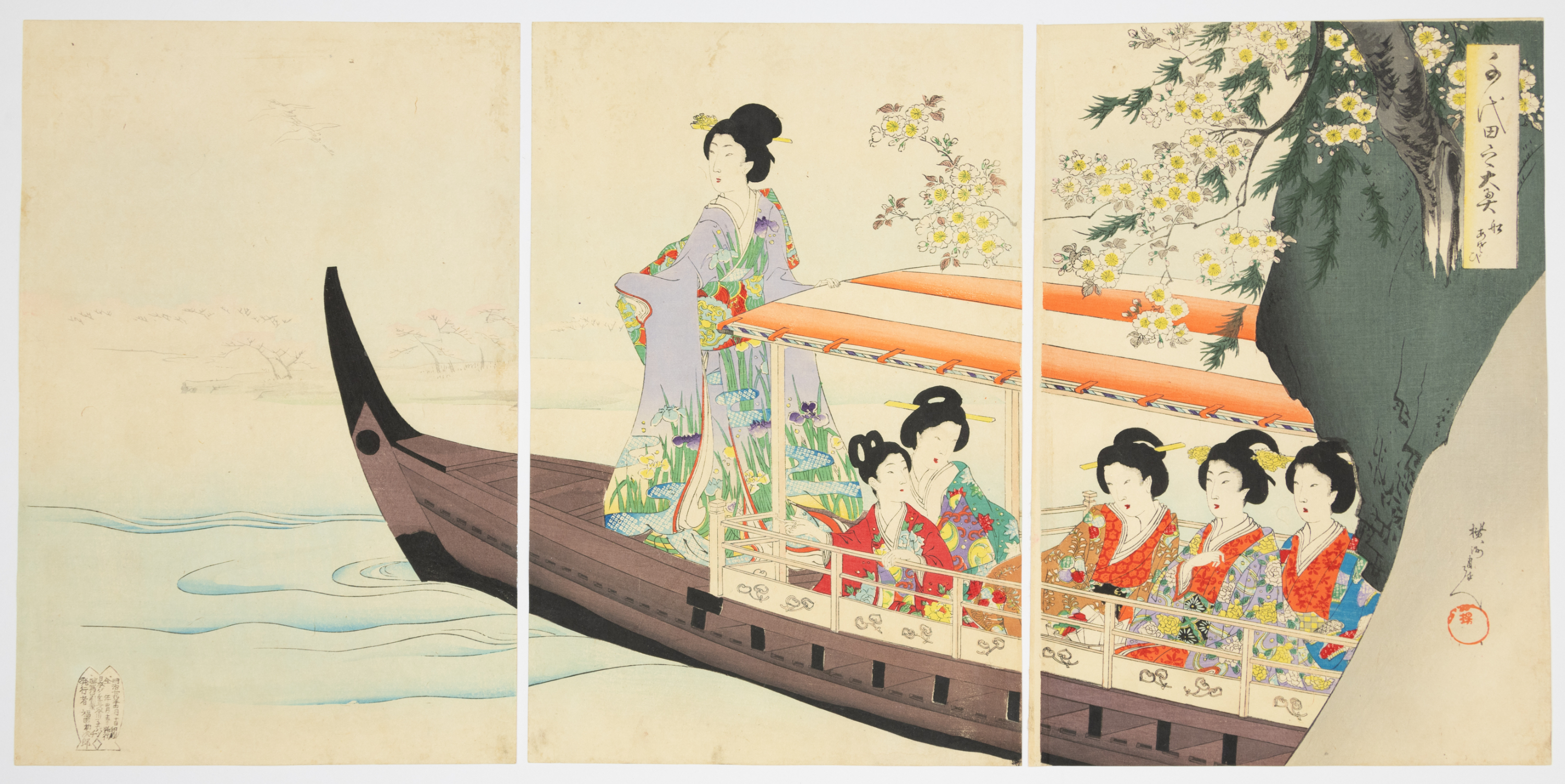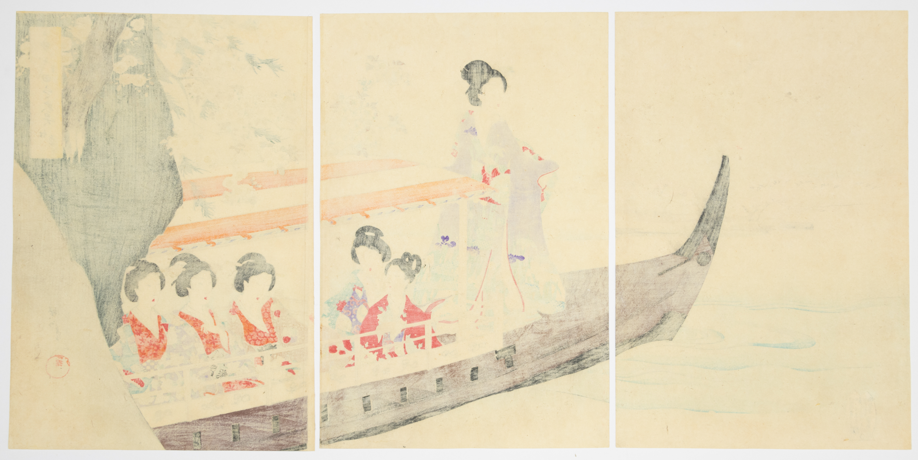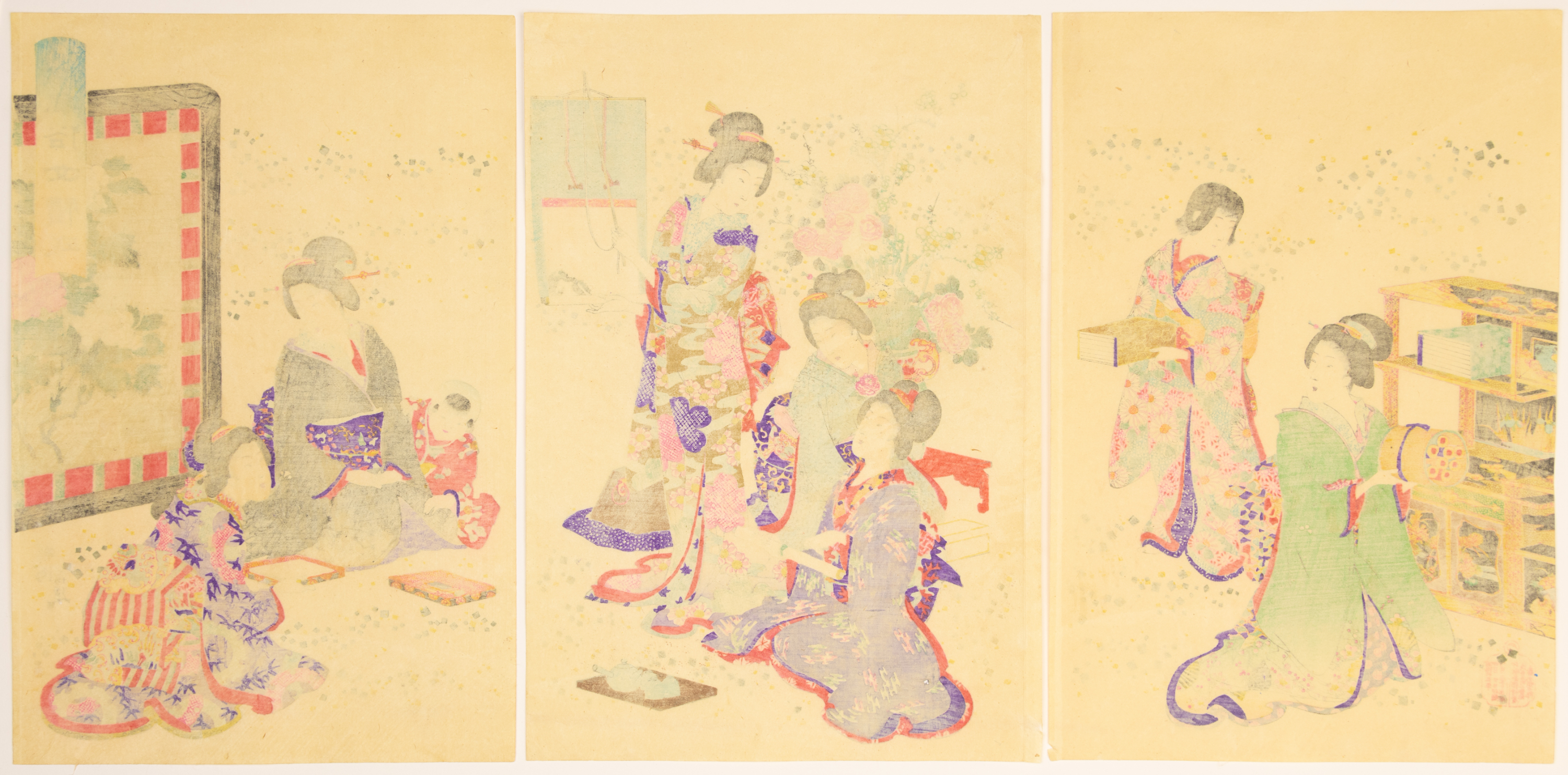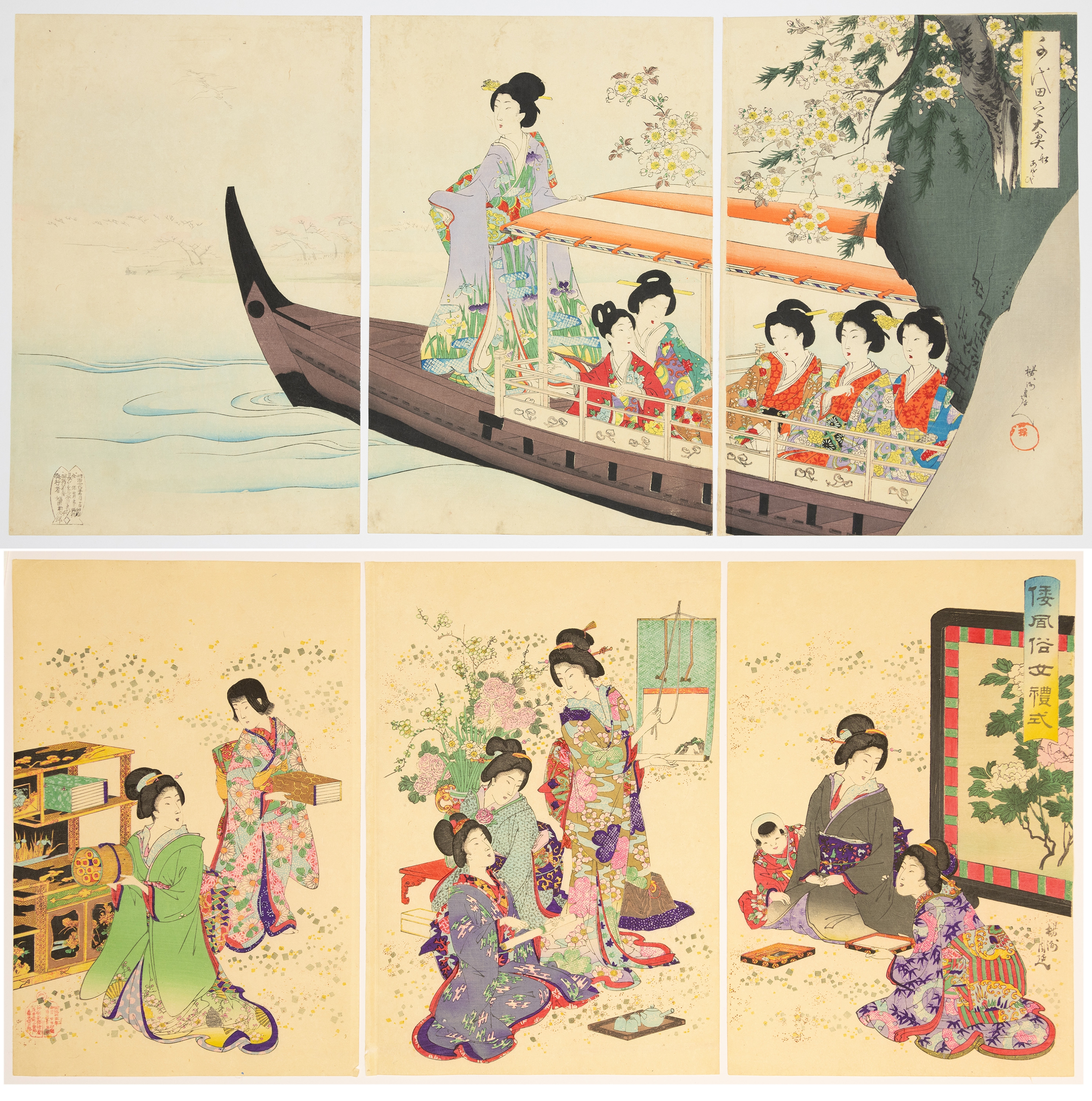 This lot comprises two distinct Japanese woodblock print triptychs, each composed of three vertical panels. Executed in the ukiyo-e style, characteristic of the Edo or Meiji period, the prints feature multi-color inks on paper. The upper triptych depicts women in traditional attire on a pleasure boat navigating a waterway. The lower triptych illustrates women engaged in various indoor or garden activities, including a tea ceremony and reading. Visible markings include Japanese characters within vertical text blocks and red seals/cartouches, predominantly in the upper right and lower left corners of the panels.