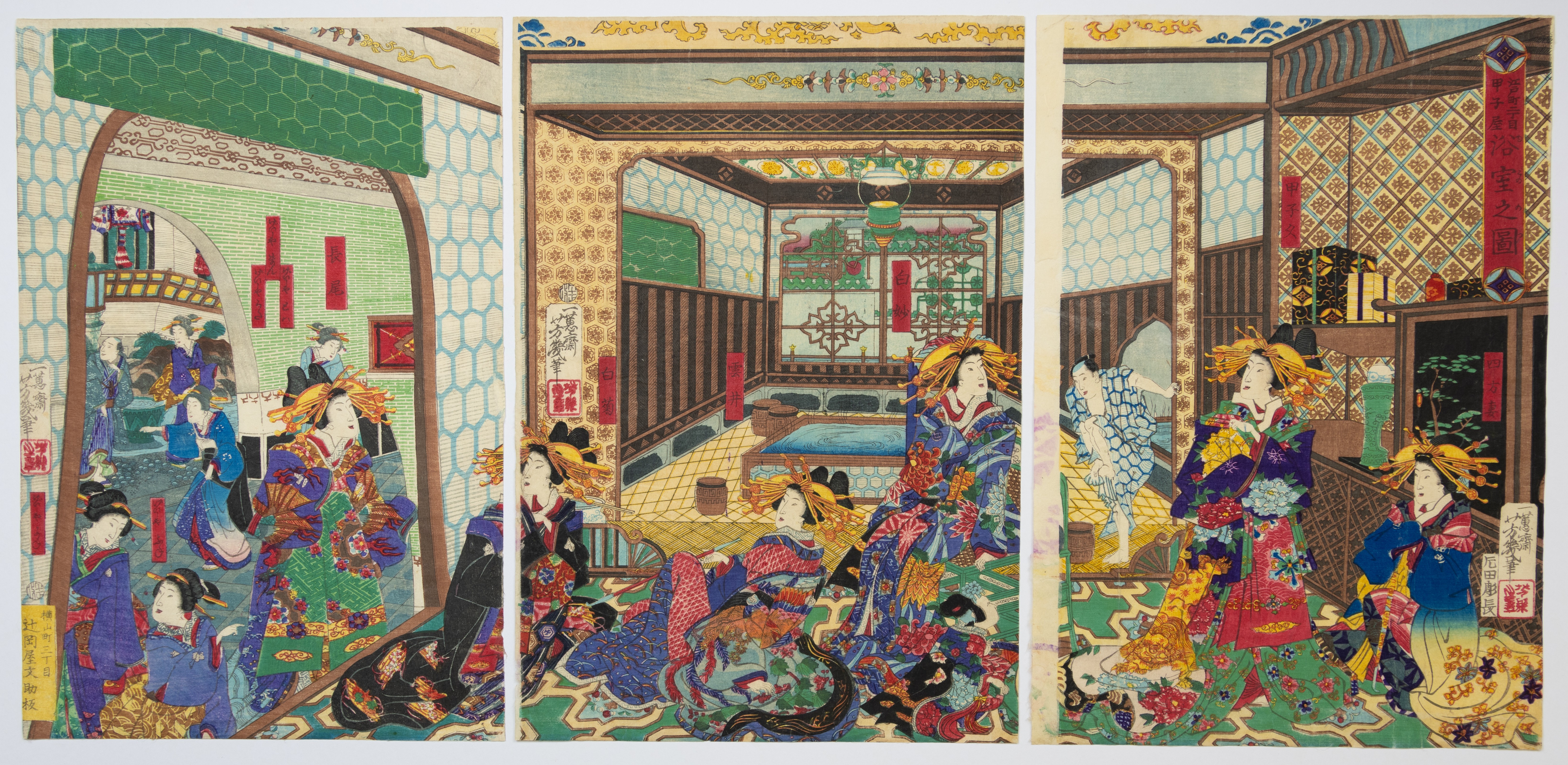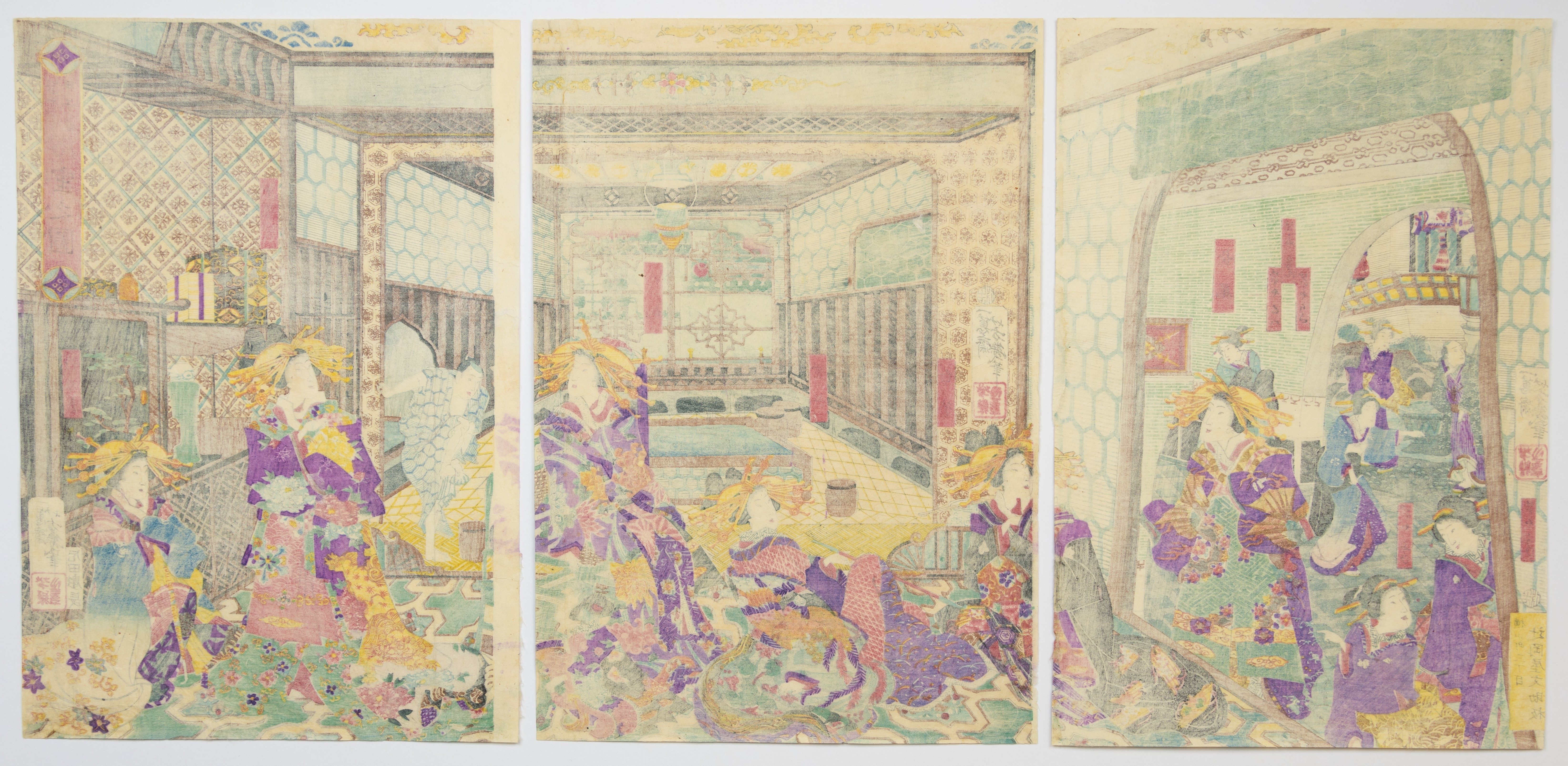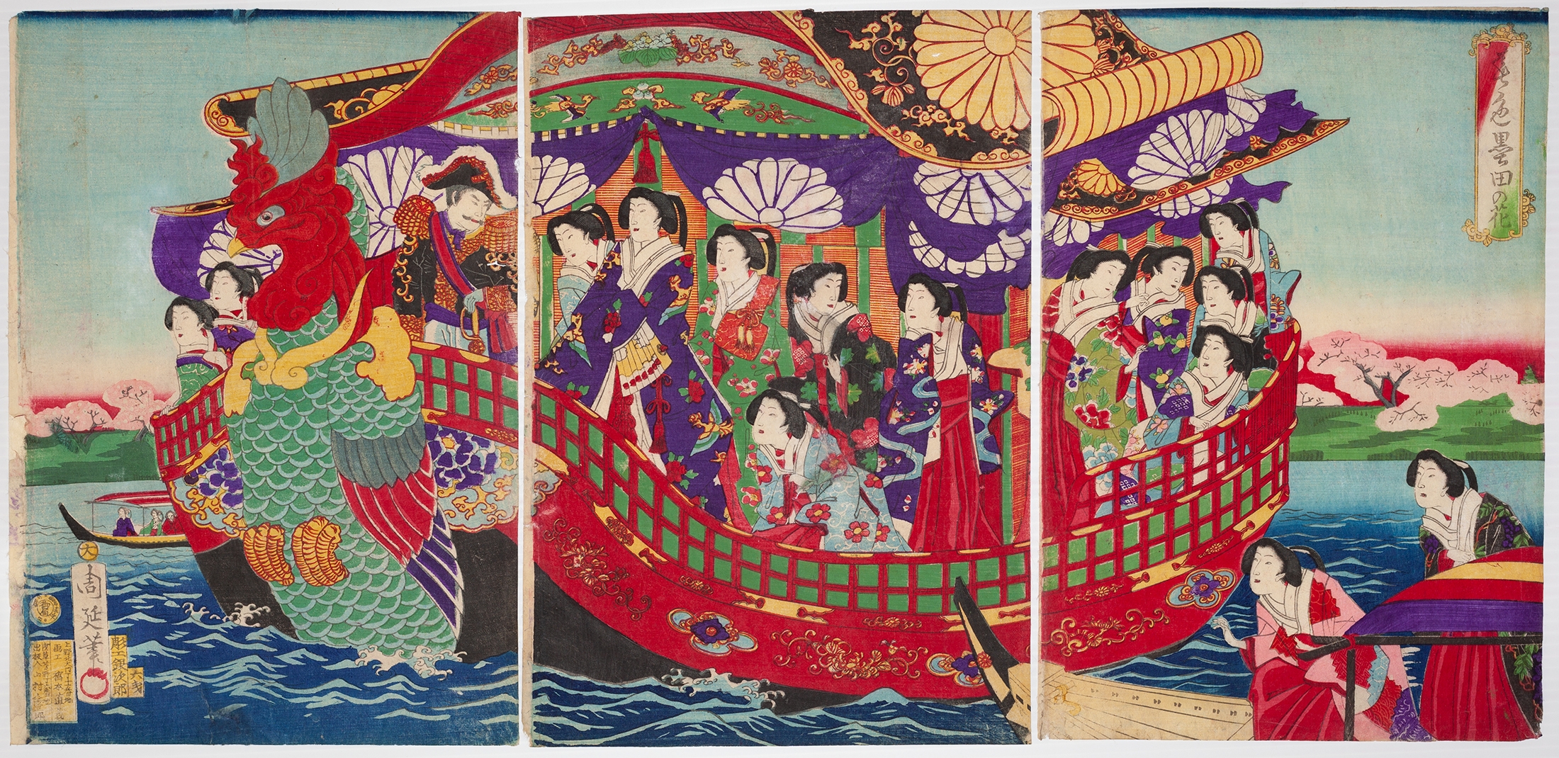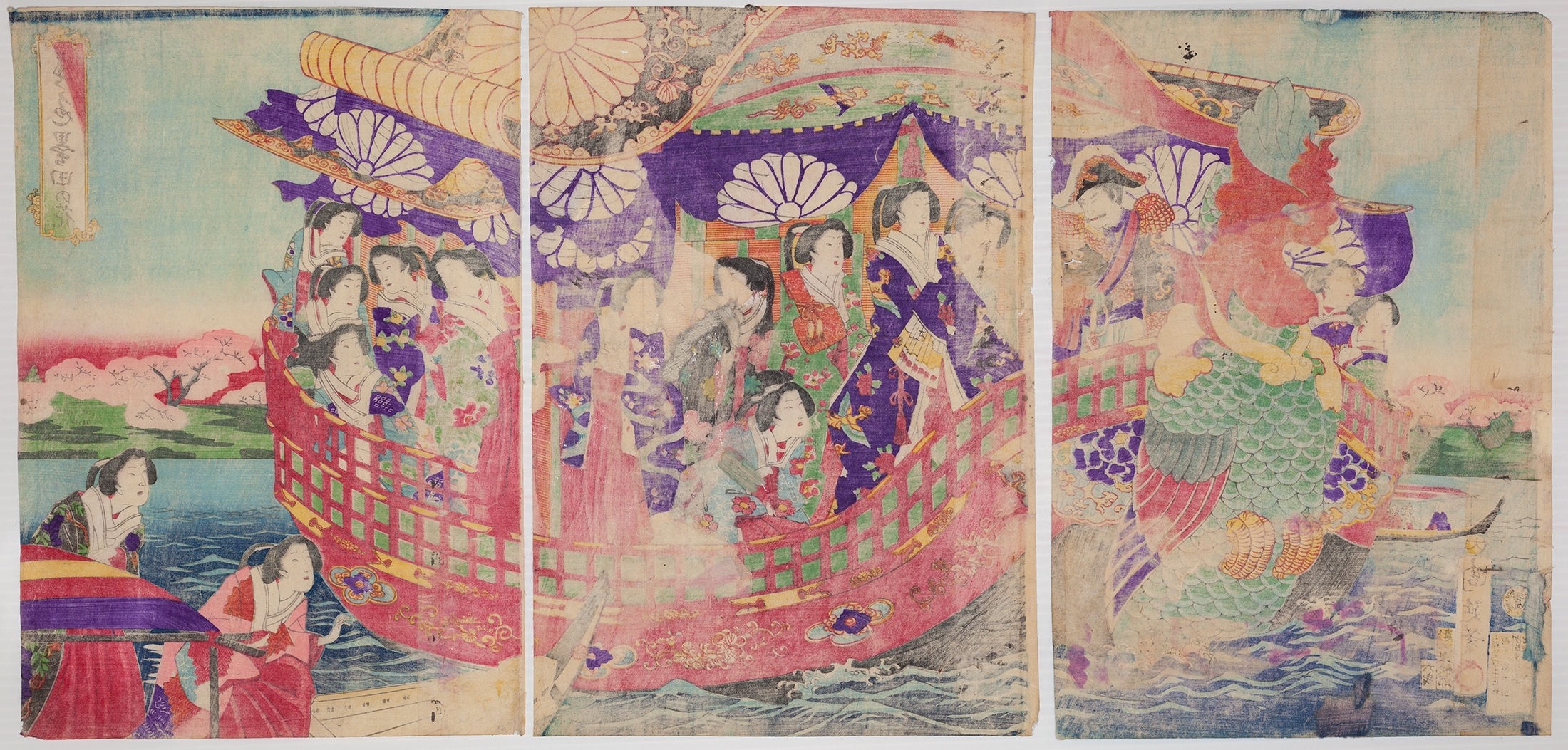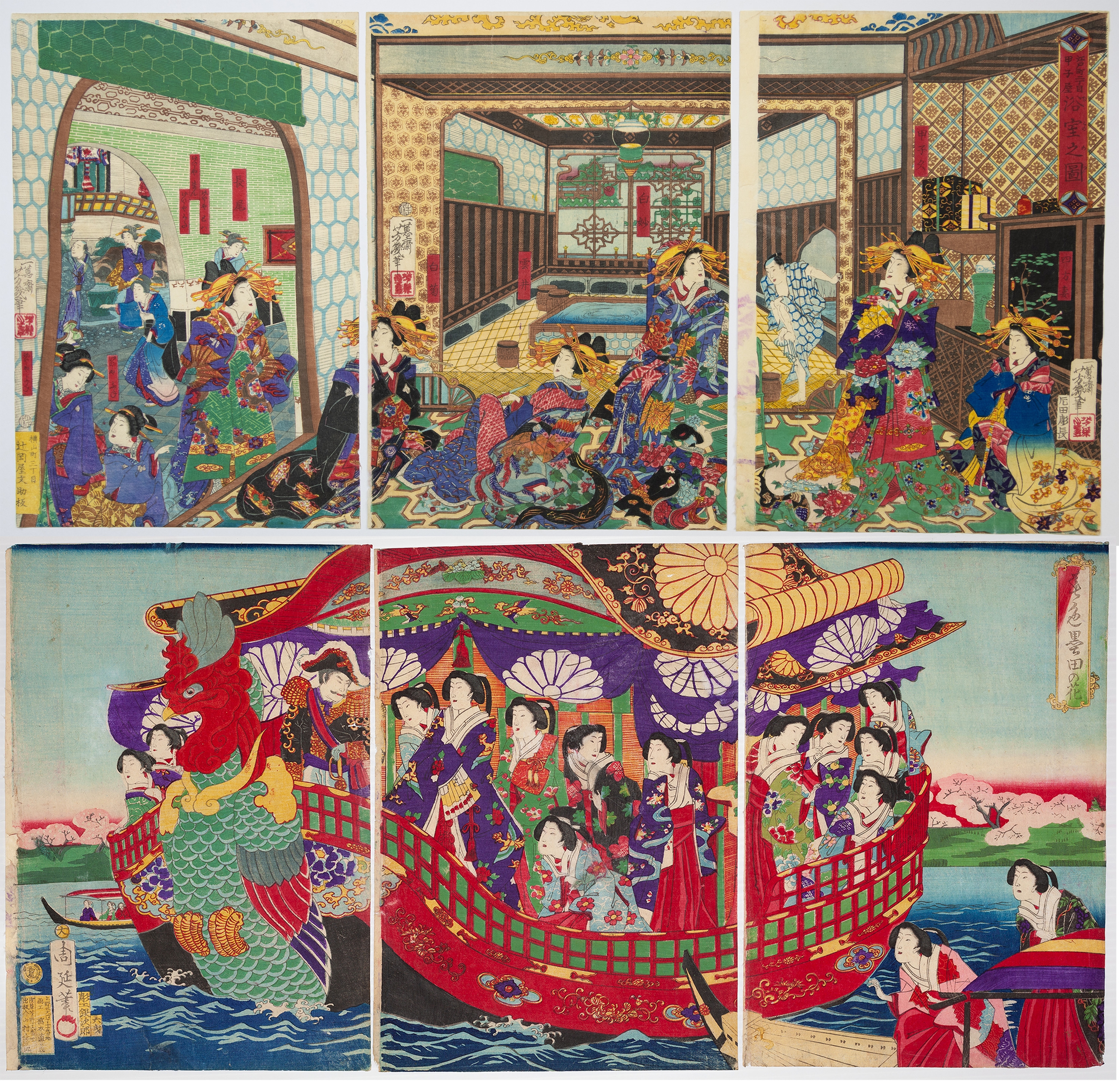 The item comprises two Japanese woodblock print triptychs on paper. The upper triptych depicts an elaborate interior scene with multiple figures in traditional dress. The lower triptych illustrates a large, ornate boat with a dragon figurehead, carrying numerous individuals on water amidst a cherry blossom landscape. Both sets exhibit characteristics of Ukiyo-e style, likely dating to the 19th century. Various Japanese textual markings and seals are visible in the margins.