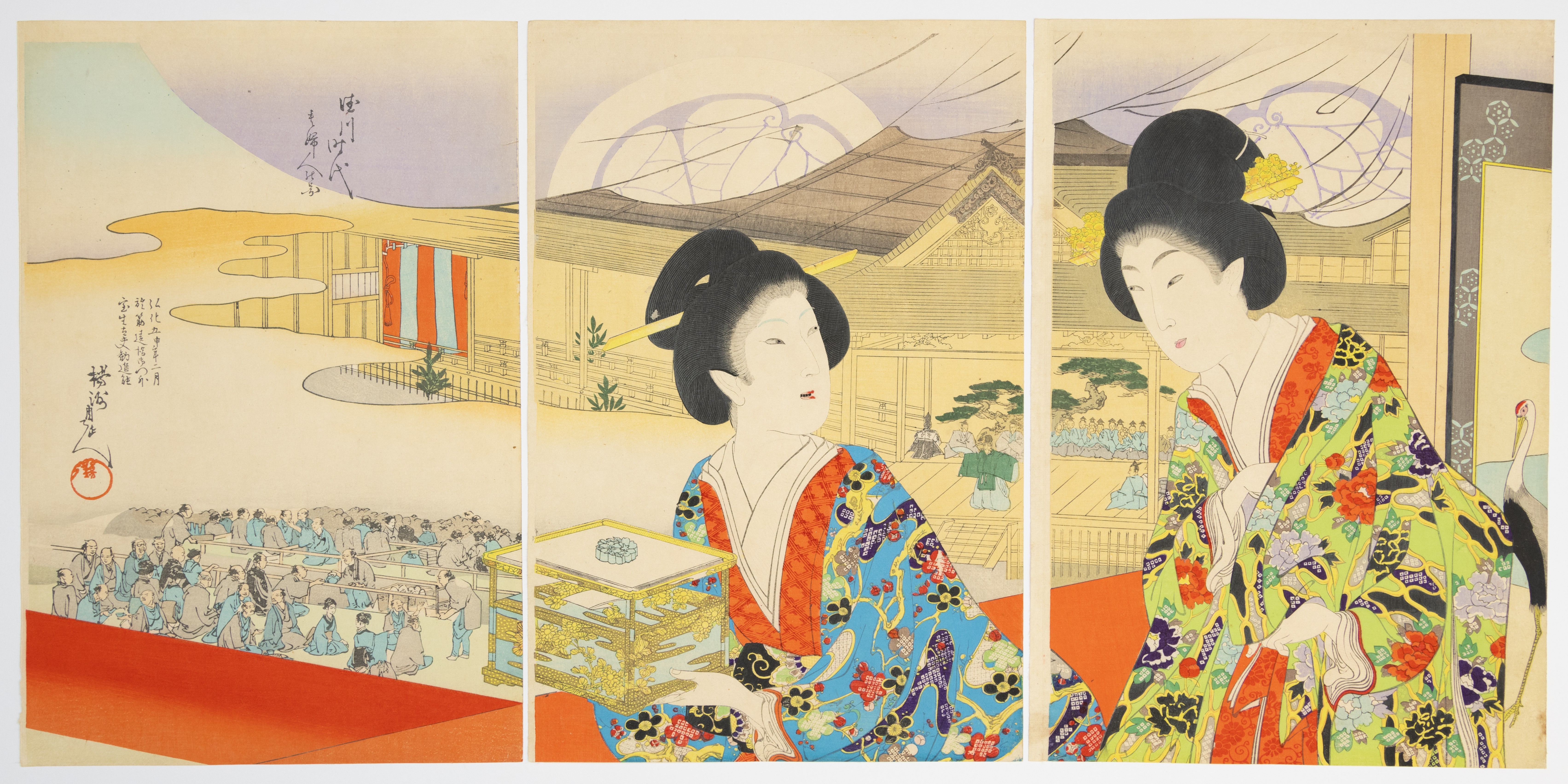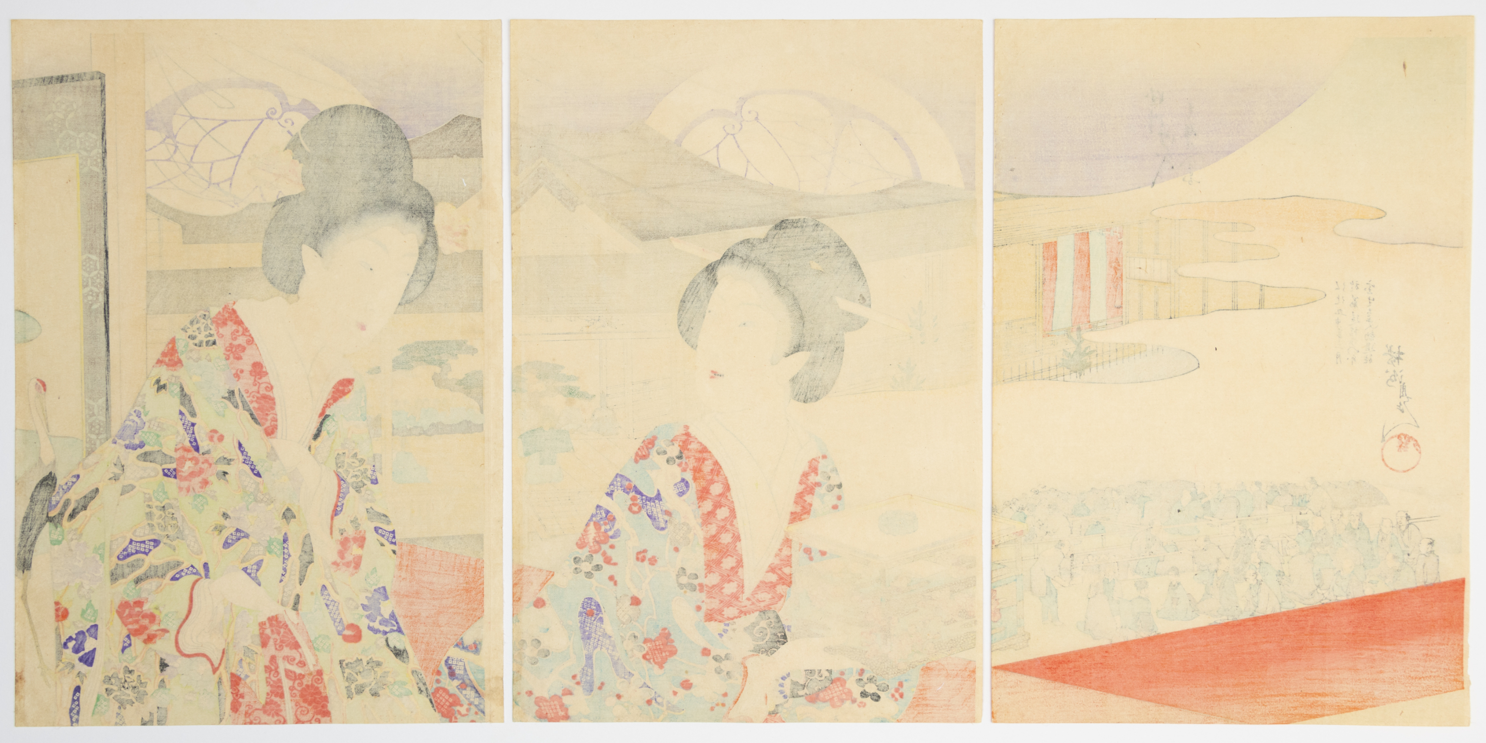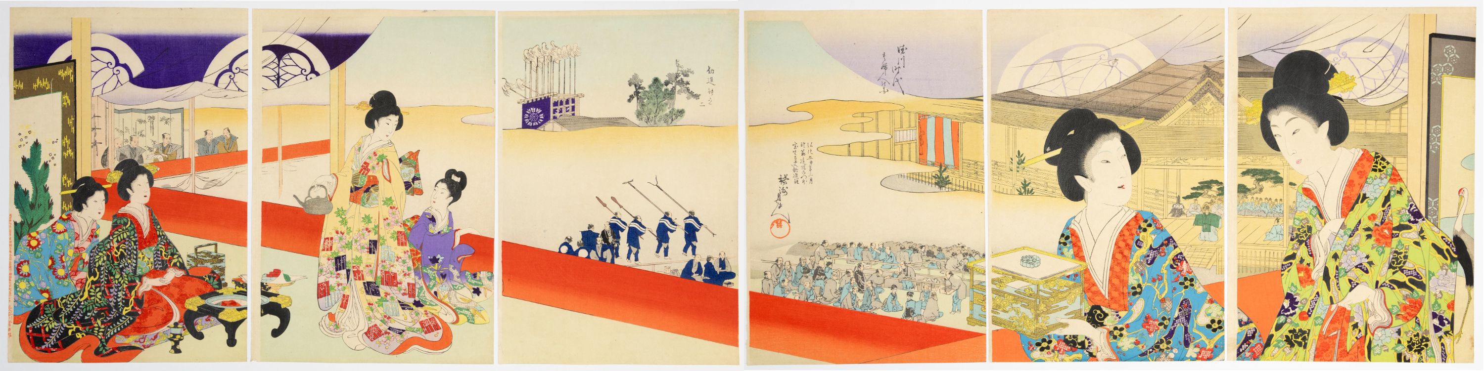 This set comprises six individual Japanese woodblock prints, likely forming two triptychs. Rendered in the Ukiyo-e style, consistent with the Edo or early Meiji period, the prints depict scenes with elegant figures, predominantly women in elaborate kimonos, within architectural settings and outdoor processions. Executed on paper, the prints showcase a once-vibrant color palette, now somewhat faded. Visible markings include kanji characters, possibly titles or inscriptions, and red seals on several panels.