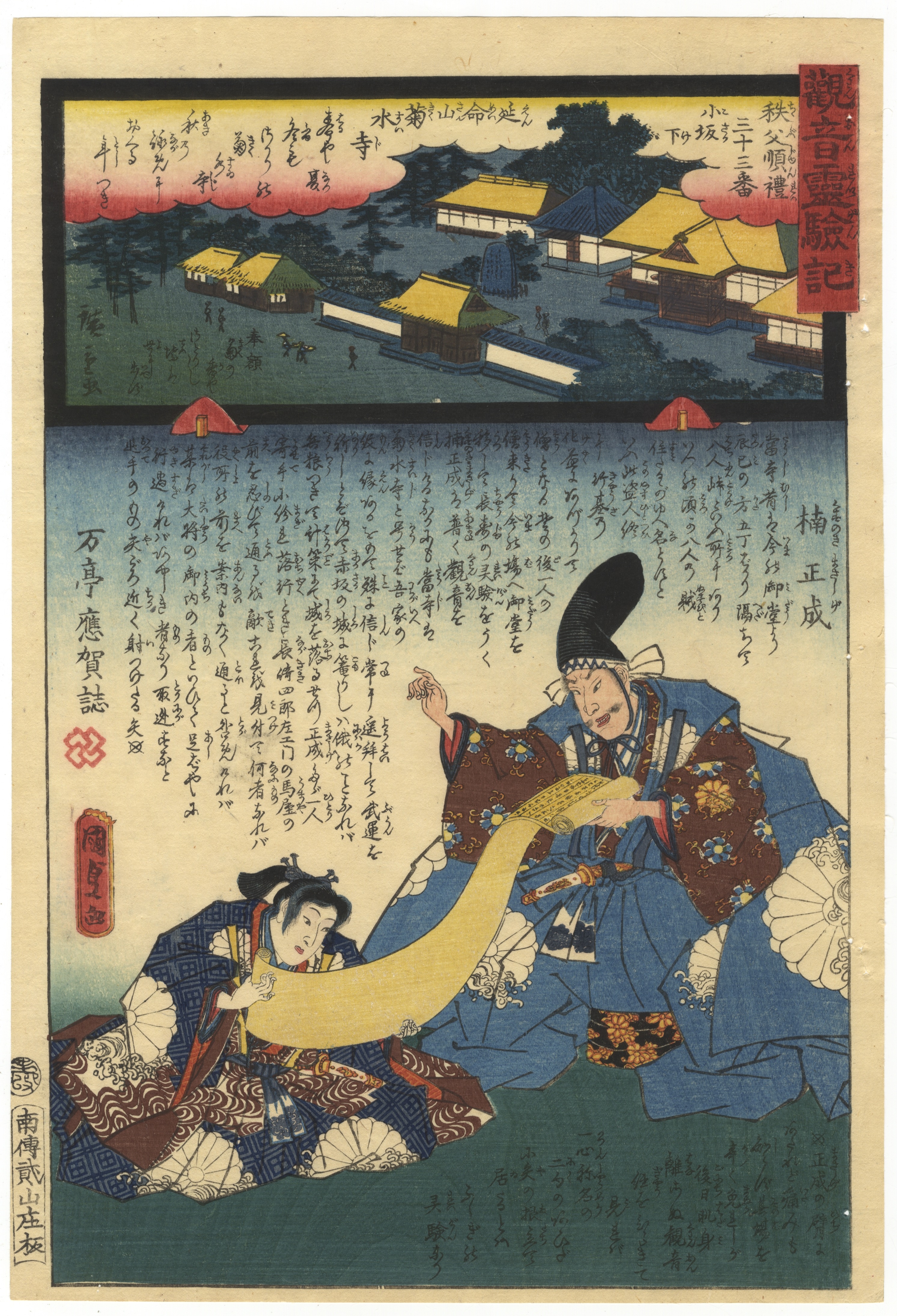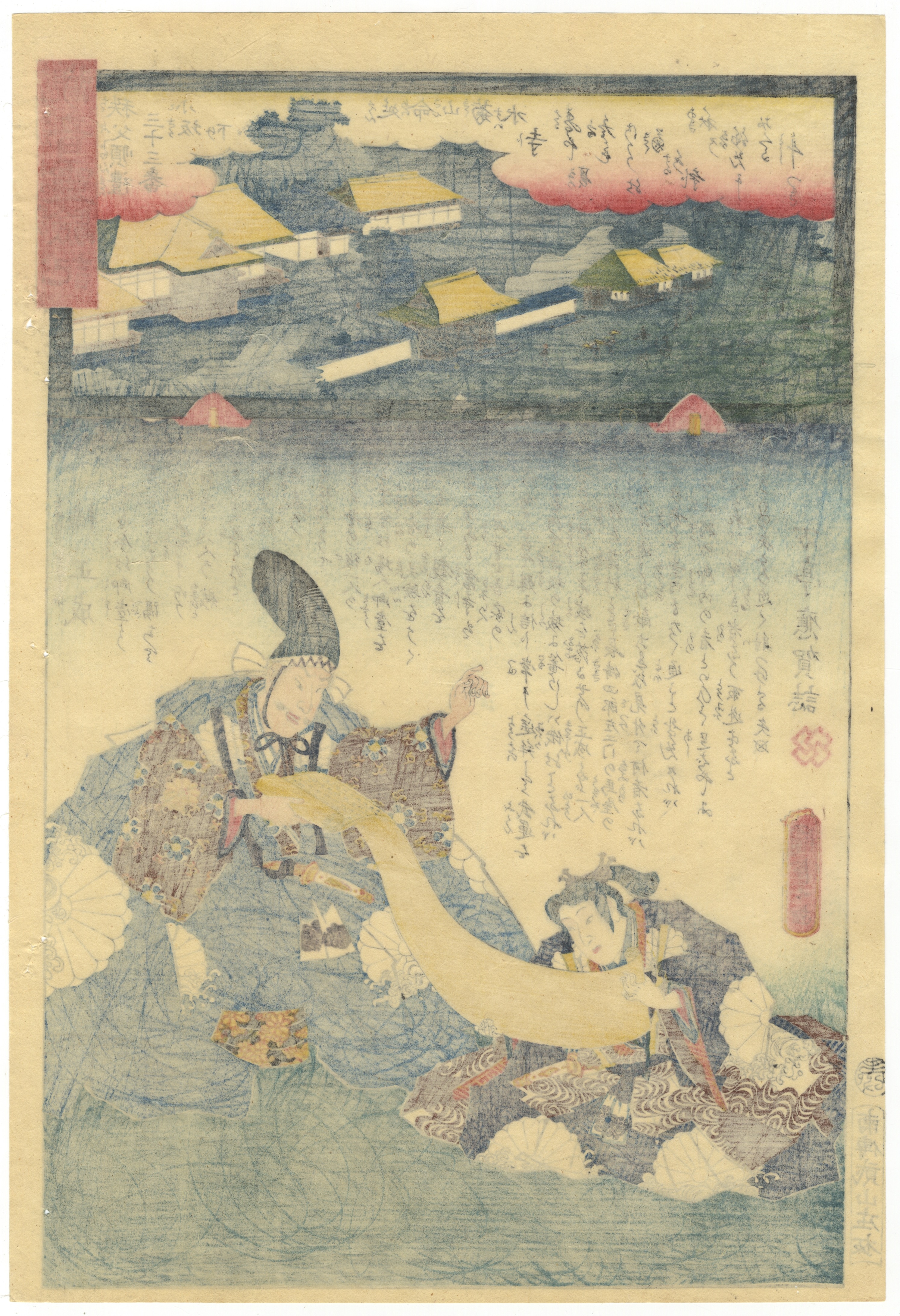A Japanese multi-color woodblock print, characteristic of the Ukiyo-e style, likely dating from the Edo or early Meiji period. The composition is divided, featuring a central scene of two figures in traditional attire – one seated adult holding a long, yellow textile or scroll, and another kneeling figure. An upper inset landscape depicts buildings nestled among trees under red cloud formations. Extensive Japanese text and calligraphic elements are present throughout, including a prominent red rectangular cartouche in the upper right corner, and various signatures or publisher’s marks visible in the lower left. The print exhibits typical woodblock printing techniques with visible key-block outlines.