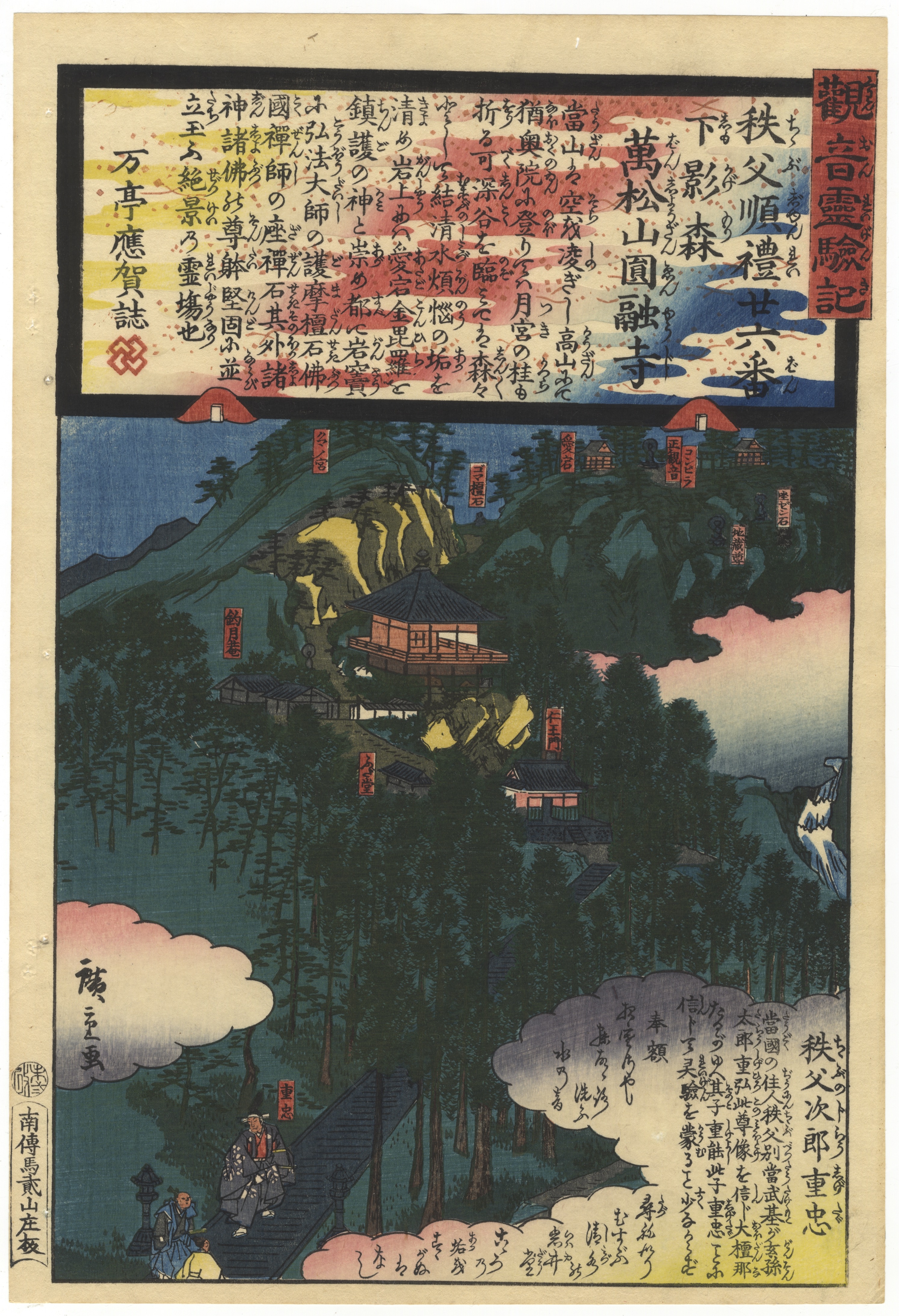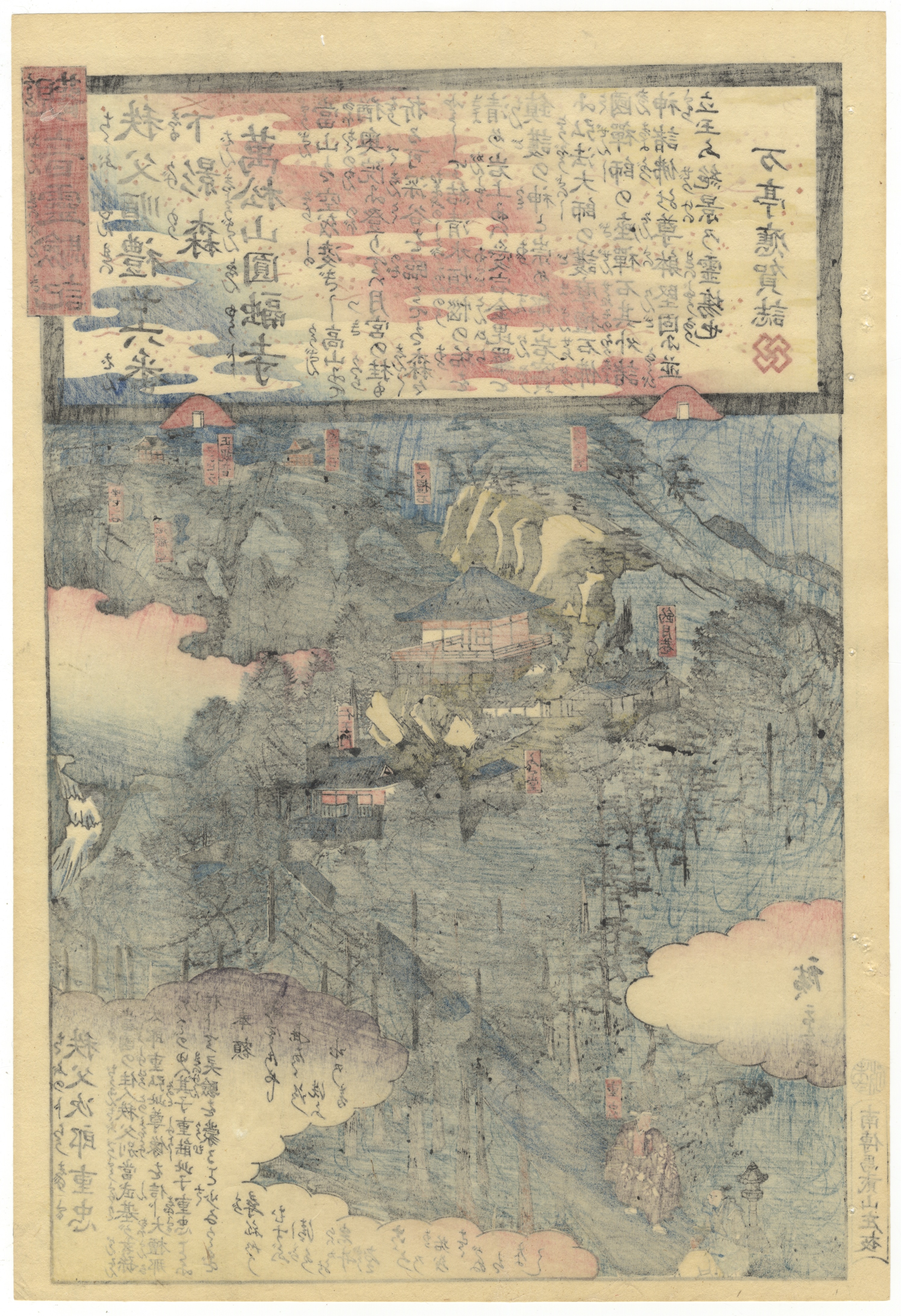 A multi-color Japanese woodblock print on paper, characteristic of the Ukiyo-e style, depicting a mountainous temple landscape with figures on a path. The print features a prominent title cartouche at the top, along with various smaller red seals and extensive Japanese text within cloud-like forms and other areas. A signature or publisher’s mark is visible in the lower left corner. Color bleed-through from the printing process is evident on the verso, consistent with the age and technique.
