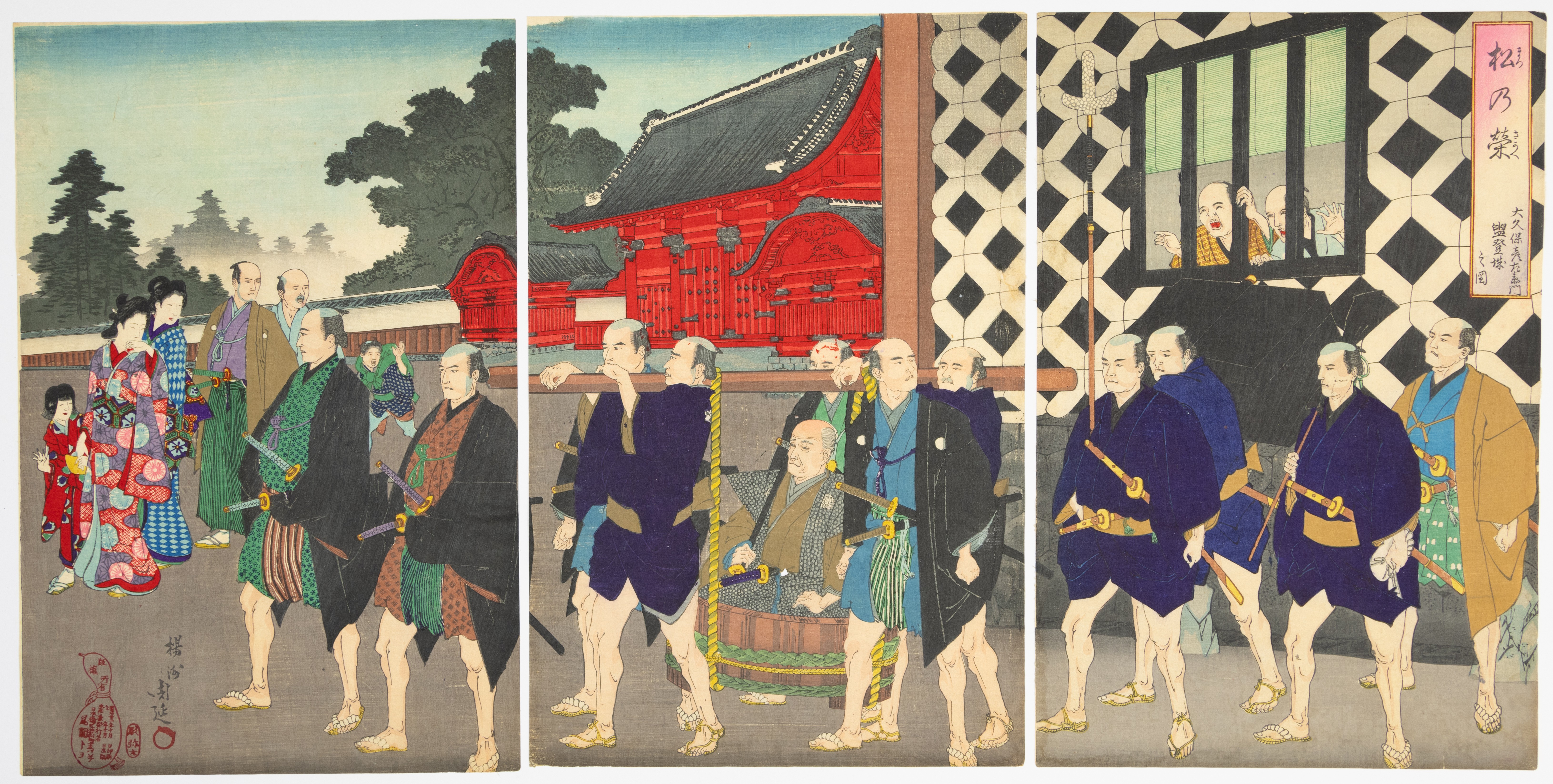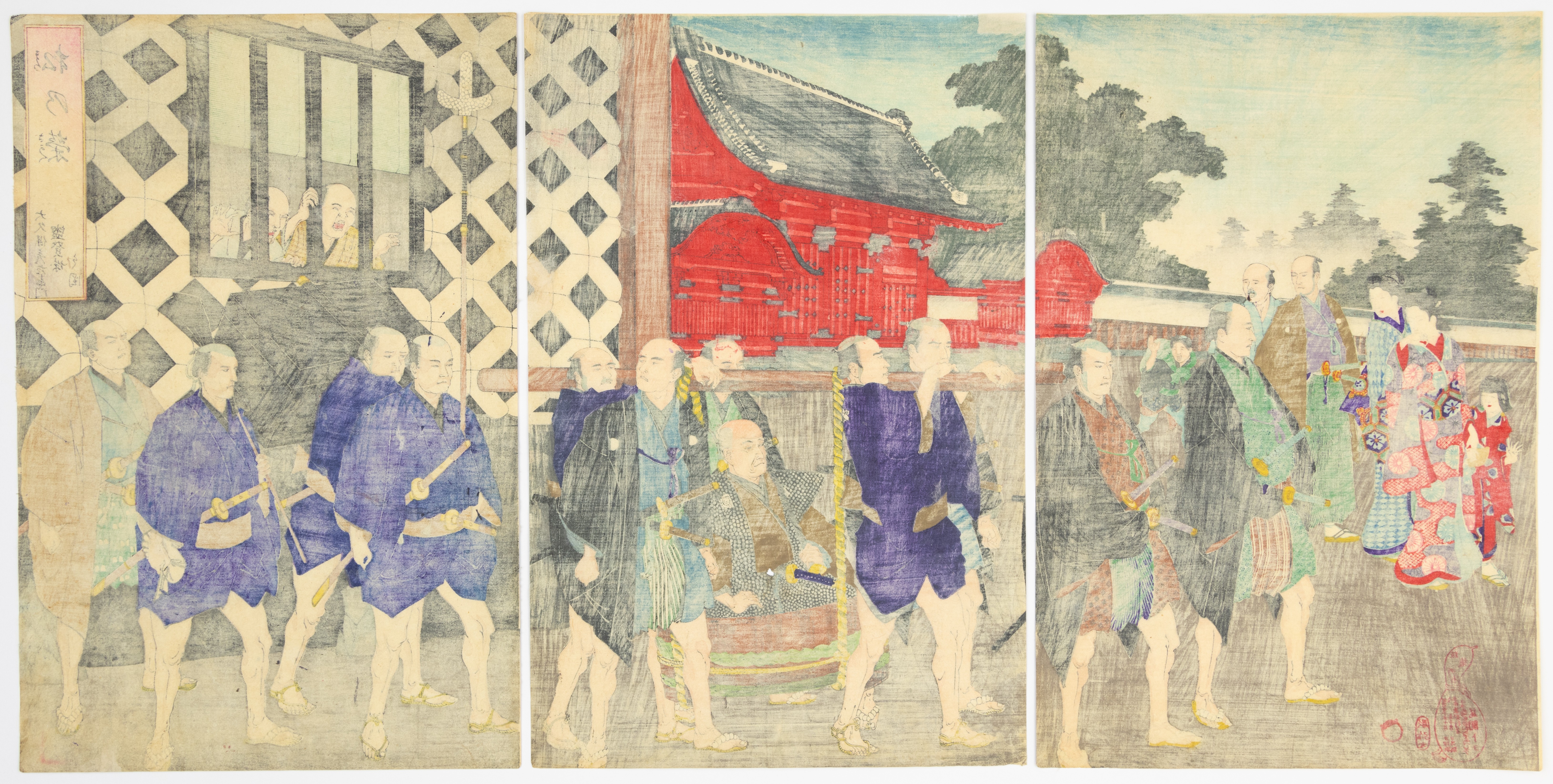 A Japanese Ukiyo-e woodblock print triptych on paper, characteristic of the late Edo or early Meiji period (19th century). The composition depicts a procession of figures, including samurai, women with a child, and a seated figure in a palanquin, set against a background featuring a large red temple or shrine. Visible markings include vertical Japanese text and a rectangular cartouche in the upper right of the rightmost panel, along with two red seals bearing Japanese characters in the lower left of the leftmost panel.