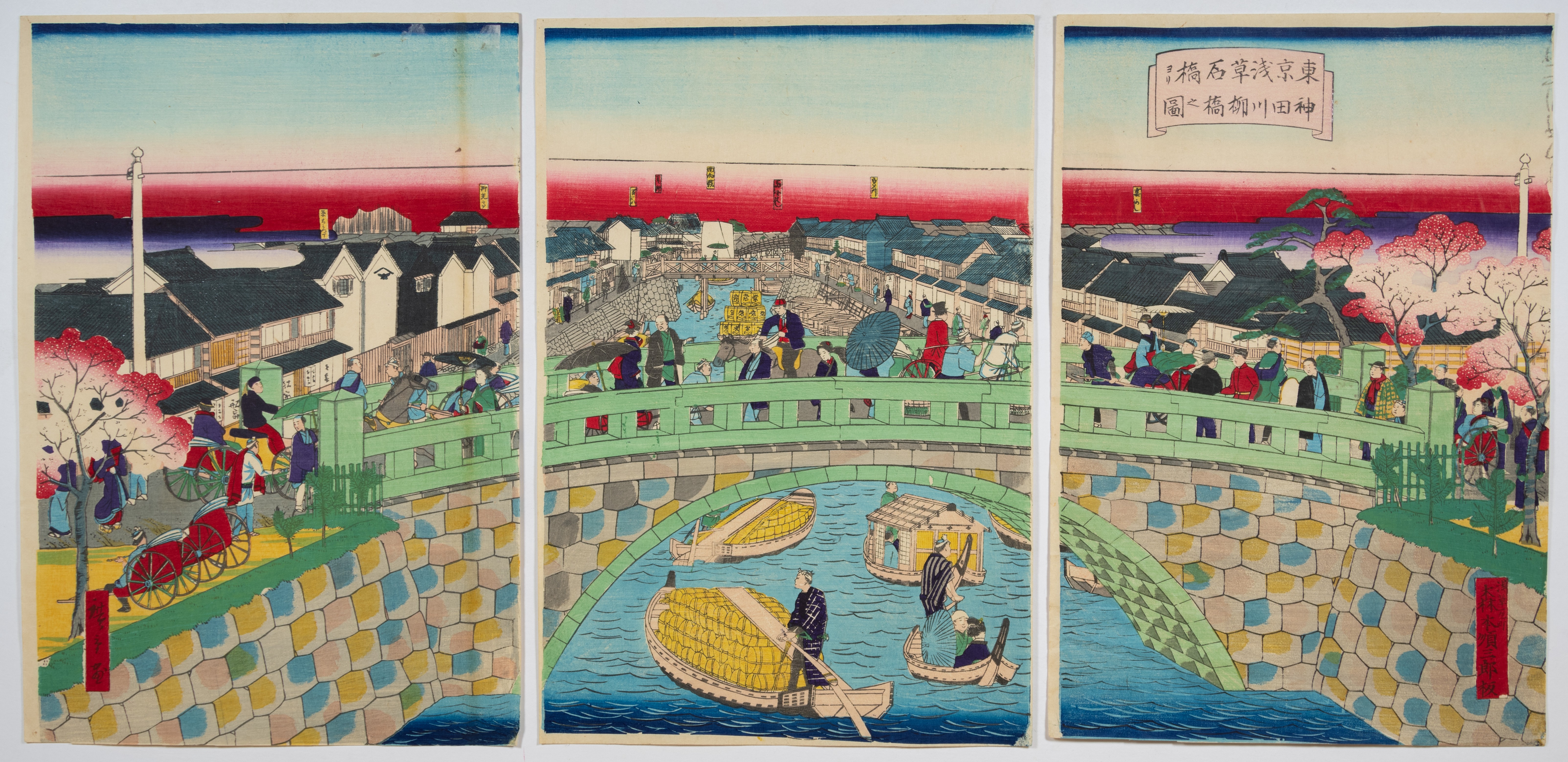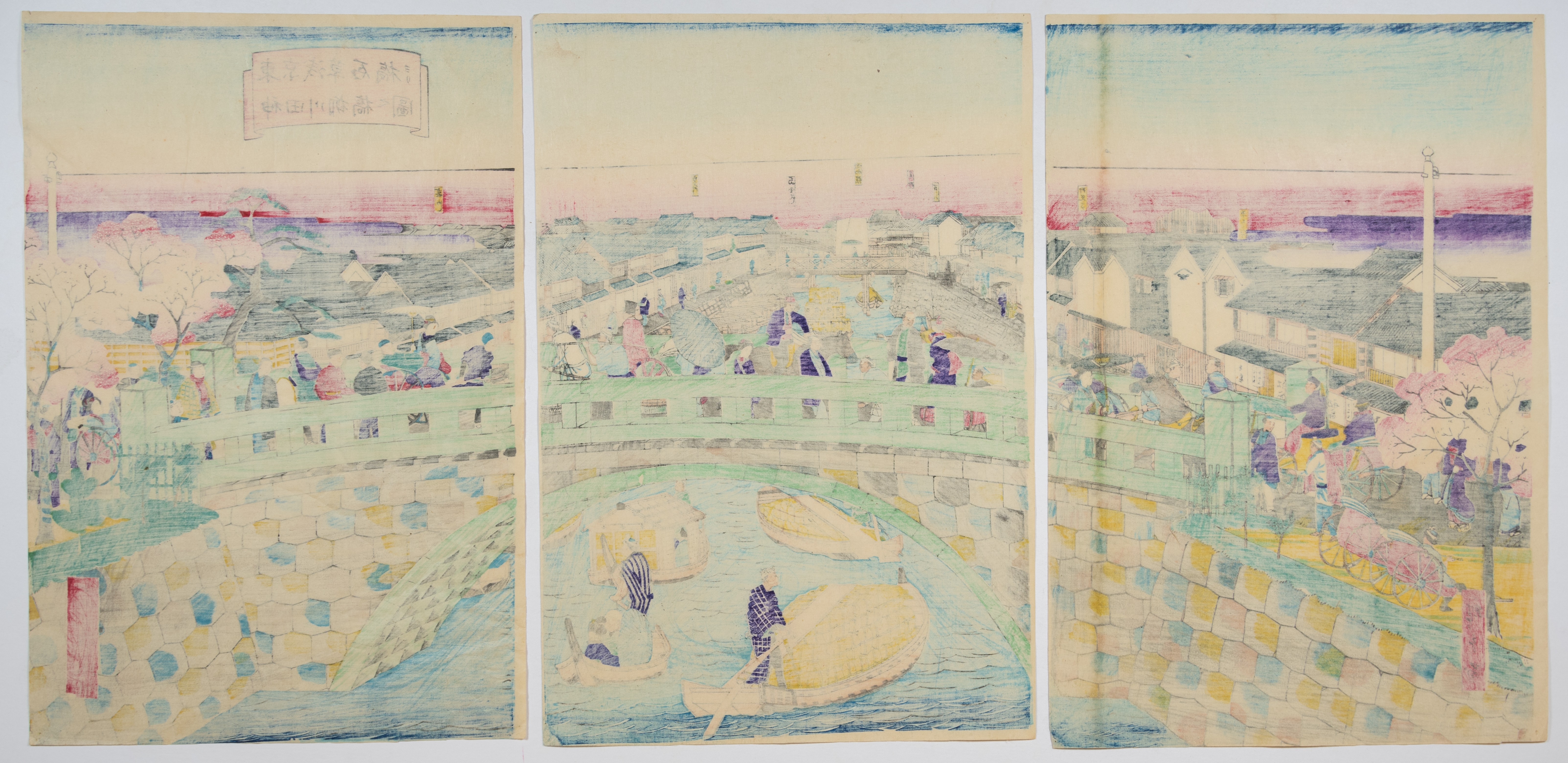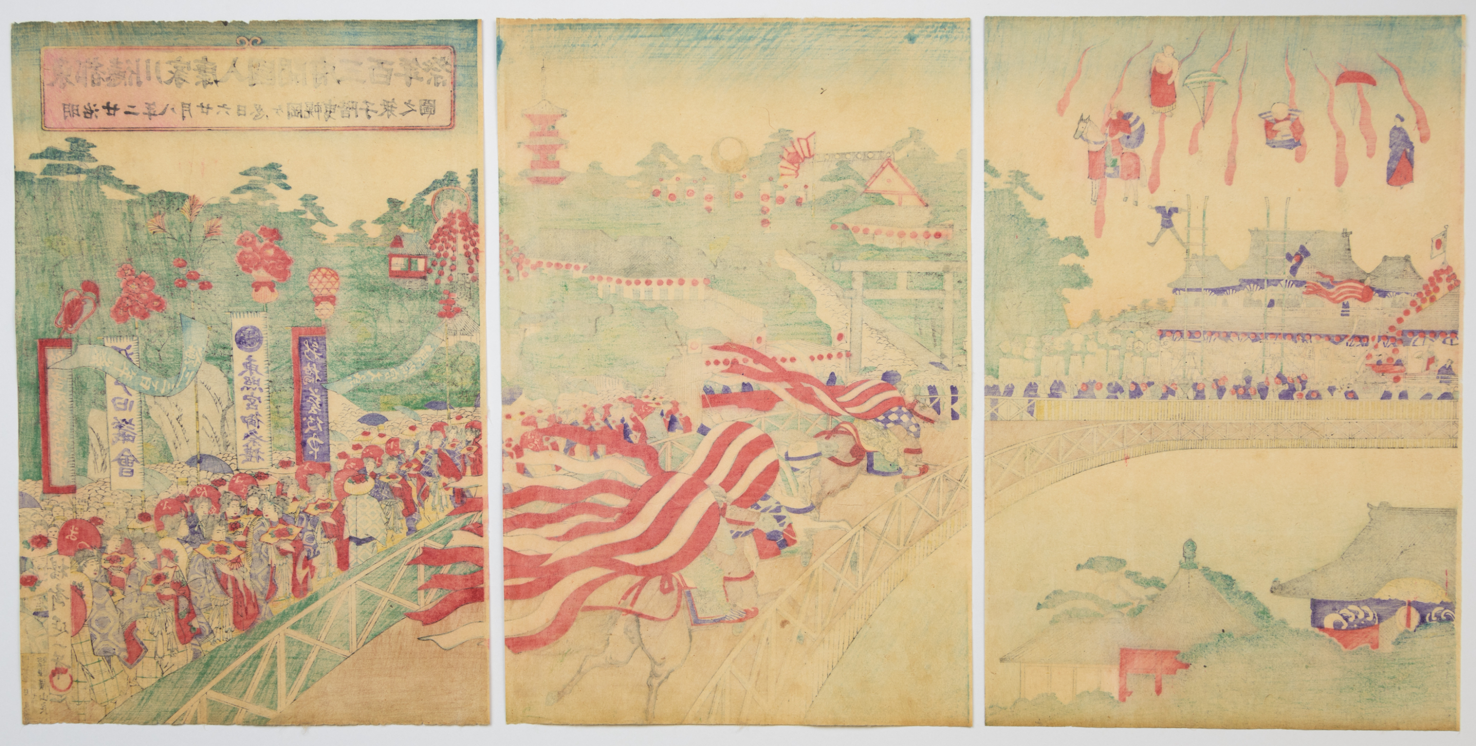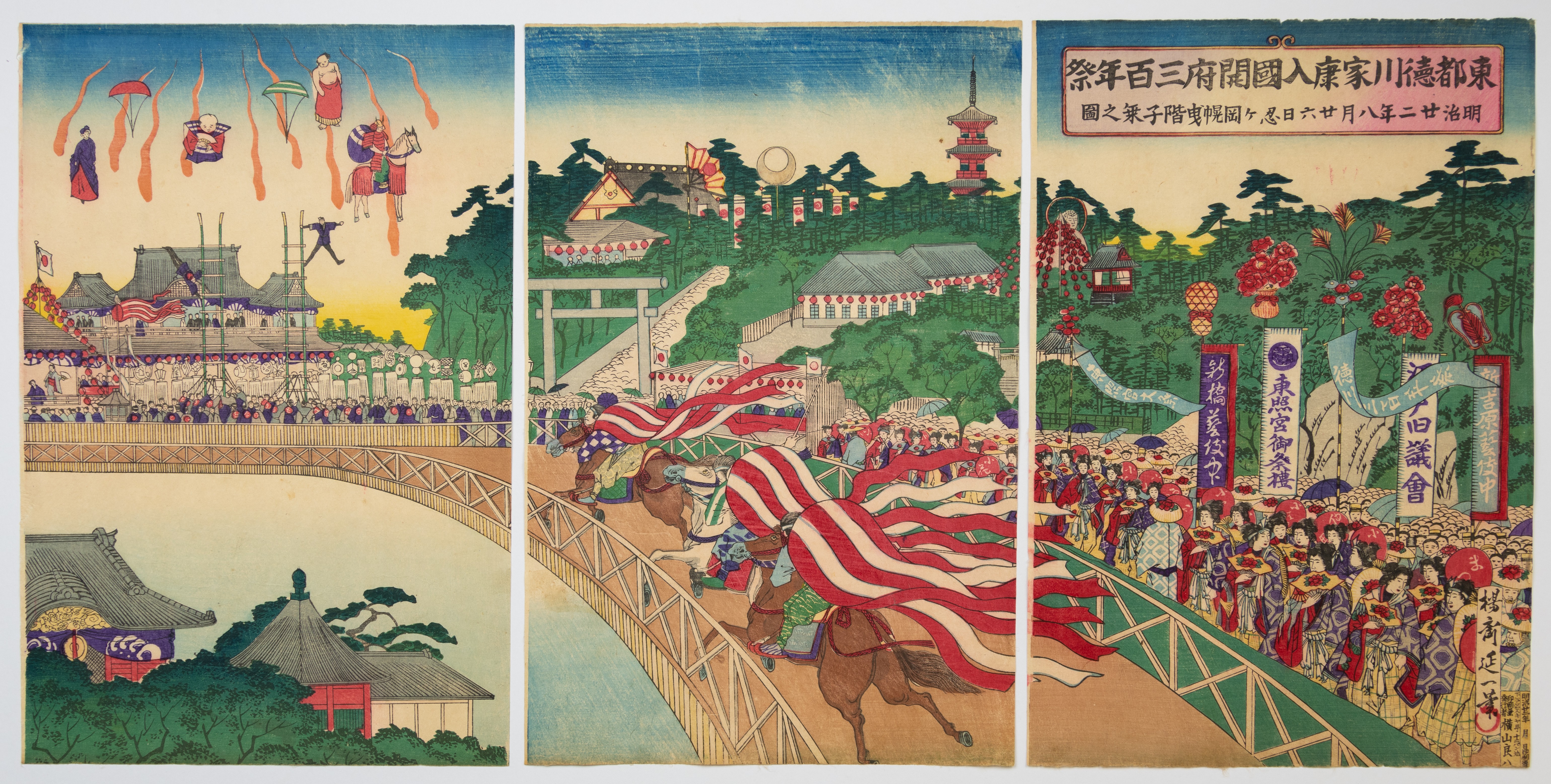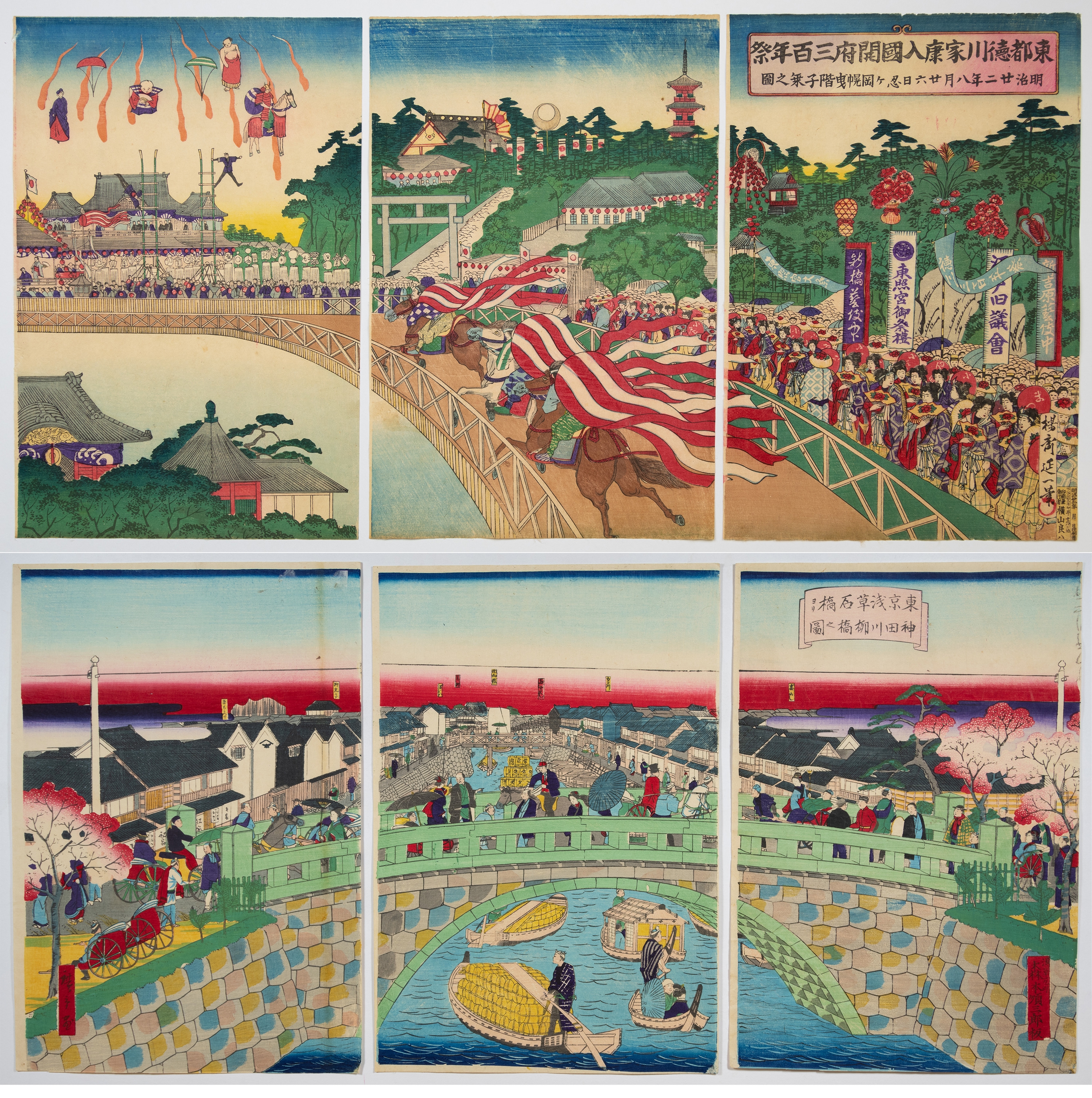 This lot comprises six Japanese woodblock prints, presented as two distinct triptychs, executed in the Ukiyo-e style. Each triptych depicts an expansive urban or ceremonial scene, characterized by bold outlines and a broad palette of colors. Japanese characters are visible in cartouches on the upper right panel of both sets, with one explicitly dated “Meiji 18th year, 8th month, 8th day” (1885), firmly placing them within the Meiji period. The prints are executed on paper.
