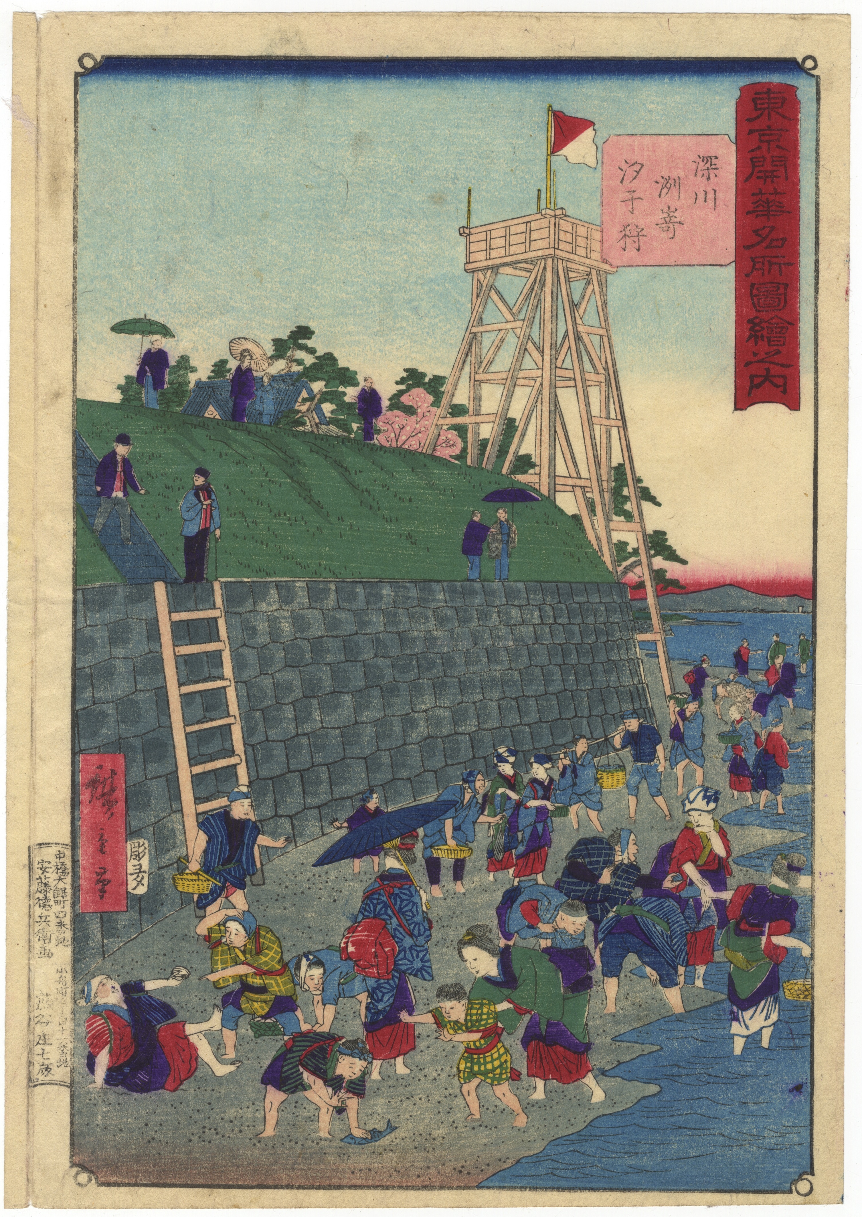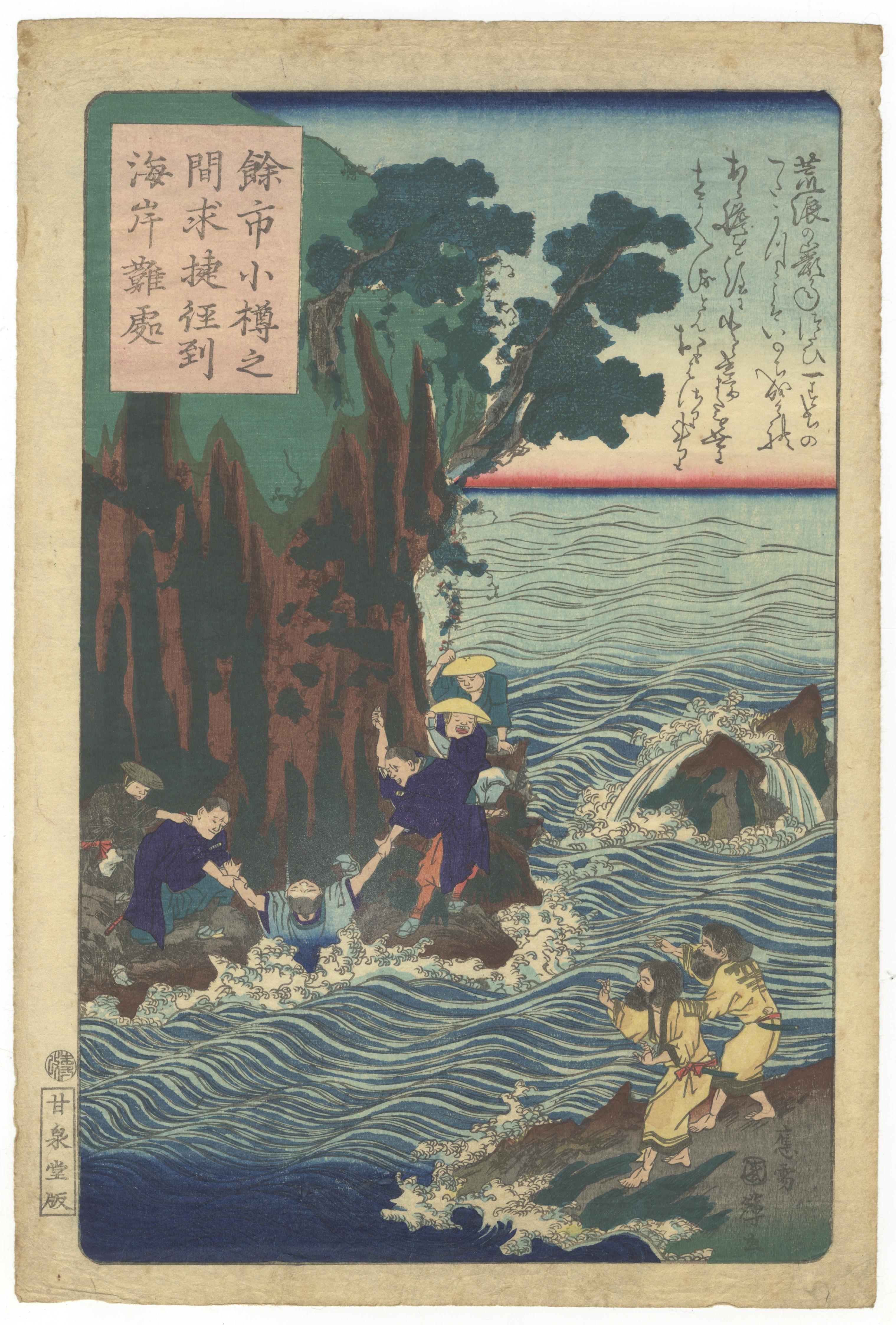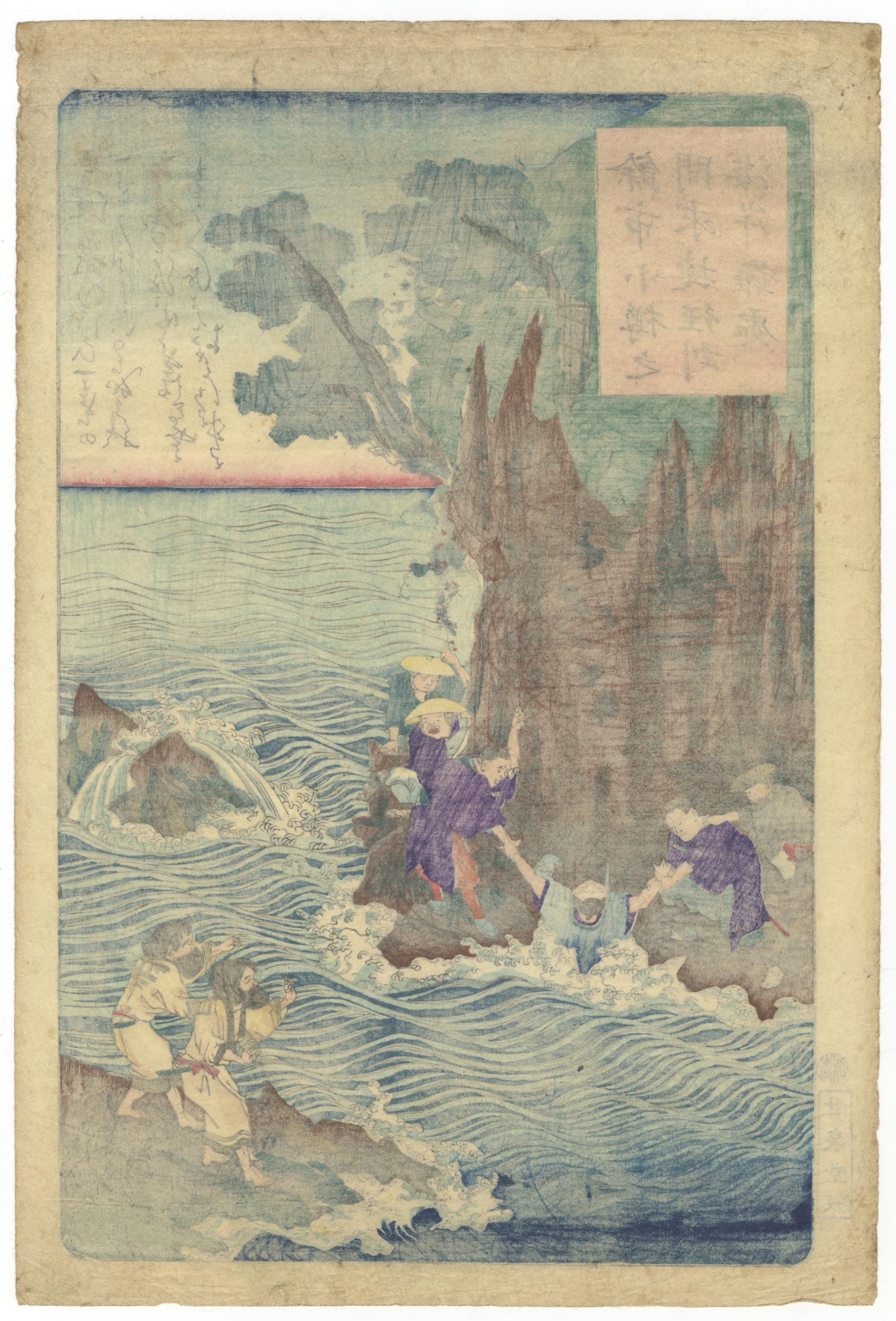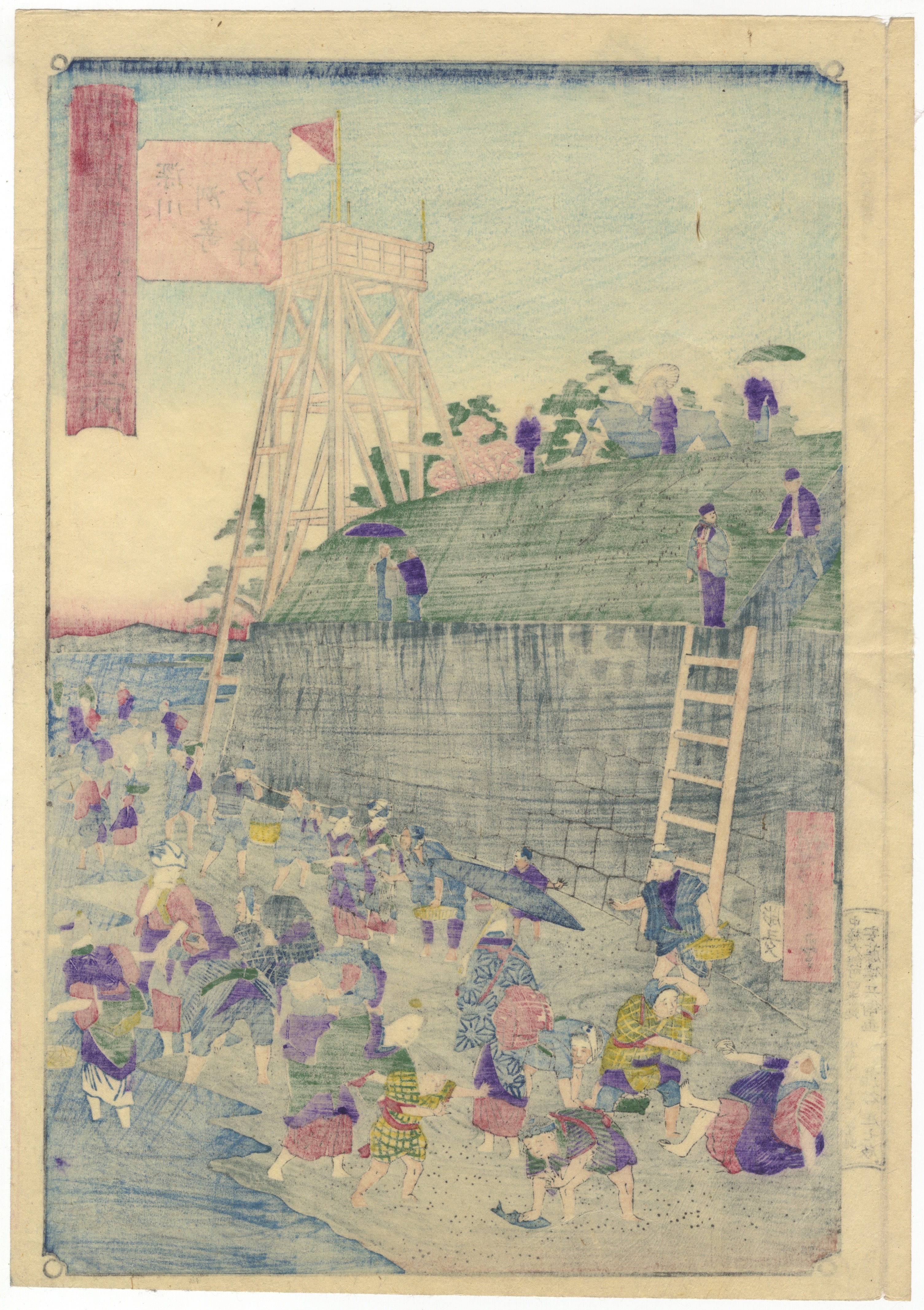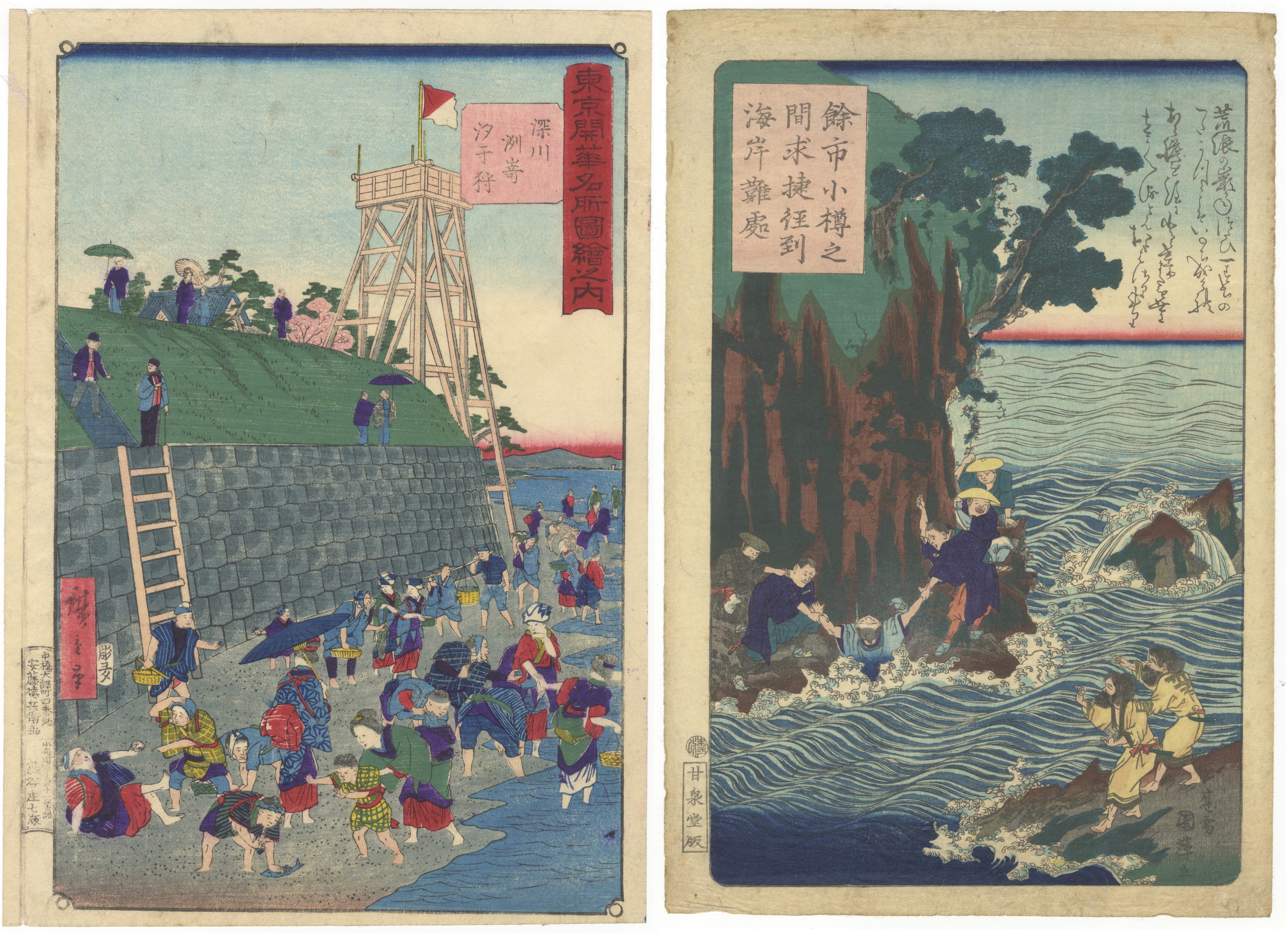 A pair of Japanese Ukiyo-e woodblock prints, likely dating from the Edo or Meiji period. The left print depicts a bustling waterfront scene with numerous figures, a stone wall, and a tall wooden structure, featuring Japanese text in a red vertical cartouche and a smaller text block. The right print illustrates figures interacting in turbulent coastal waters alongside rocky formations, marked with Japanese text in a pink vertical cartouche, an additional text block, and a publisher’s seal. Both prints exhibit the characteristic ukiyo-e style.