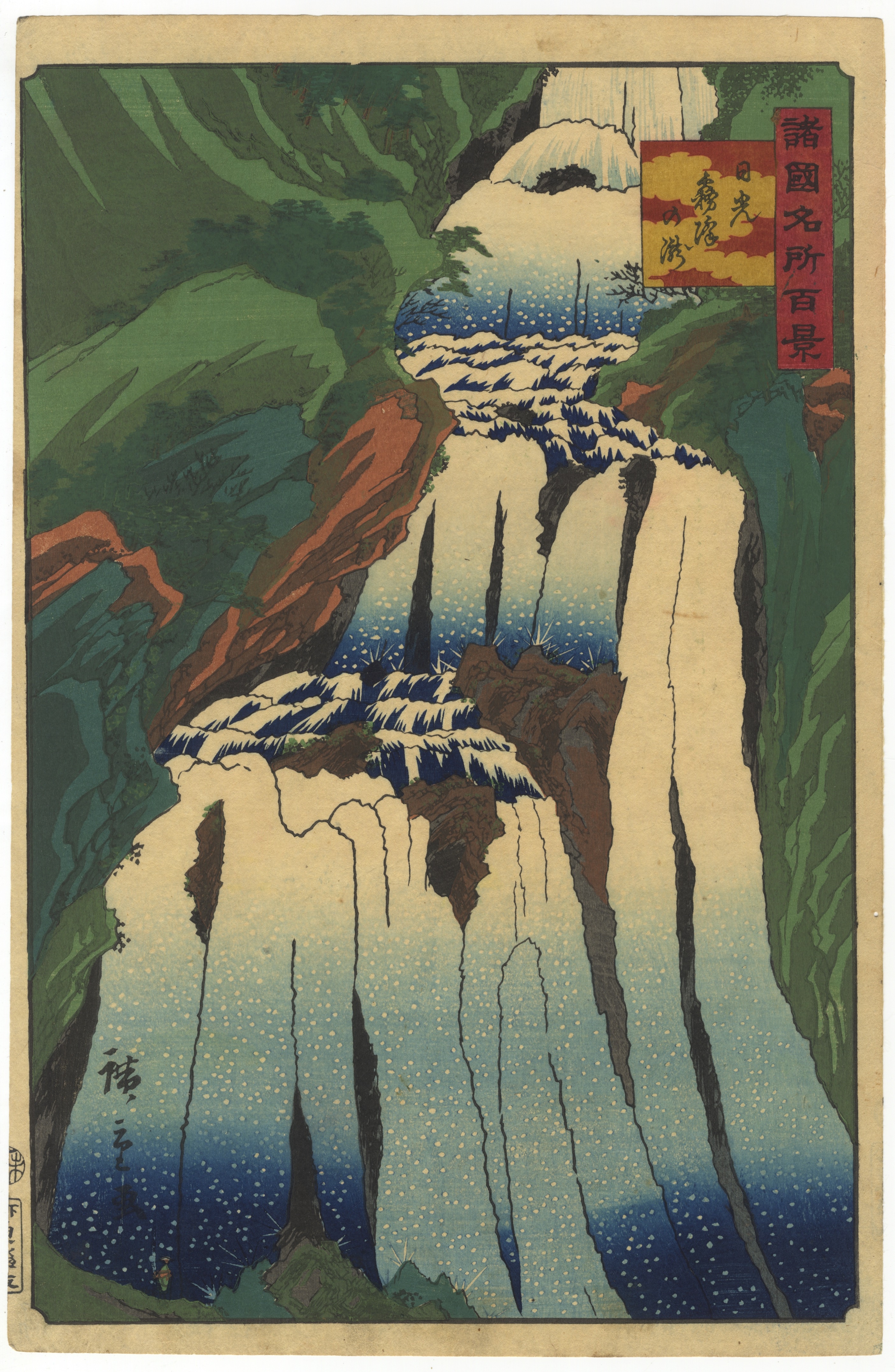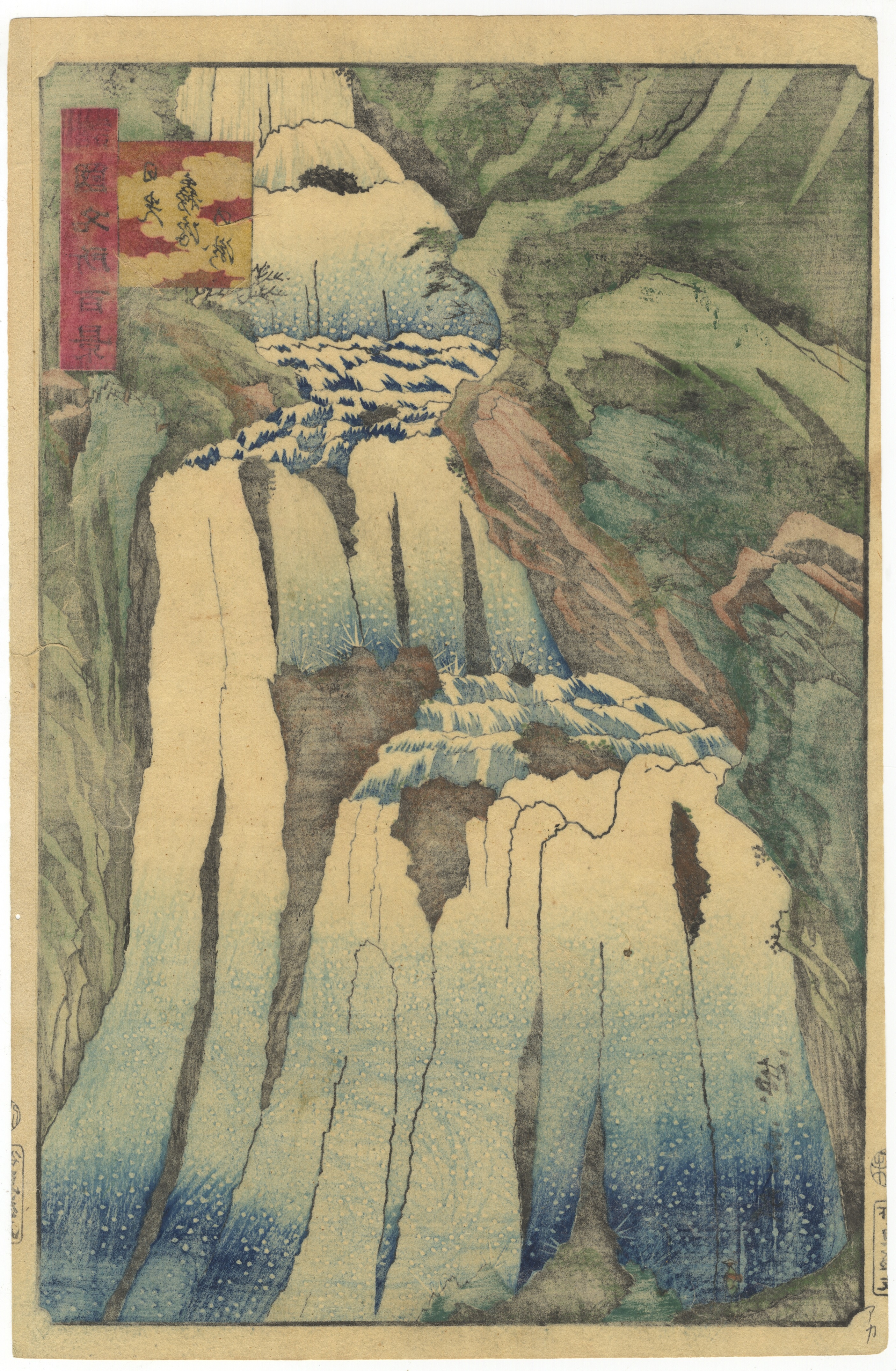 A Japanese Ukiyo-e woodblock print depicting a multi-tiered waterfall within a mountainous landscape. Visible markings include two superimposed cartouches with Japanese text in the upper right, a vertical signature or seal in the lower left corner, and additional vertical Japanese characters along the left margin.