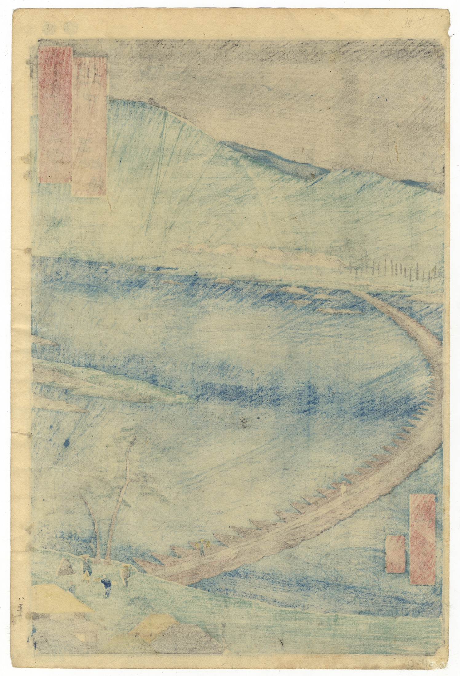 A polychrome Japanese woodblock print on paper, likely from the Ukiyo-e period, depicting a landscape with a long, curved bridge spanning a body of water, alongside distant mountains, trees, and small human figures. Visible markings on the recto include a large vertical red cartouche in the upper right, a smaller vertical red cartouche with text and what appears to be a signature in the lower left, and two small red seals in the top right corner. The verso shows characteristic bleed-through from the printing process and general surface soiling.