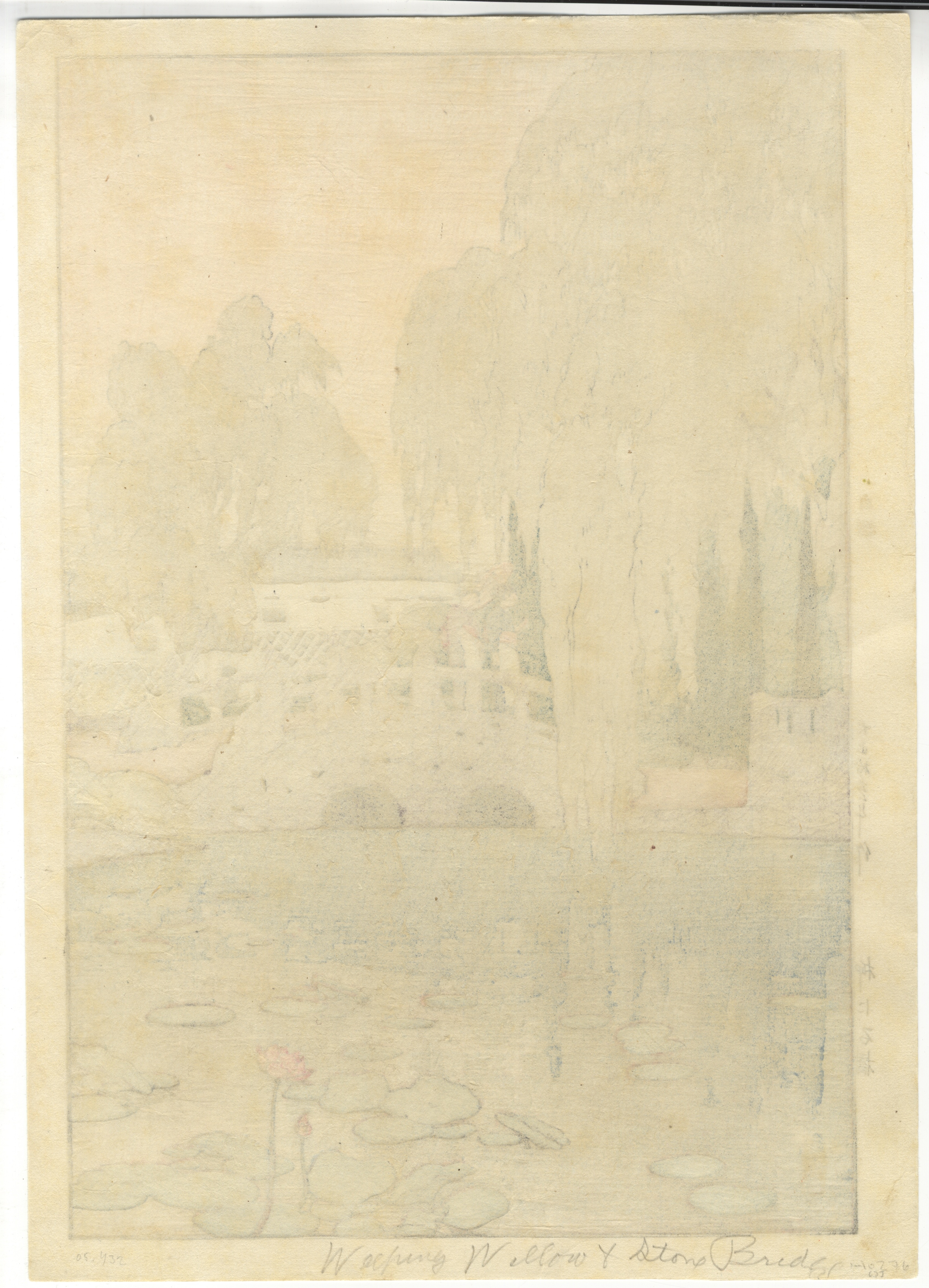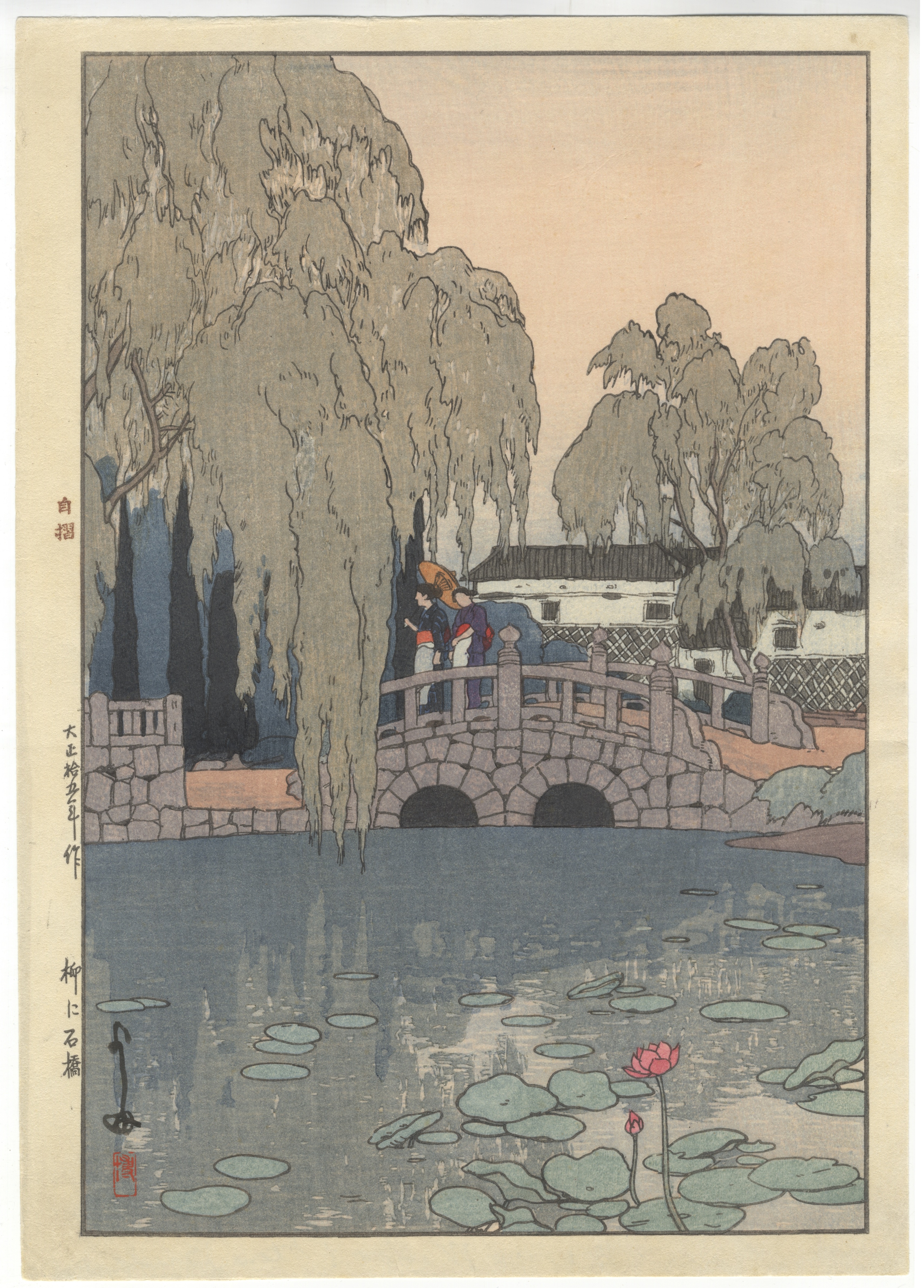 A Japanese color woodblock print by Kawase Hasui, depicting a landscape scene. The composition features a stone arch bridge with two figures, a large weeping willow tree dominating the left side, distant buildings, and a foreground pond with lily pads and a blooming lotus flower. The print is executed on paper using a multi-color woodblock technique with a subdued palette. Visible Japanese text along the left margin includes the date “大正八年” (Taisho 8th year), which corresponds to 1919, the artist’s signature “川瀬巴水作” (Kawase Hasui saku), and the title “柳に石橋” (Willow and Stone Bridge). Two red seals, presumed to be artist’s seals, are present on the print’s surface. The reverse side shows faint pencil inscriptions “Weeping Willow & Stone Bridge” and “50-484”.