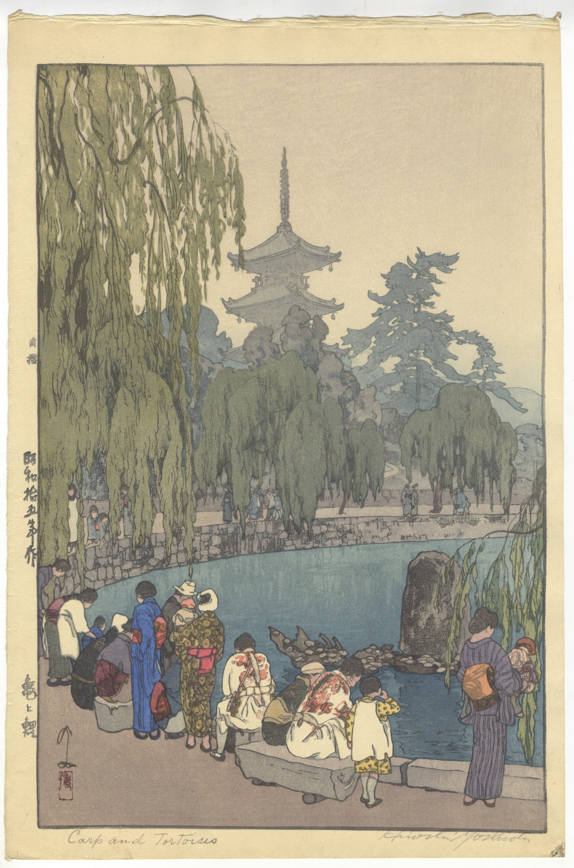 A Japanese Shin-hanga woodblock print by Hiroshi Yoshida, titled ‘Carp and Tortoises’. The print depicts a serene outdoor scene with figures observing a pond, a large weeping willow, and a multi-tiered pagoda in the background. Printed on cream-colored paper. Visible markings include vertically oriented Japanese characters and a red seal on the left margin, along with the English title ‘Carp and Tortoises’ and the English signature ‘Hiroshi Yoshida’ at the bottom edge. Dating to the Shōwa period, indicated by the visible character `昭和`.