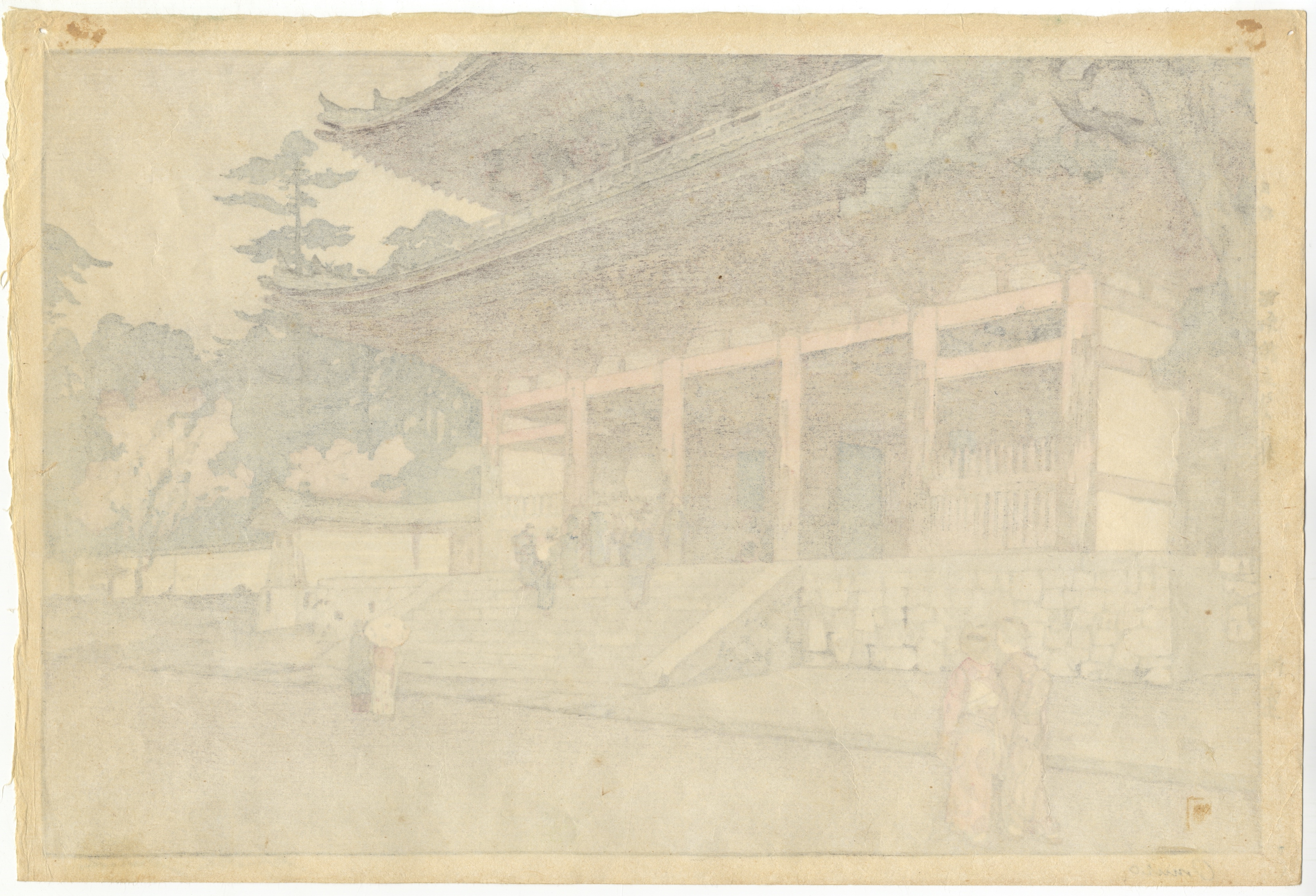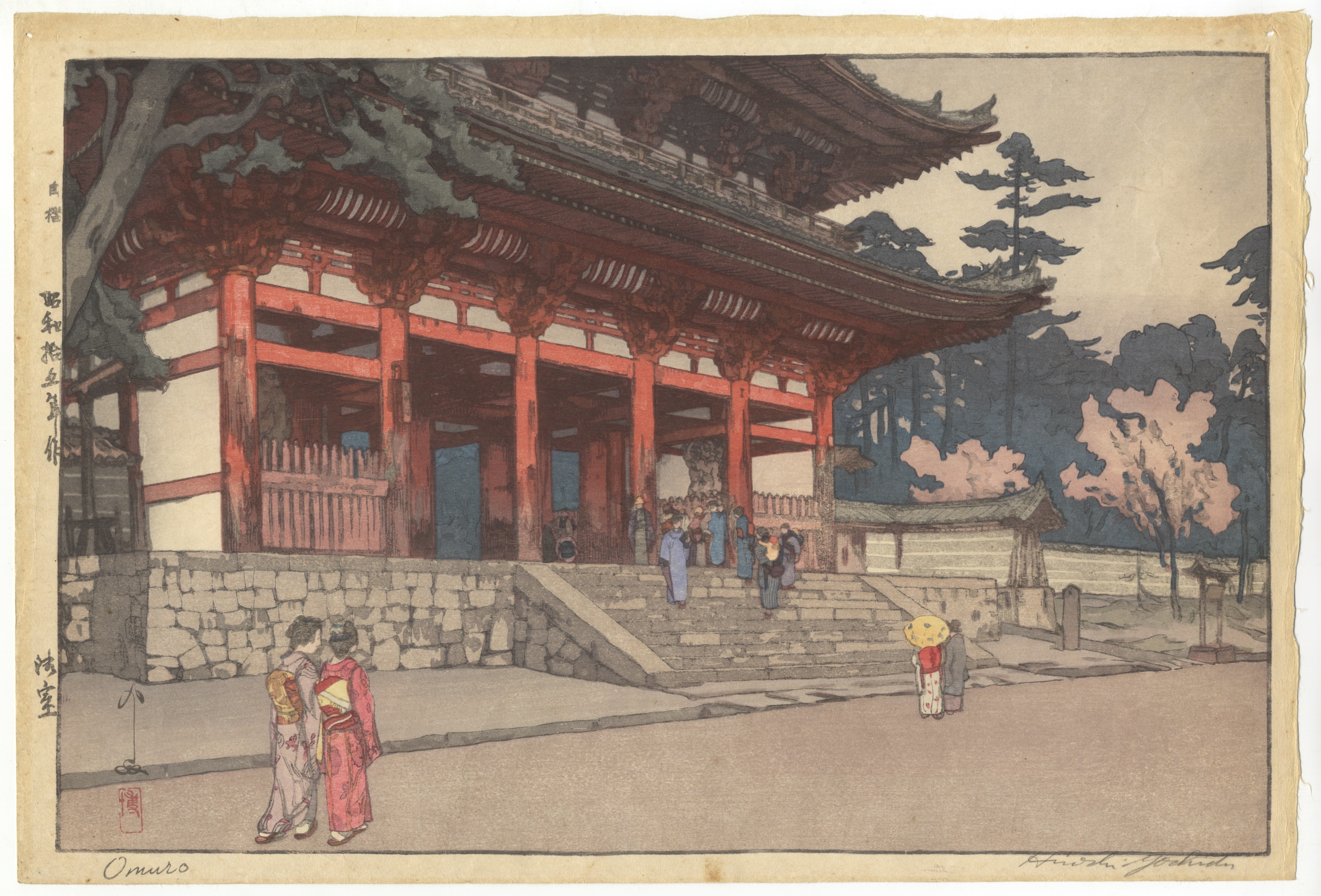 A multi-color woodblock print on paper, depicting a large, multi-tiered traditional Japanese building with prominent red pillars, set on a stone foundation, flanked by trees, and featuring several figures in traditional attire. The printing style is characteristic of traditional Japanese printmaking, with crisp lines and layered inks. Visible markings include Japanese characters along the left margin and next to a signature at the lower right, a red artist’s or publisher’s seal in the lower left, and Romanized text reading “Omuro” and “Hiroshi Yoshida” in the lower margin.
