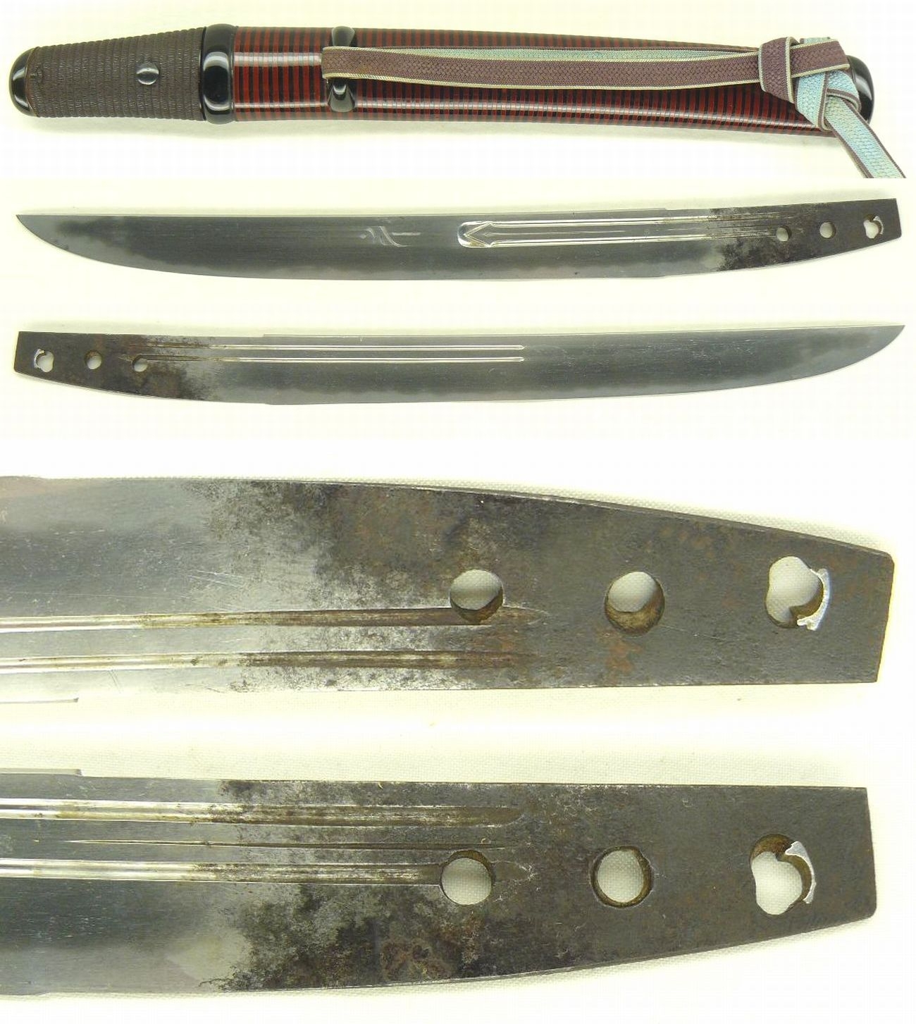 The blade exhibits notable surface rust, pitting, and general wear consistent with age. The koshirae shows general wear consistent with use. The accompanying document shows signs of multiple folds and minor creases.