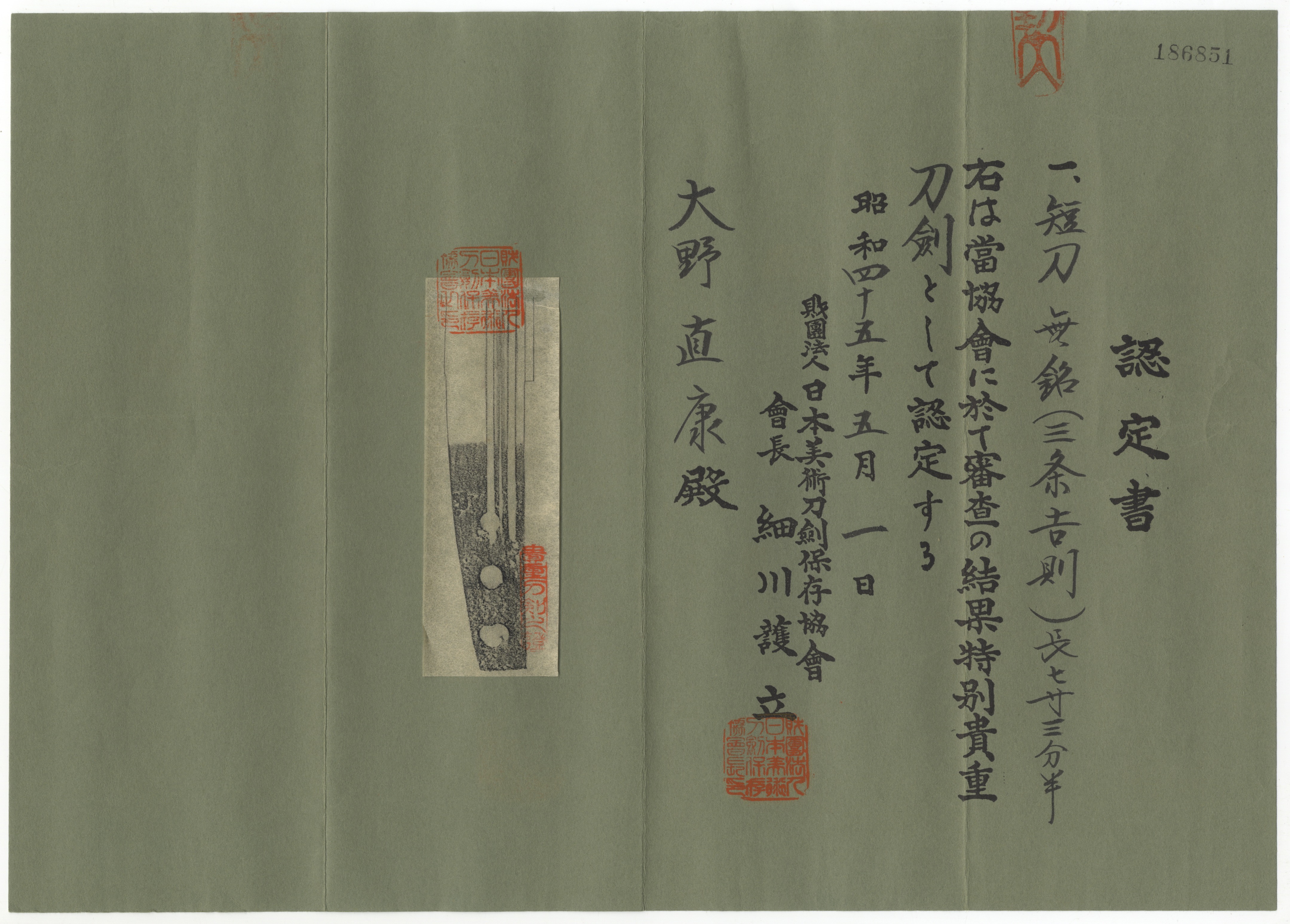A Japanese sword blade, identified as a tanto, accompanied by its koshirae and a certification document. The metal blade features a curved profile, a single edge, and a visible temper line (hamon). The tang (nakago) has multiple holes (mekugi-ana) and visible, unreadable kanji markings. The koshirae includes a lacquered wooden saya (scabbard) with segmented red and black coloring. The tsuka (handle) is wrapped in a dark material over what appears to be ray skin, adorned with a braided cord (sageo) attached to the saya. The accompanying light green paper document is densely covered in Japanese script, bears several red ink stamps (hanko), and includes a small diagram of a sword tang. It is marked with the serial number ‘186851’ and is identified as an NTHK Kanteisho (certification paper), attributing the blade to Sanjo Yoshinori and dated Showa 45 (1970).