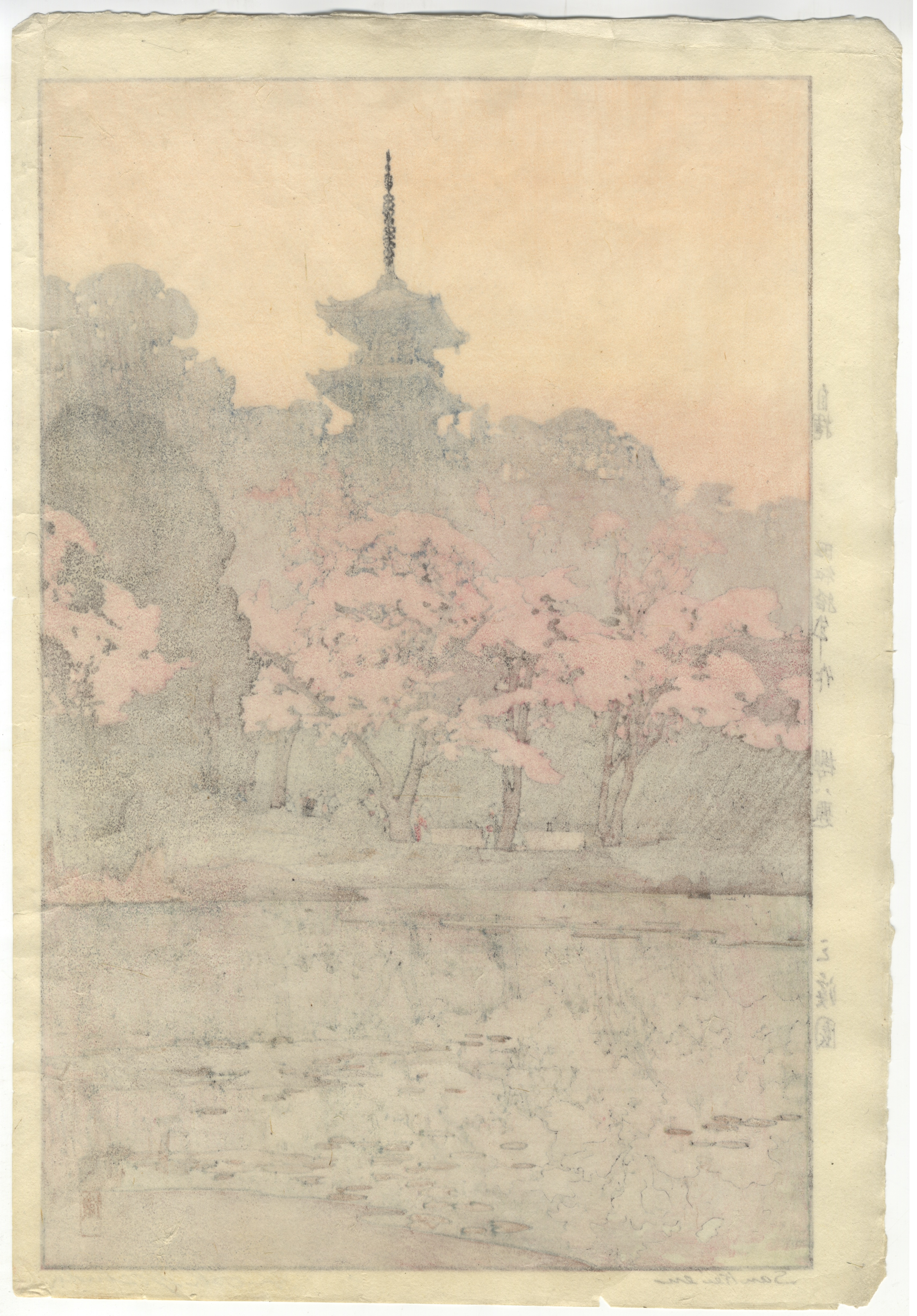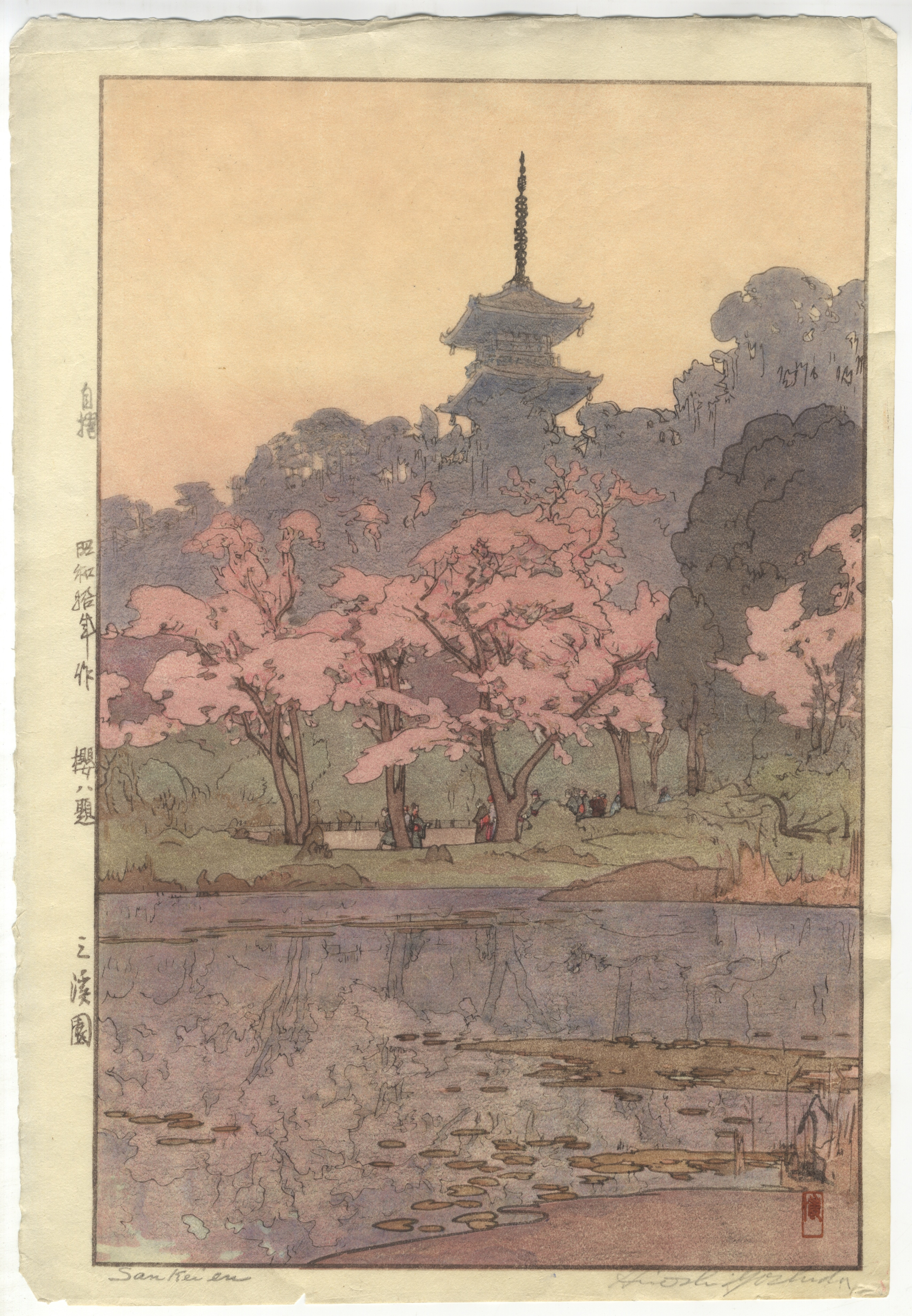 A Japanese woodblock print, likely in the Shin-hanga style, depicting a landscape scene featuring a multi-tiered pagoda nestled among trees, prominent pink-blossomed cherry trees, and a reflective body of water in the foreground with lily pads and small human figures. The color palette is composed of soft pastels. Visible markings include a vertical column of Japanese characters on the left margin, a red artist’s seal in the lower right corner, and handwritten English text reading “San Kei-en” and “Hiroshi Yoshida” below the image. The print is on paper.