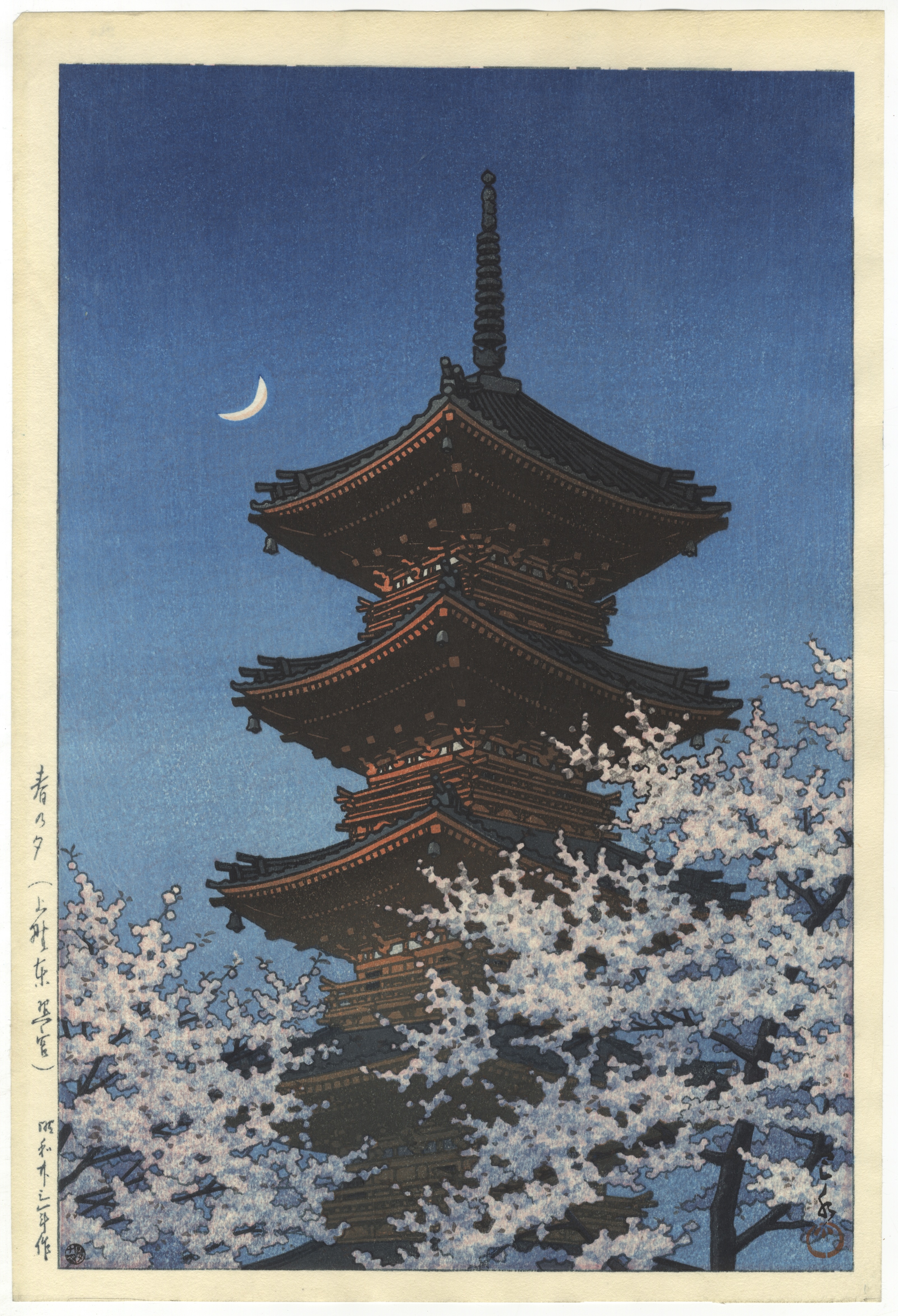 A Japanese woodblock print, executed in a traditional illustrative style, depicting a five-story pagoda framed by white cherry blossoms against a deep blue, moonlit sky. The image is rendered with multi-colored inks on paper. Visible markings include vertical Japanese script along the left margin, likely comprising a signature, date, and/or publisher’s mark, and a small red seal in the lower right.