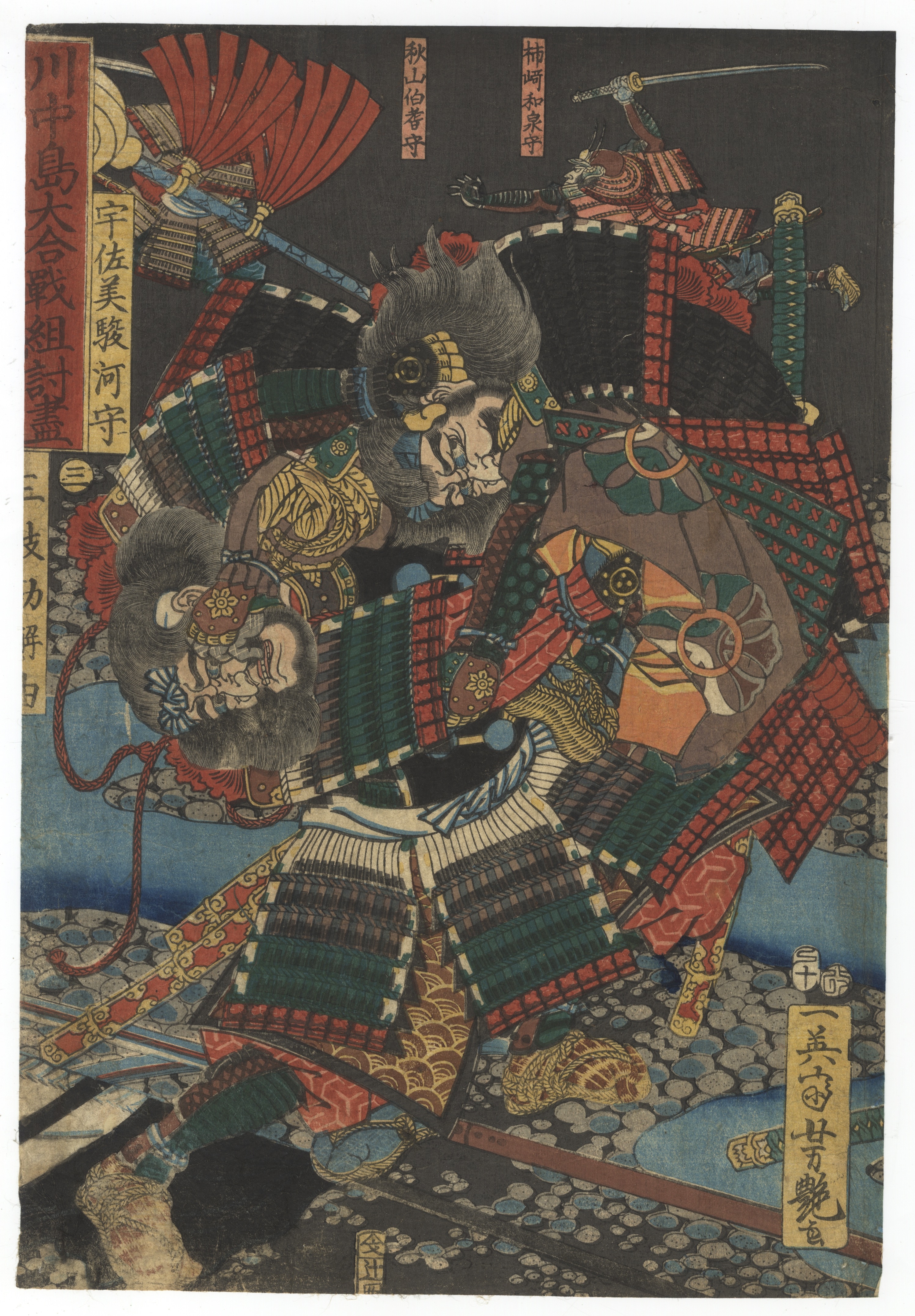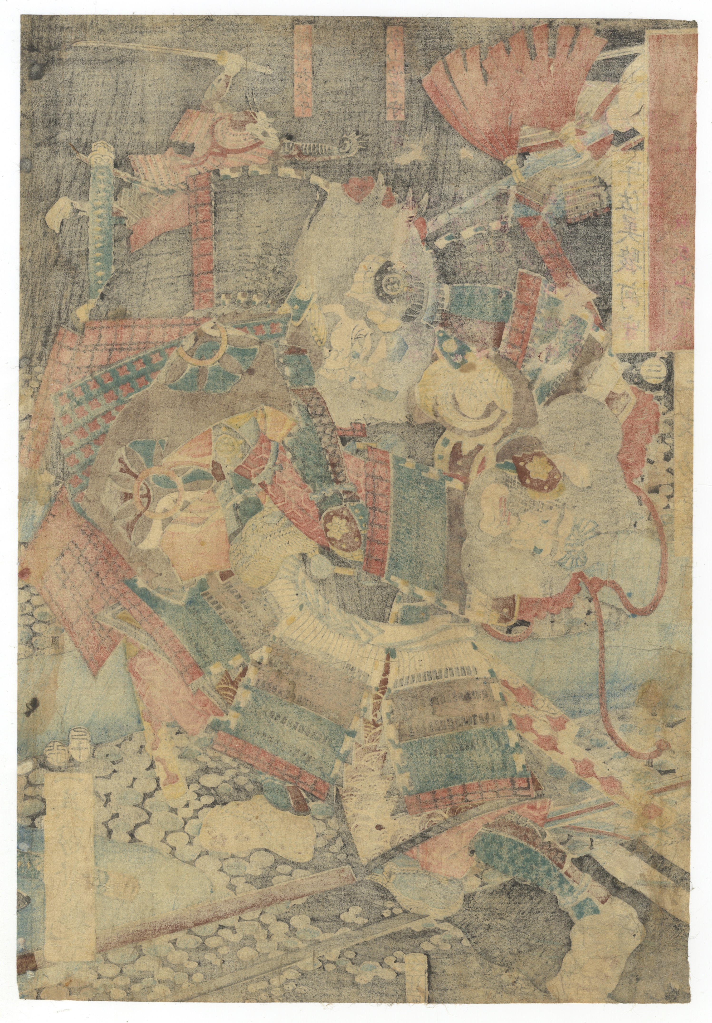 A Japanese ukiyo-e woodblock print, executed in ink on paper, depicting a dynamic, multi-figure combat scene. The composition features samurai warriors in elaborate armor and traditional attire, one wielding a sword and another a war fan. The print is characterized by strong outlines and color blocks. Japanese script is present in vertical columns along the left and top margins, and within the lower right of the composition in a rectangular cartouche.